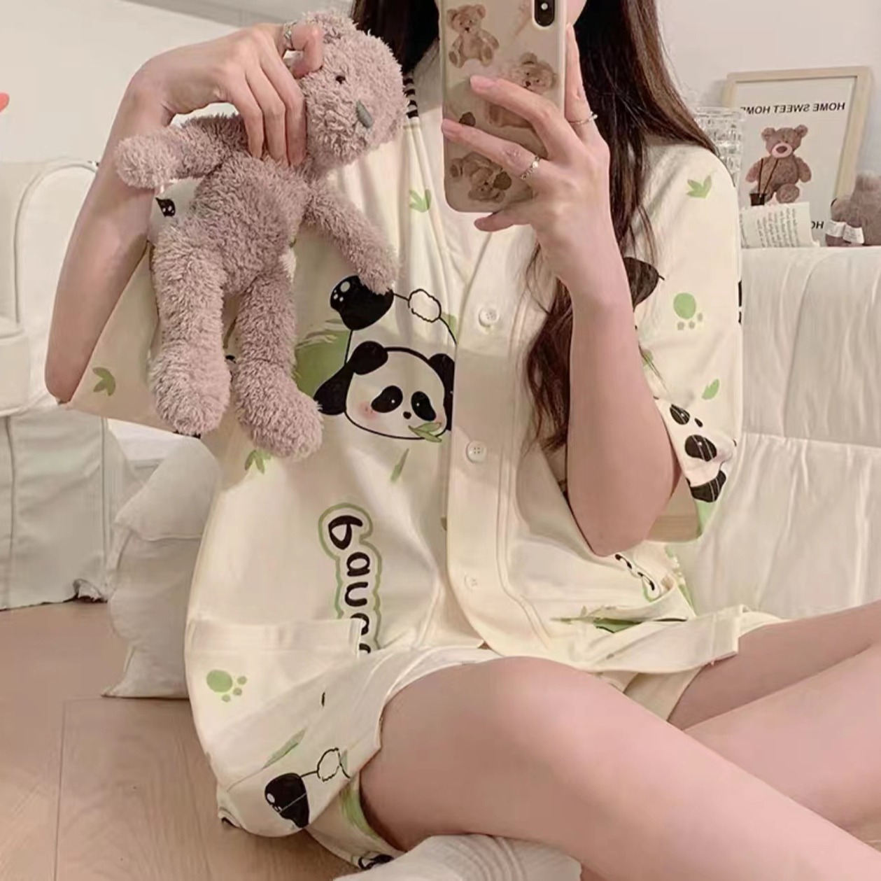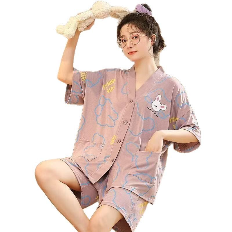 新款网红小个子睡衣女夏款短袖短裤家居服v领卡通兔子可外穿套装