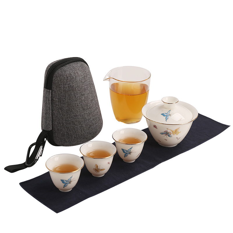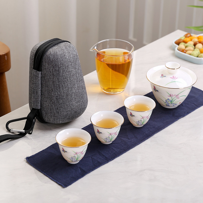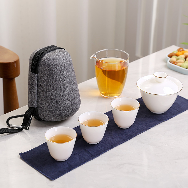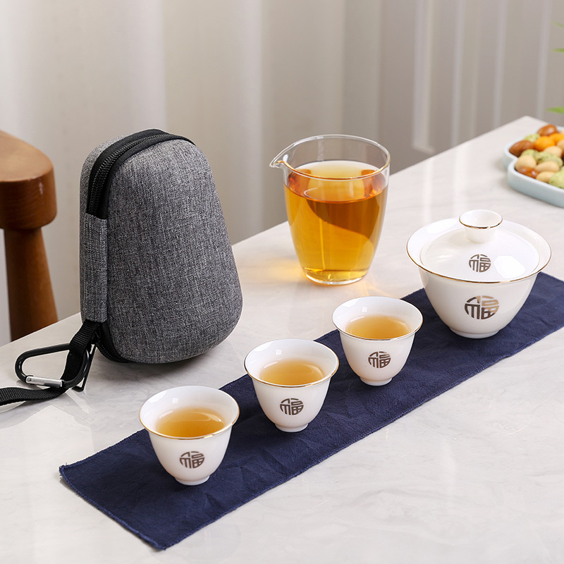 羊脂玉旅行快客杯套装德化白瓷泡茶盖碗便携户外旅行茶套一壶三杯