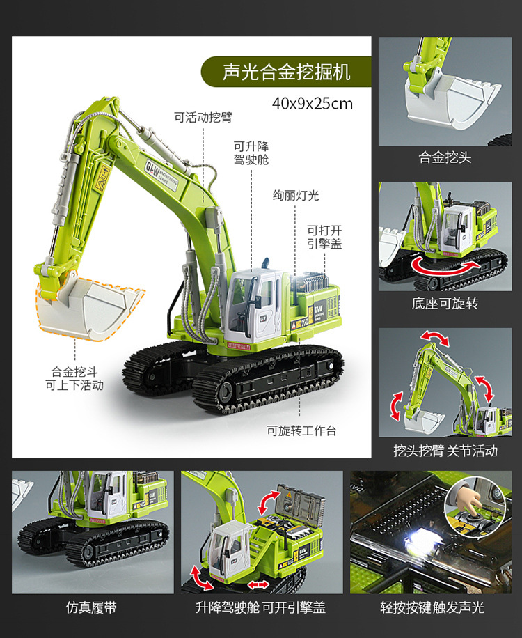 钢力威1:40合金挖掘机玩具声光男孩道路模型车仿真工程车模型代批