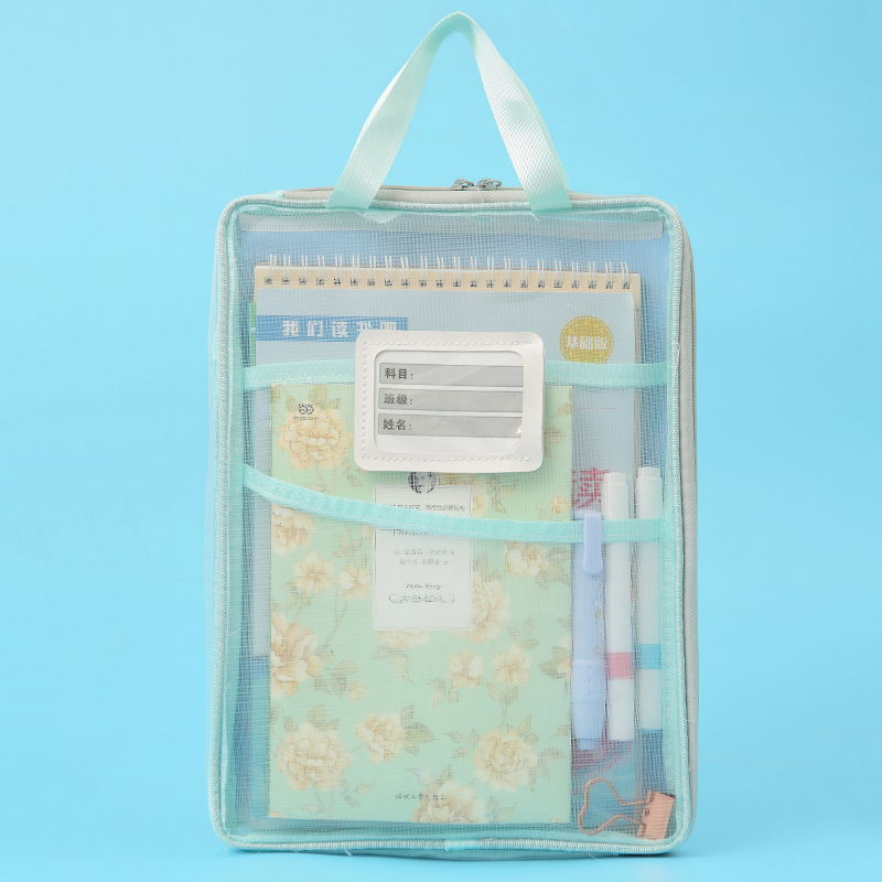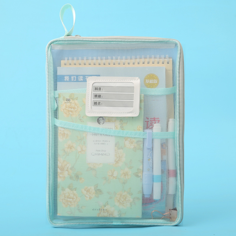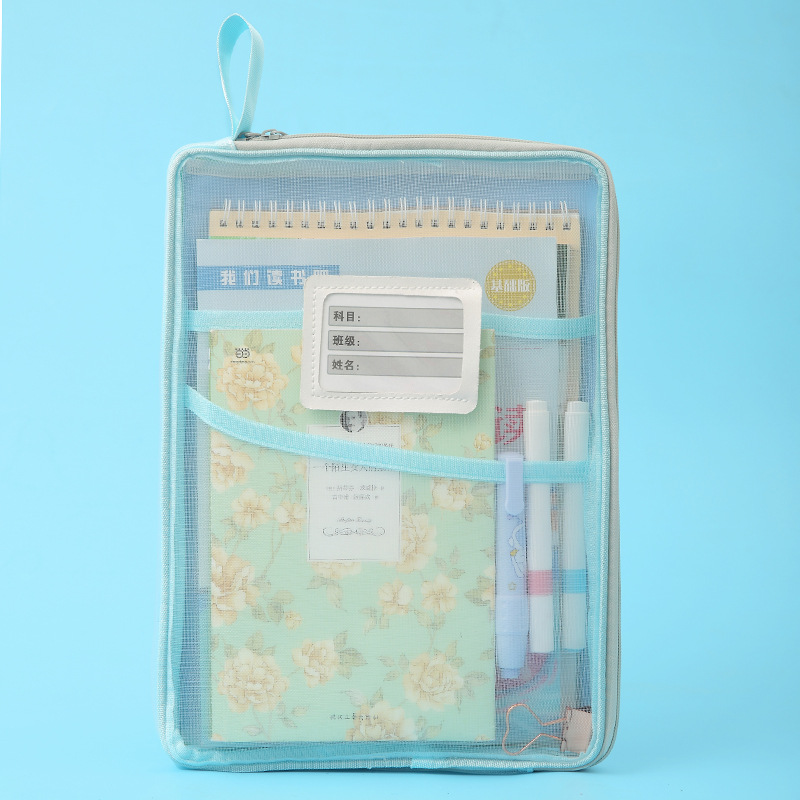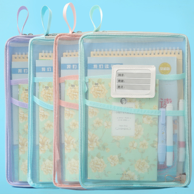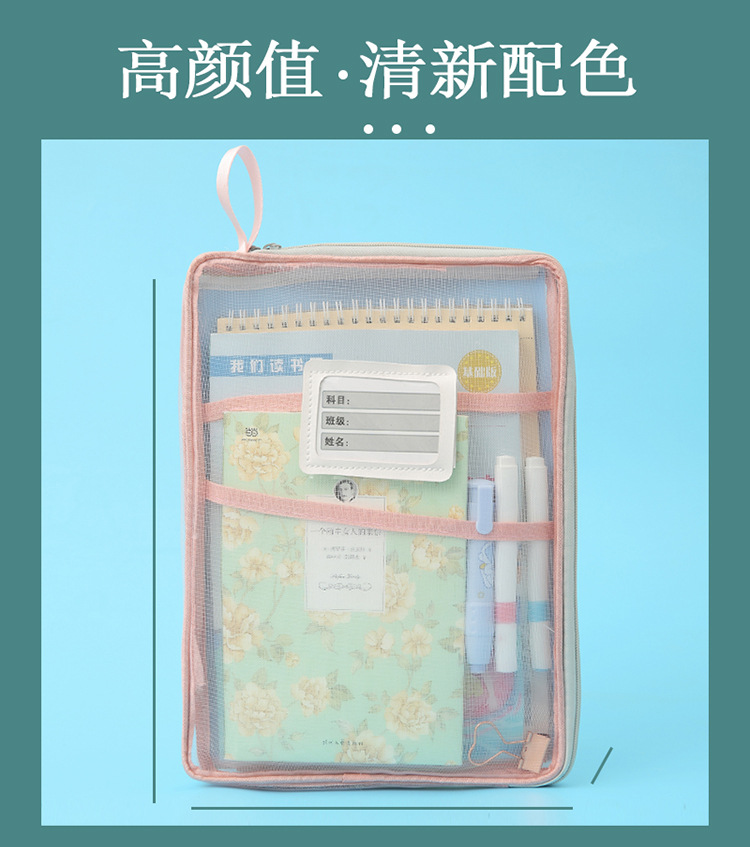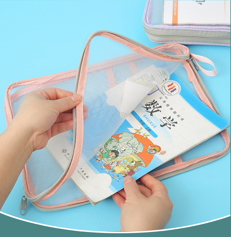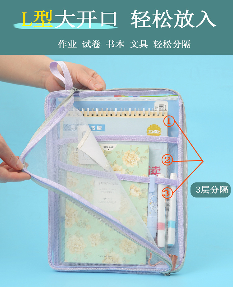 A4科目袋三层大容量L型大开口文件袋子 透明网纱学生用试卷收纳袋