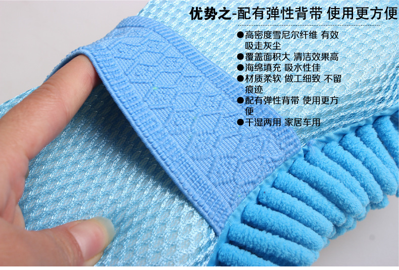 1、采用优质雪尼尔毛料,手感柔顺。能把灰尘颗粒有效地控制在纤维间隙中,迅速有效的去除污垢;