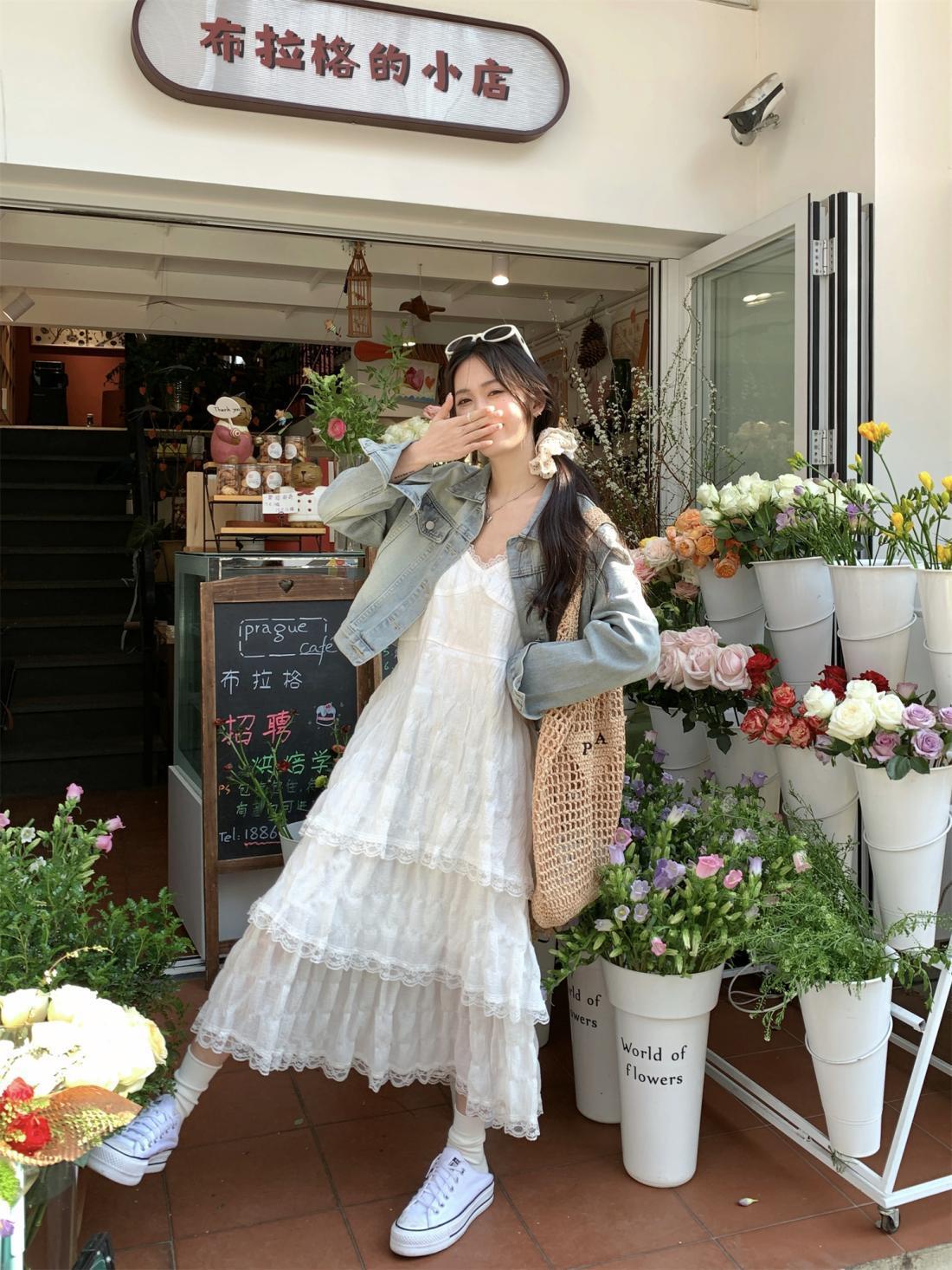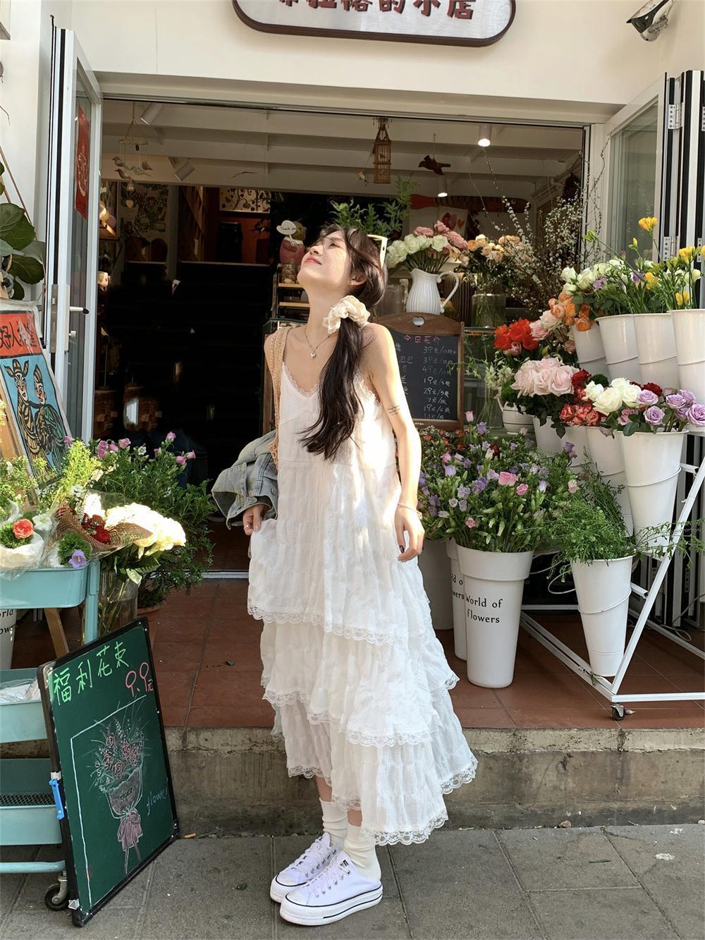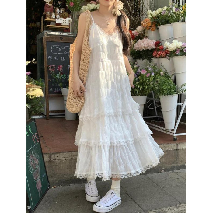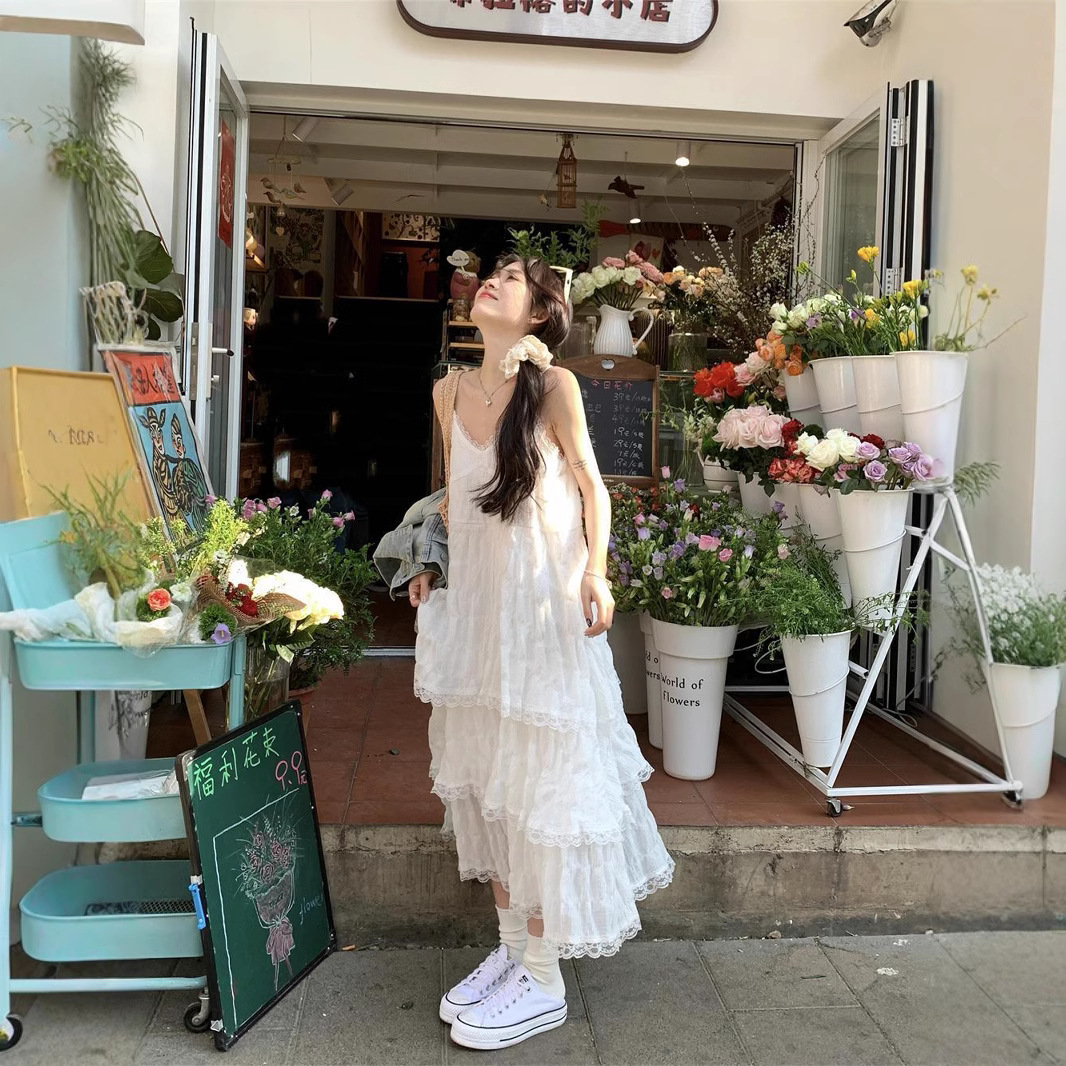 甜美减龄白色法式吊带连衣裙女装春季度假风小个子宽松蛋糕长裙子