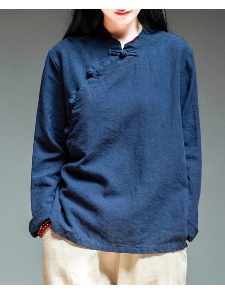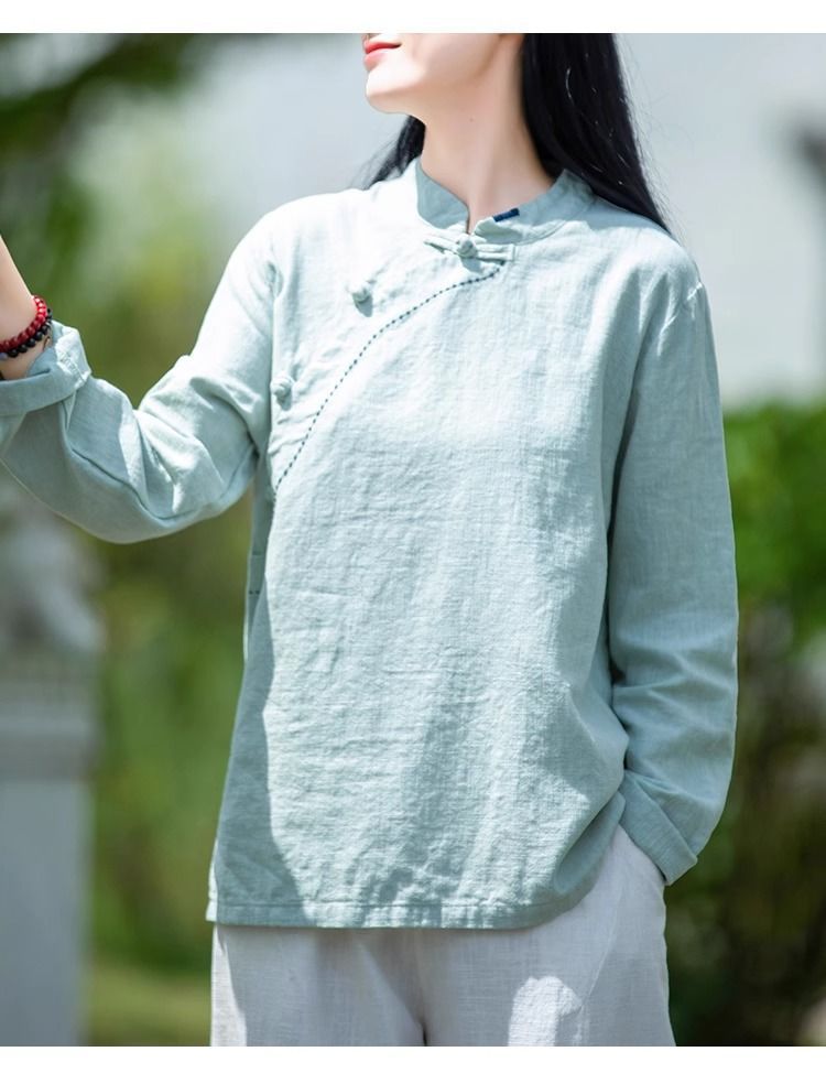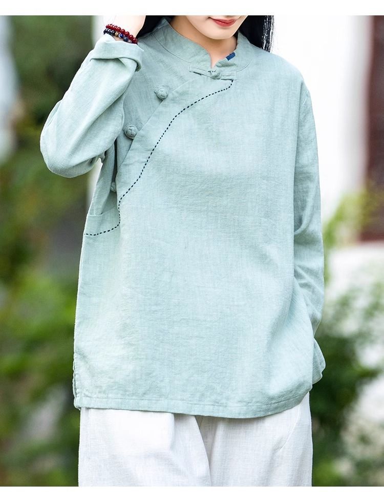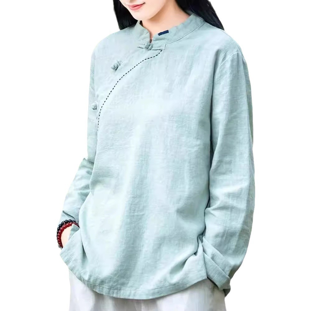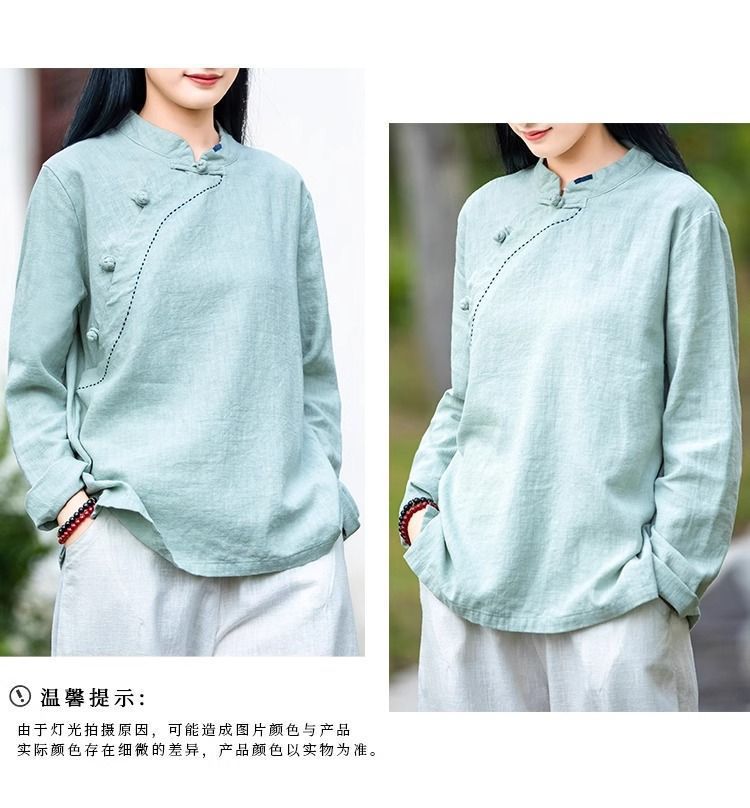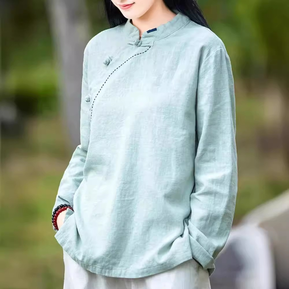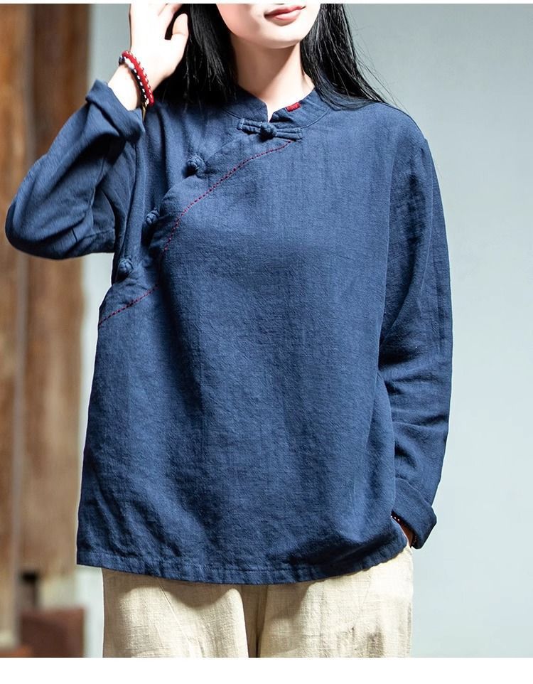 简约风古立领棉麻长袖上衣春秋季棉麻复女装新款中式盘扣套头T恤