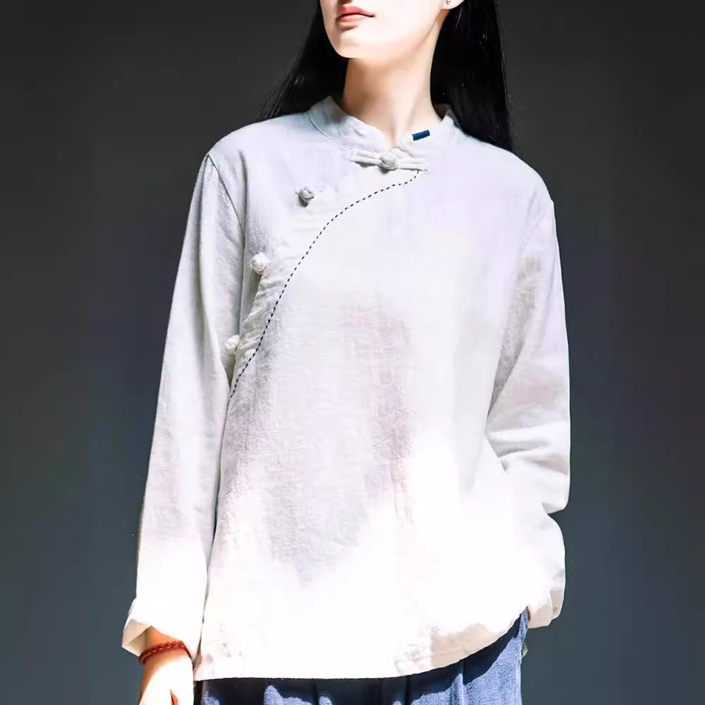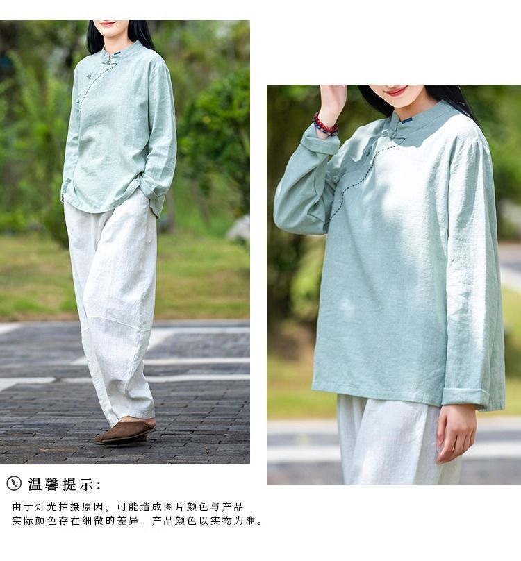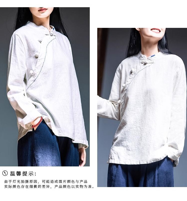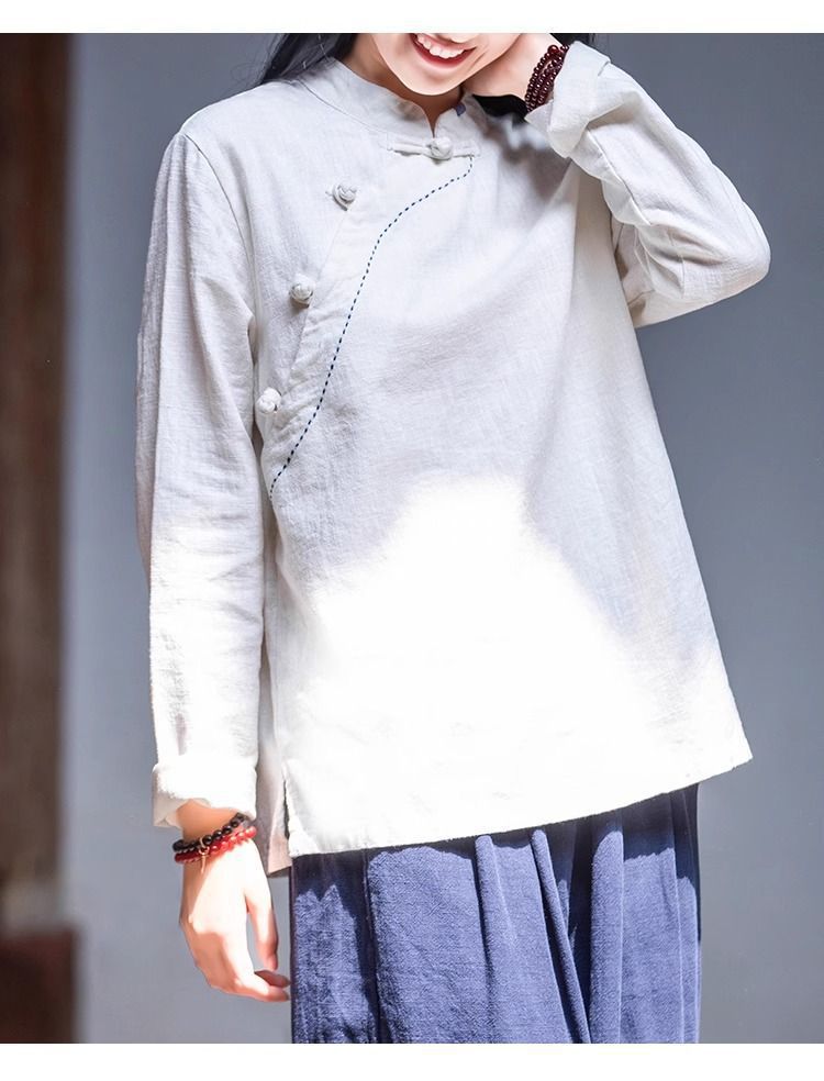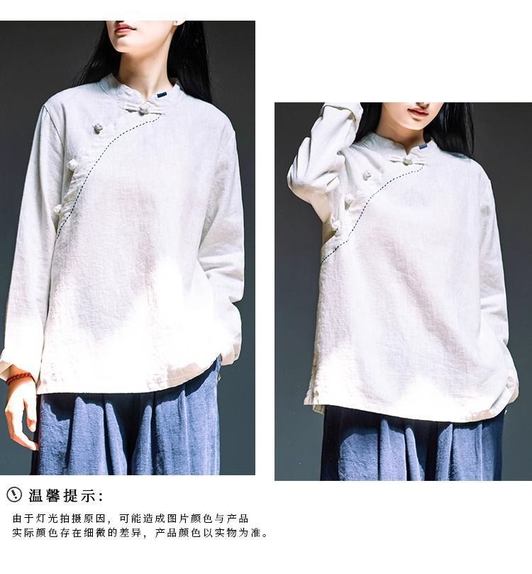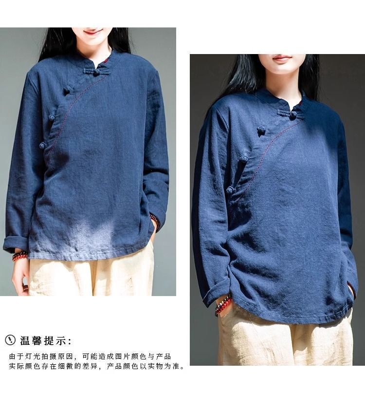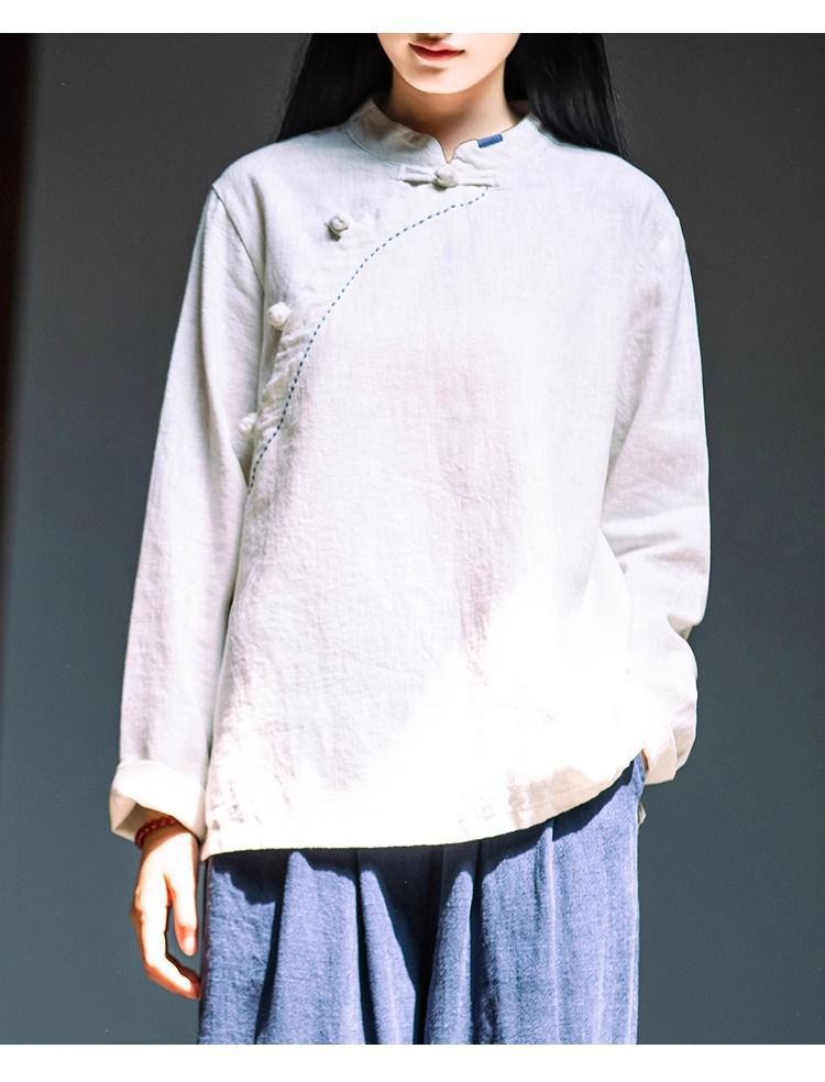 简约风古立领棉麻长袖上衣春秋季棉麻复女装新款中式盘扣套头T恤