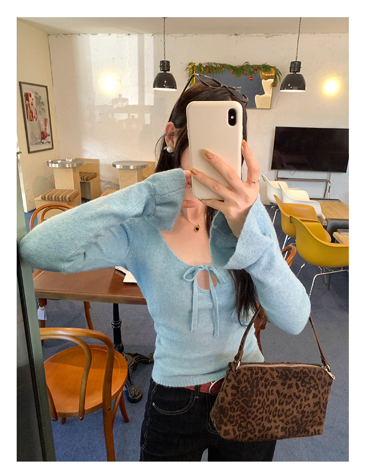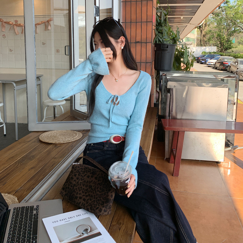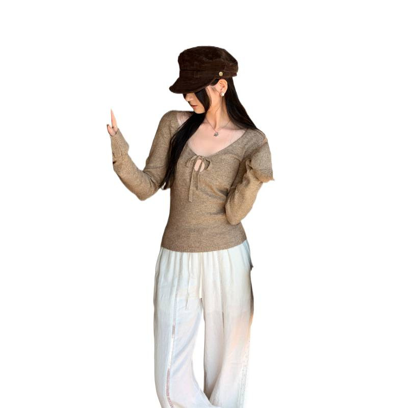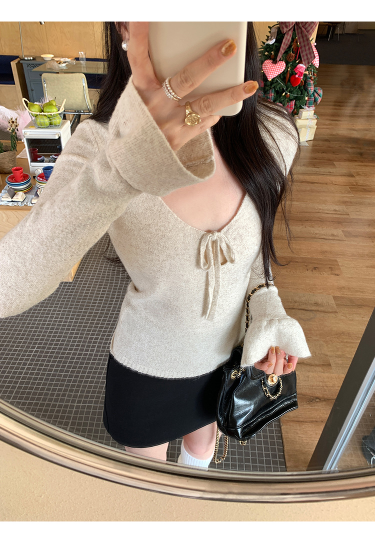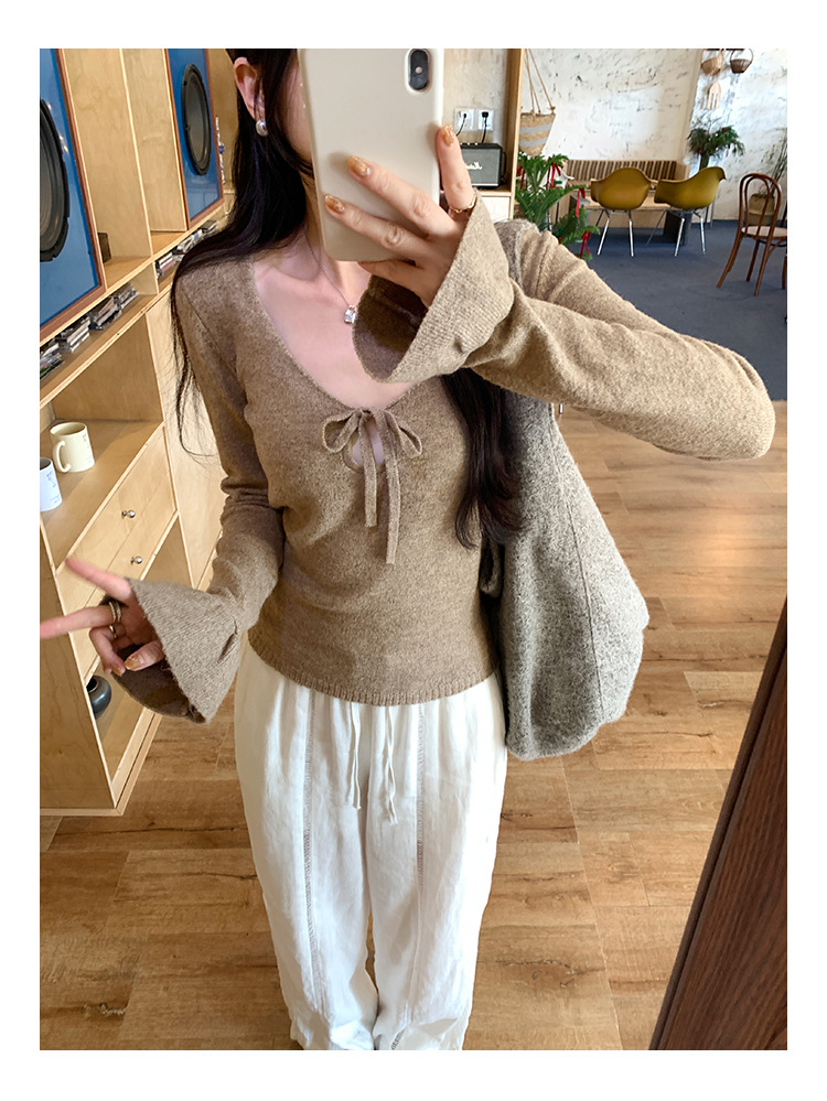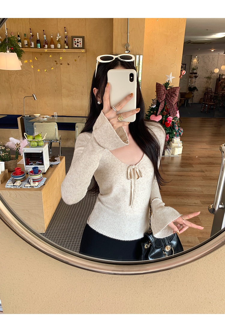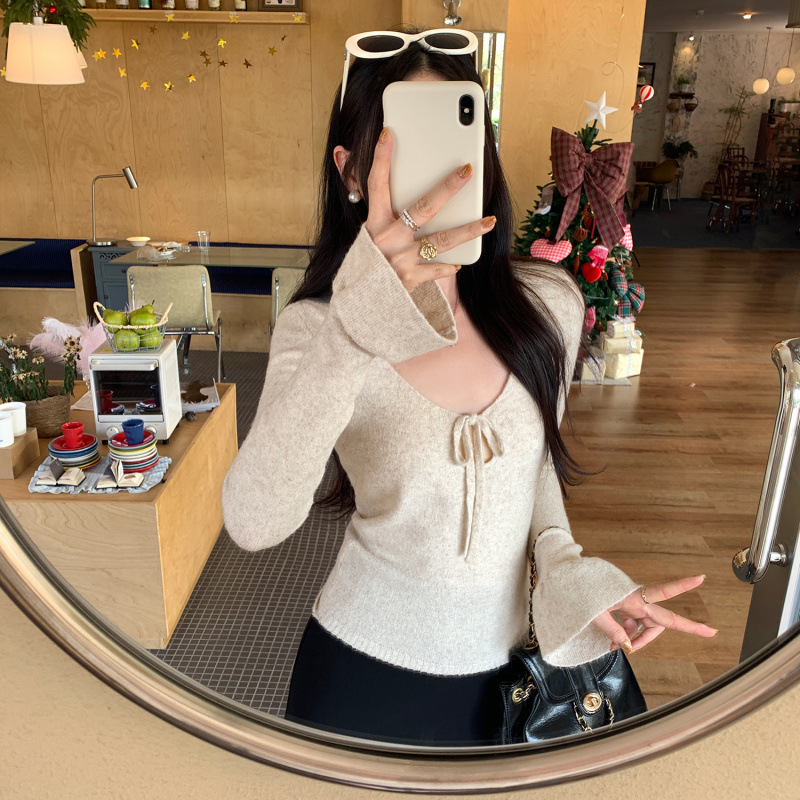 【现货】蝴蝶结绑带U领喇叭袖针织打底衫秋冬2026新款内搭短款女