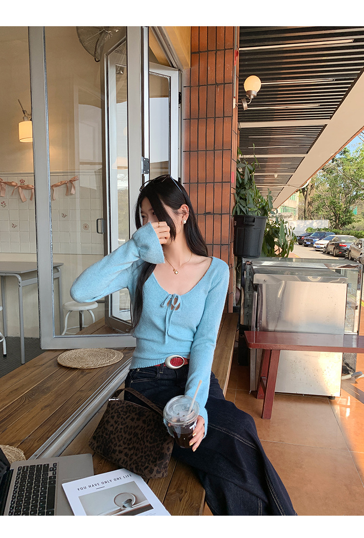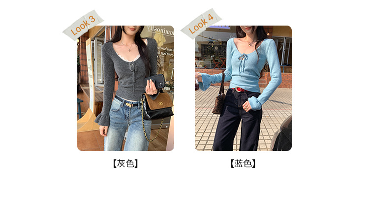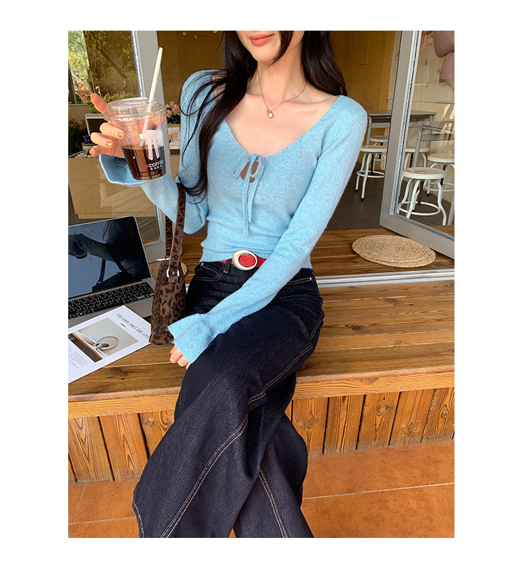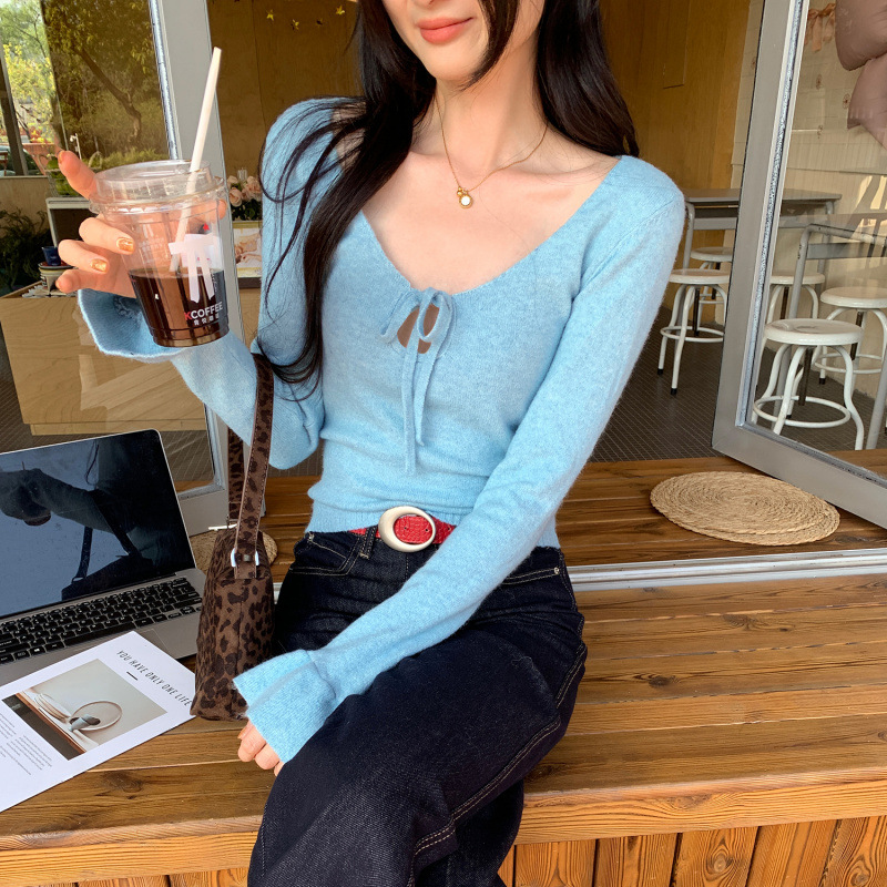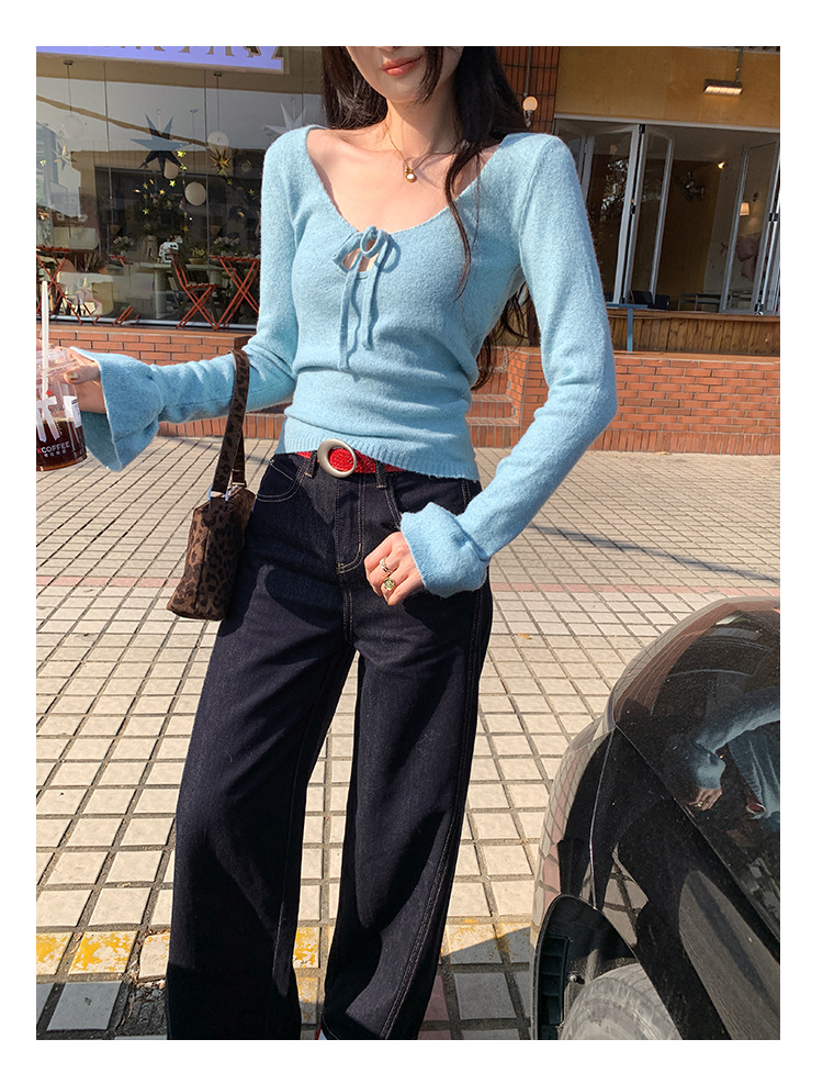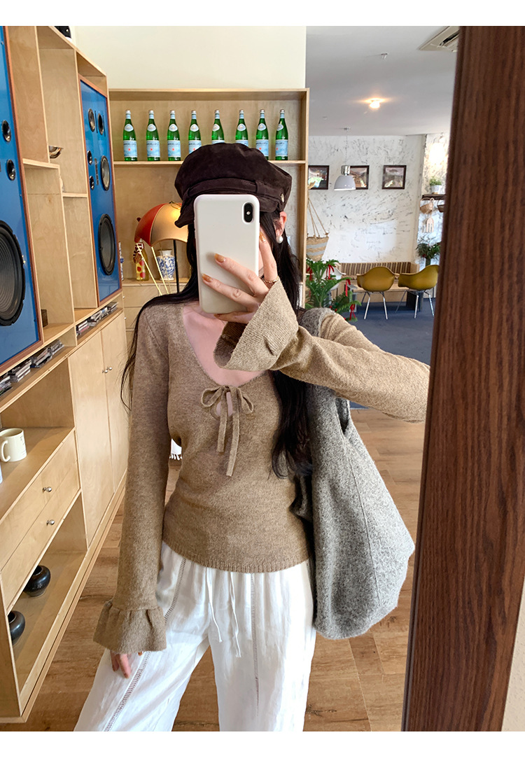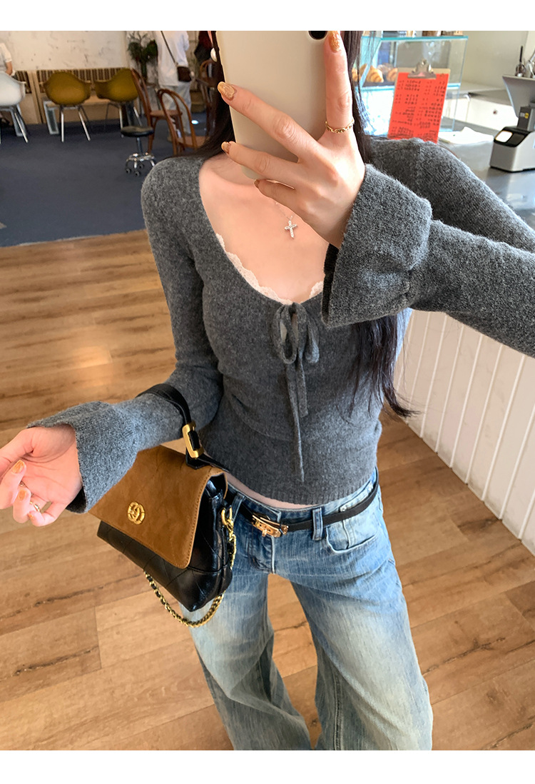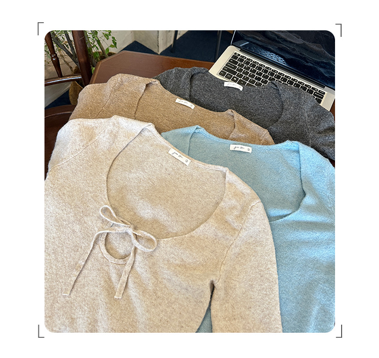 【现货】蝴蝶结绑带U领喇叭袖针织打底衫秋冬2026新款内搭短款女