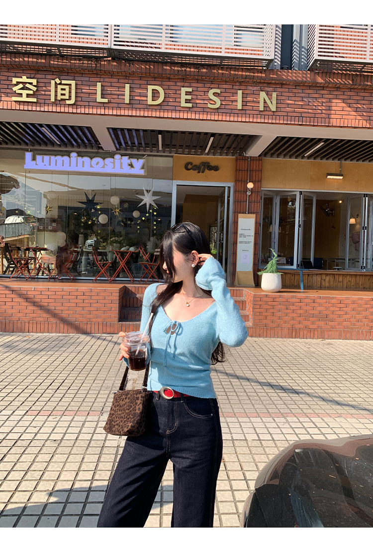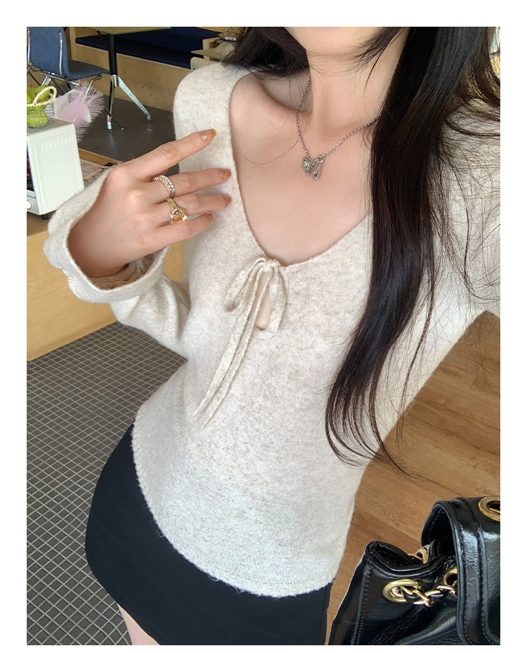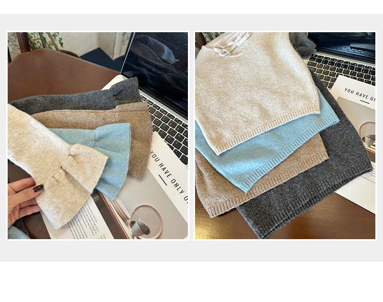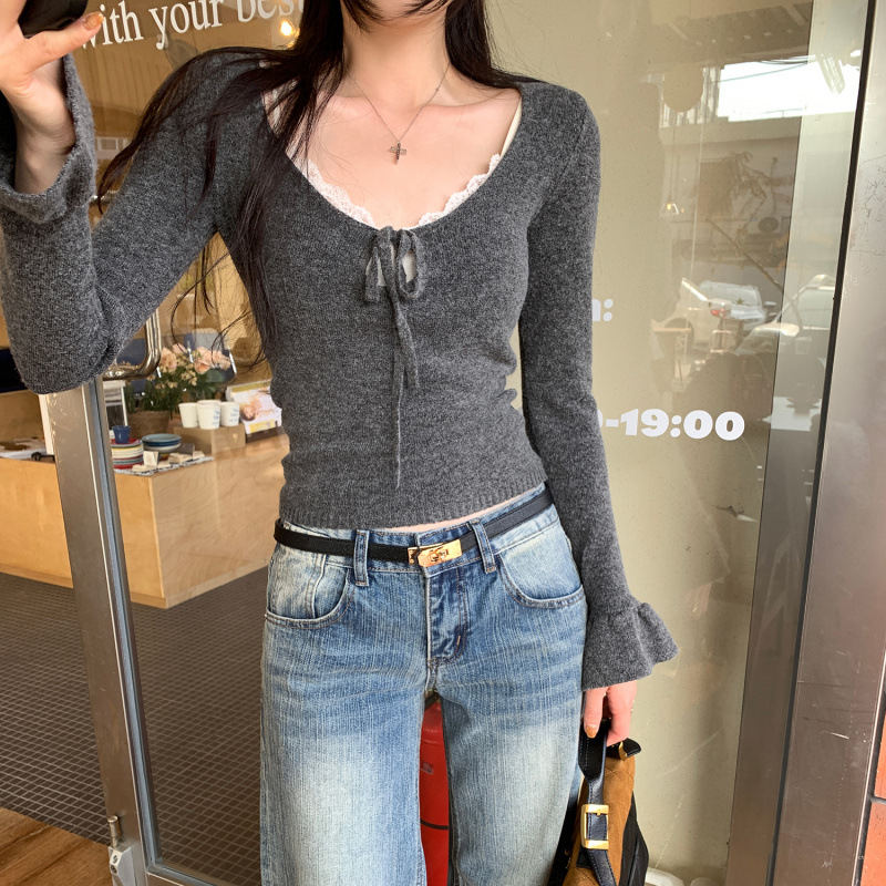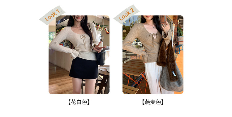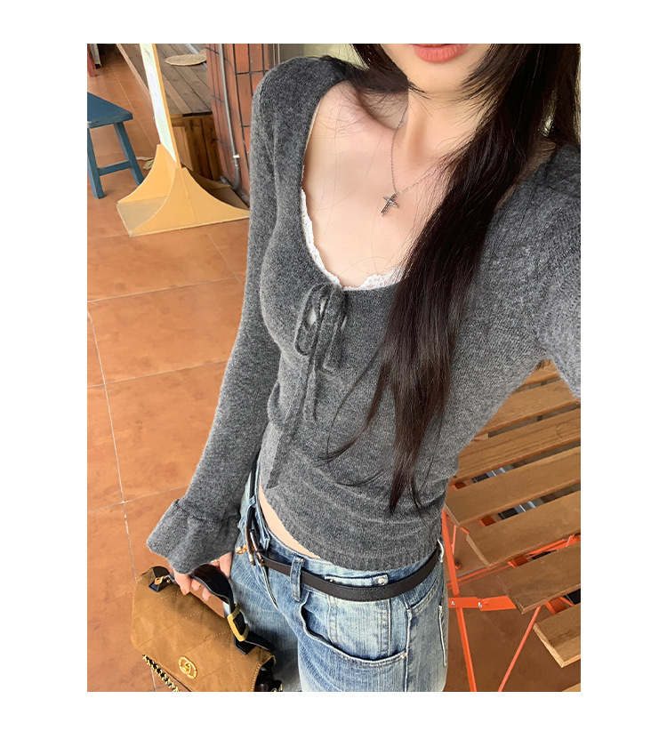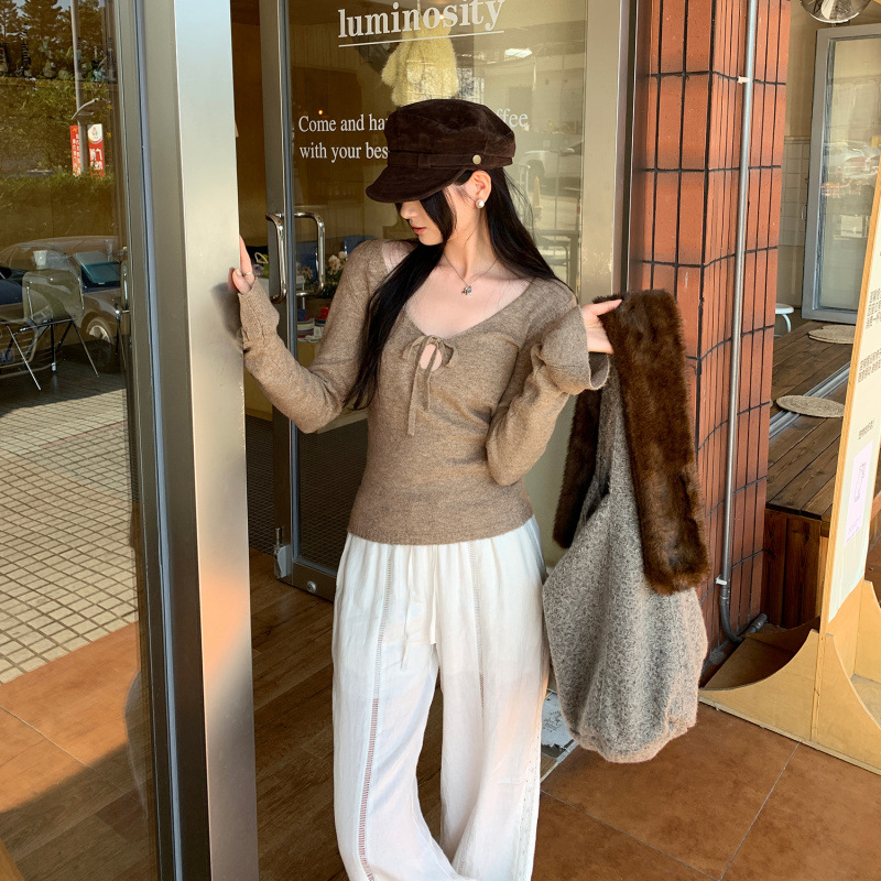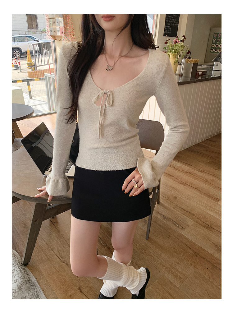 【现货】蝴蝶结绑带U领喇叭袖针织打底衫秋冬2026新款内搭短款女