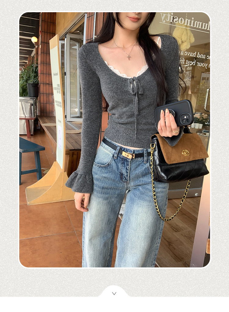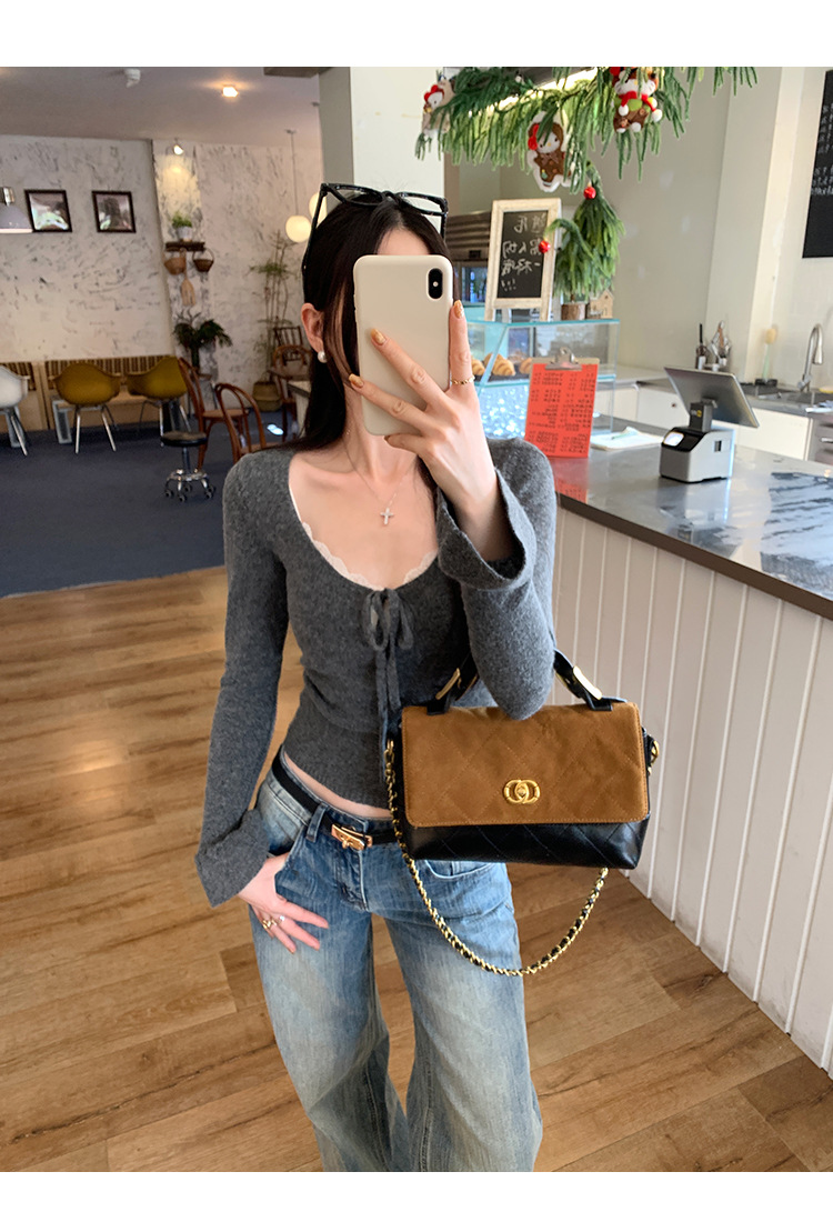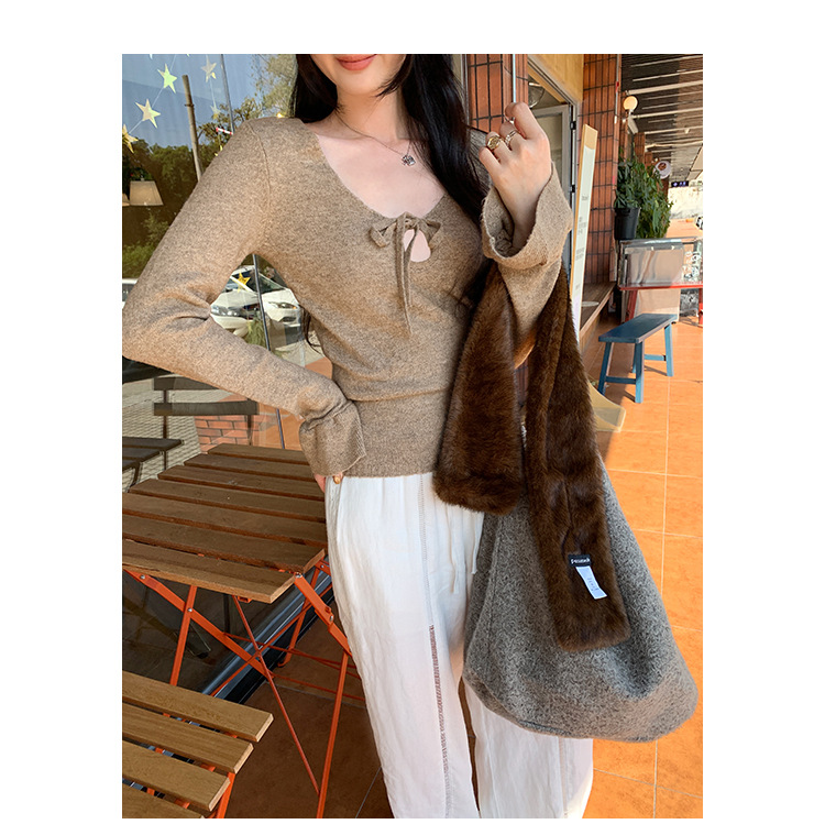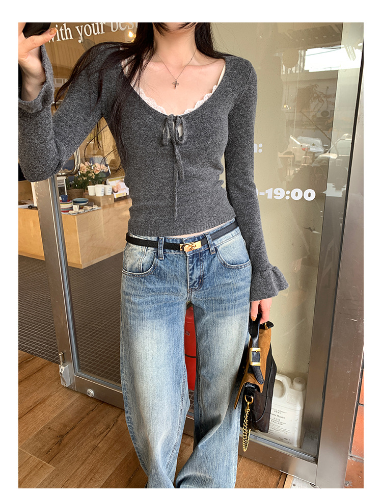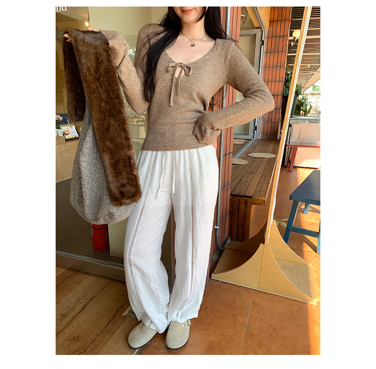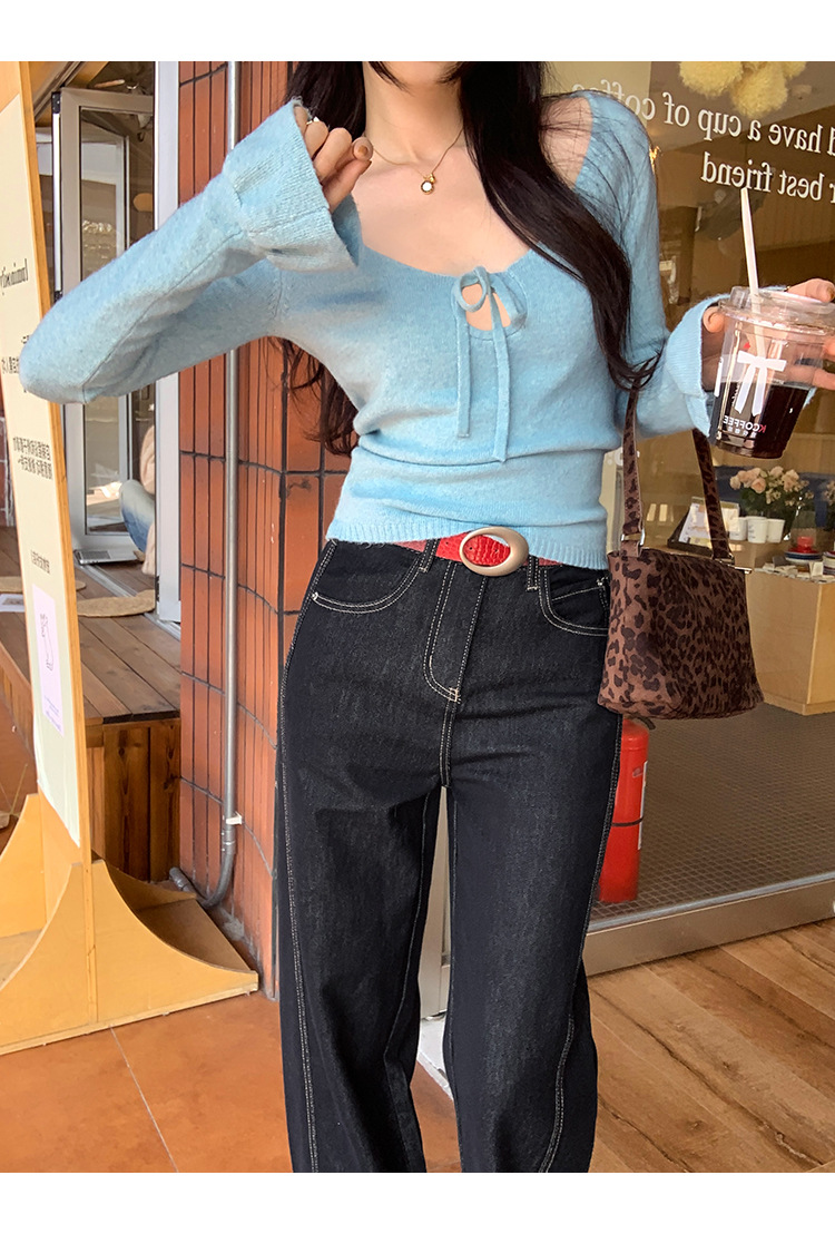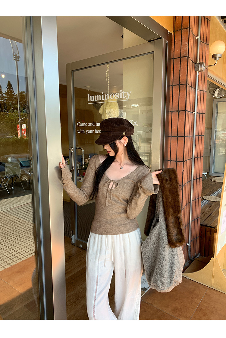 【现货】蝴蝶结绑带U领喇叭袖针织打底衫秋冬2026新款内搭短款女