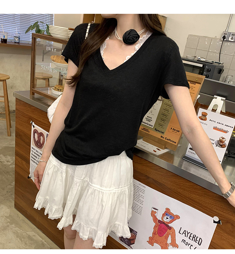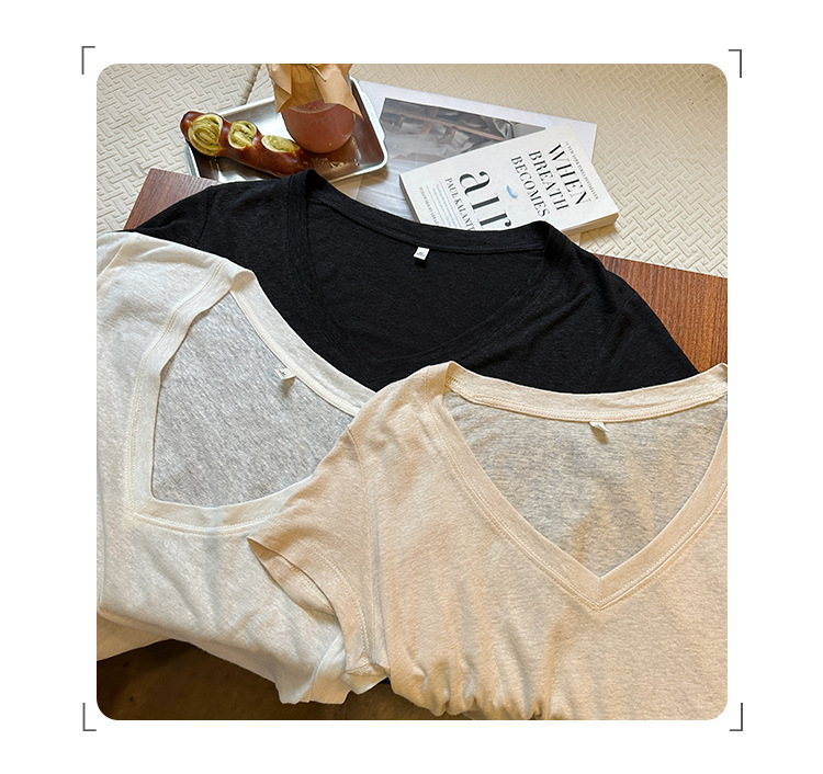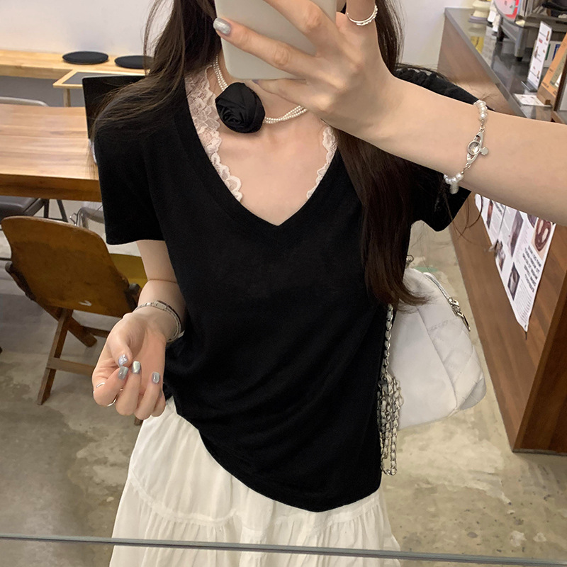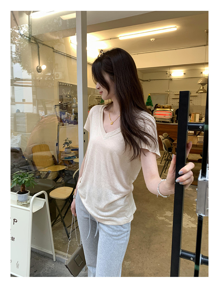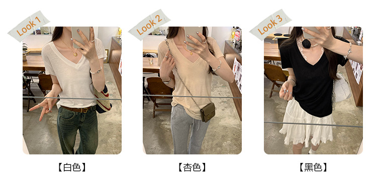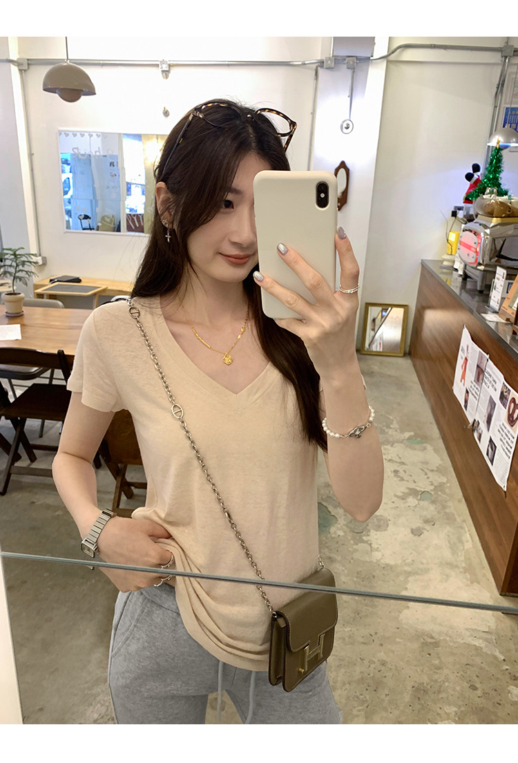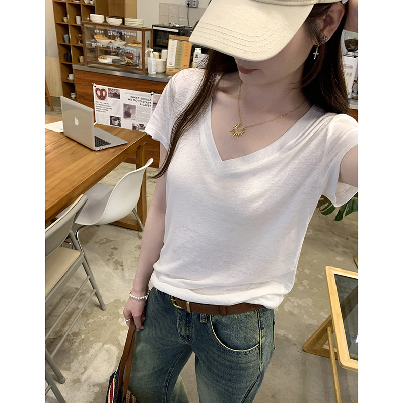 工厂直营法式纯欲辣妹V领薄款短袖T恤女2025夏新款韩系宽松显瘦上