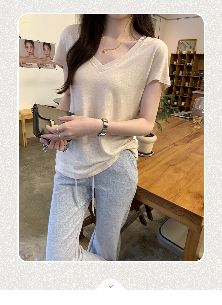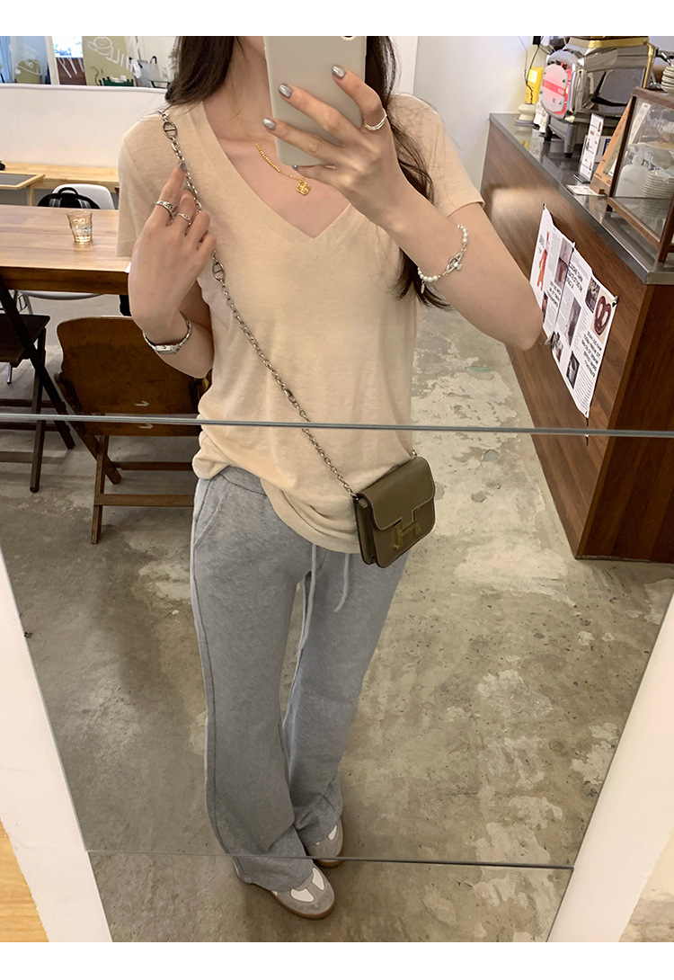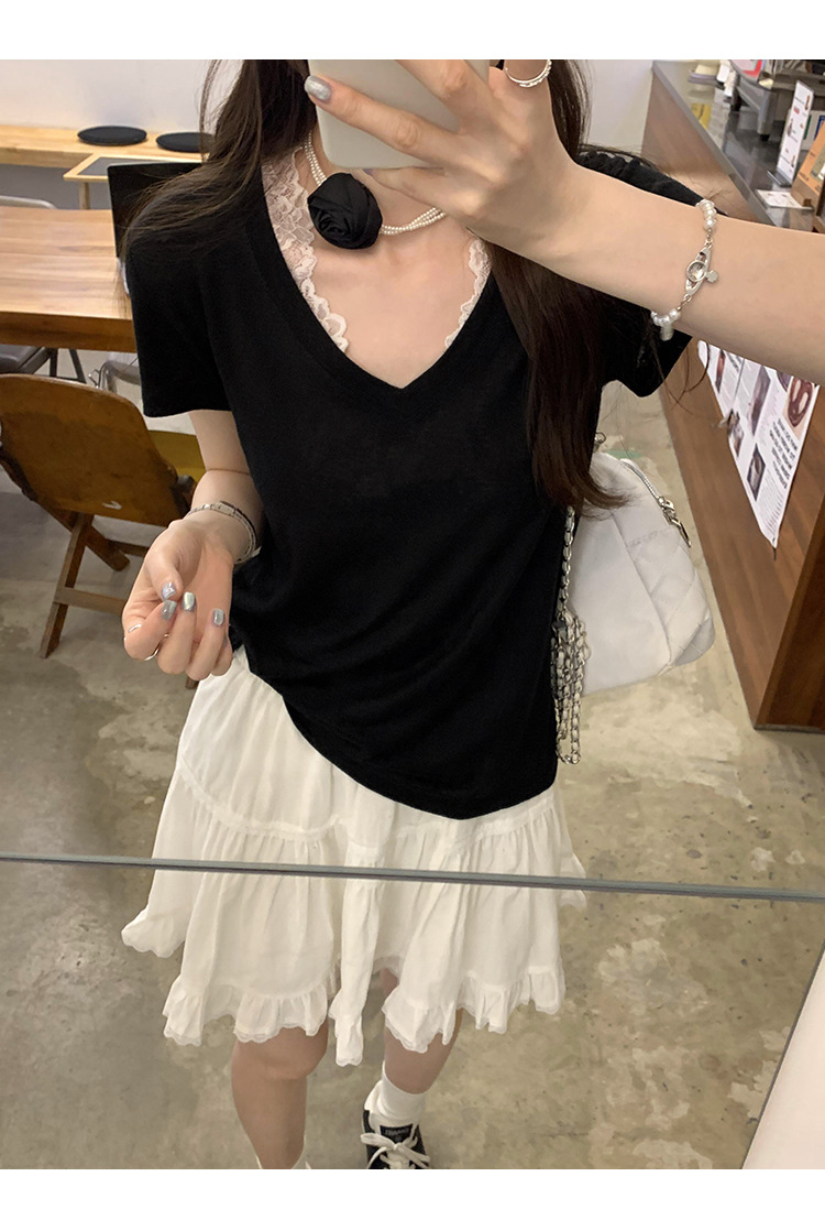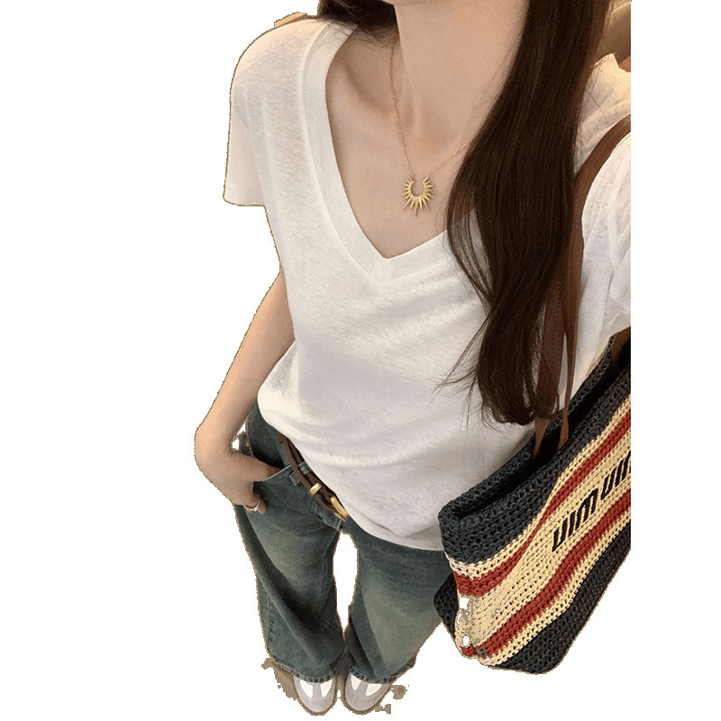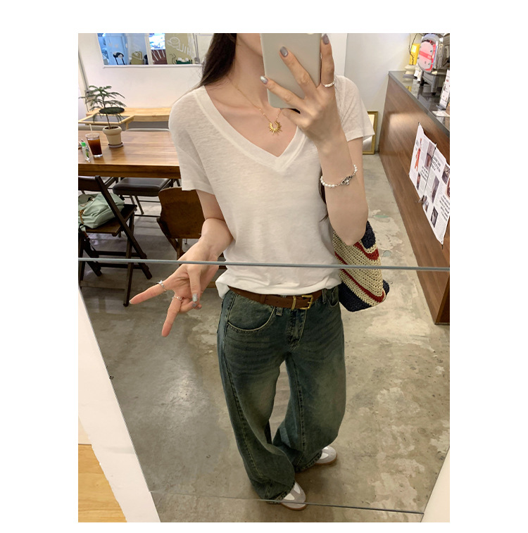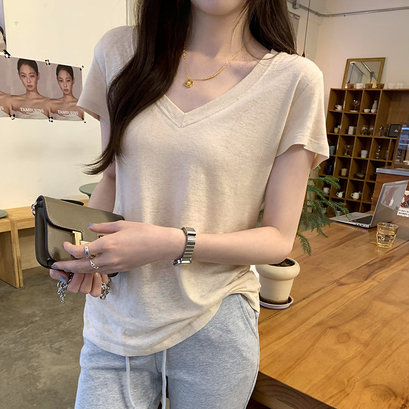 工厂直营法式纯欲辣妹V领薄款短袖T恤女2025夏新款韩系宽松显瘦上