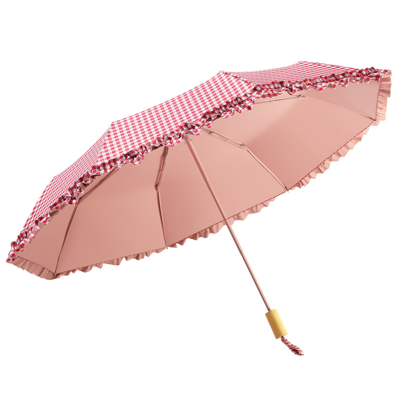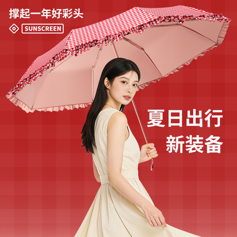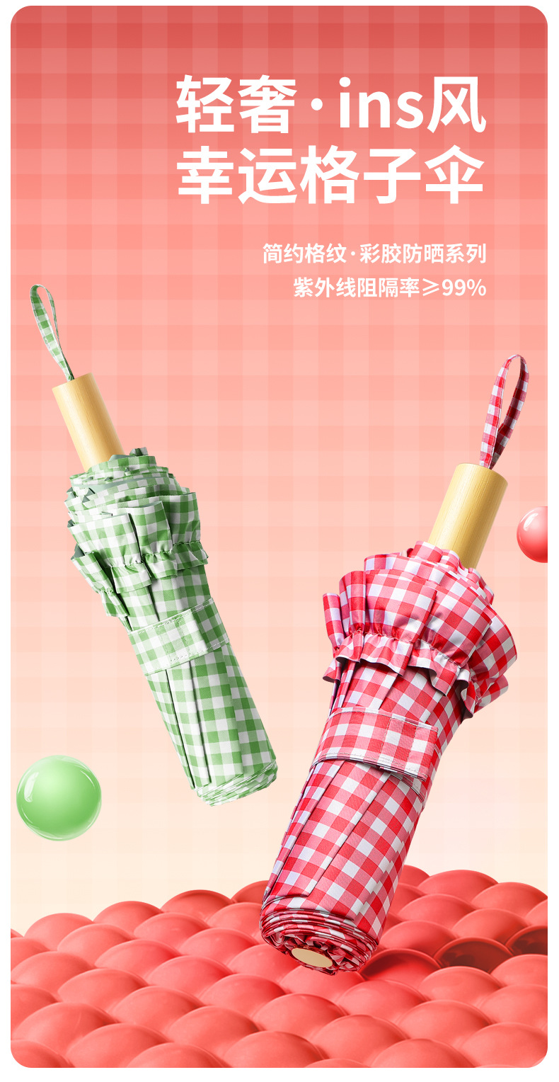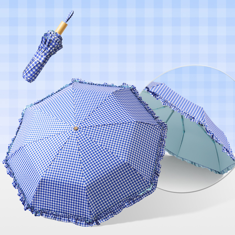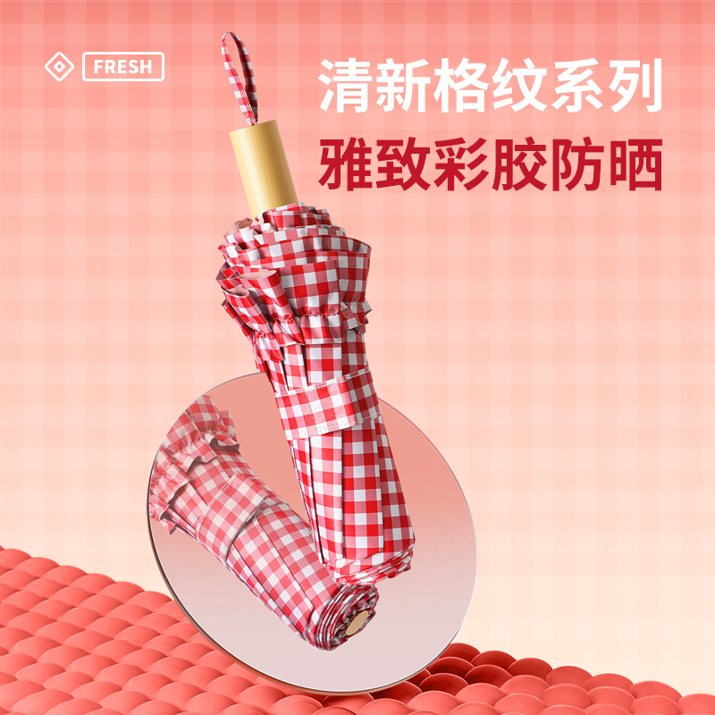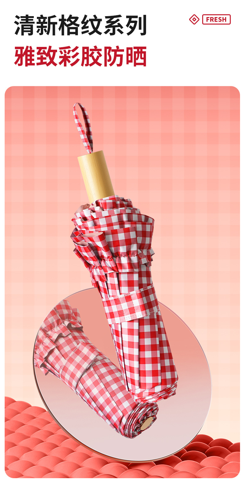 夏季防紫外线格子波浪花边晴雨两用遮阳伞彩胶女士伞防晒手动雨伞