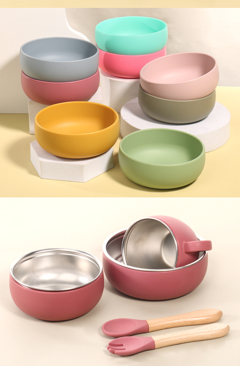 工厂新品婴儿硅胶不锈钢餐具套装创意品304不锈钢儿童硅胶餐具碗