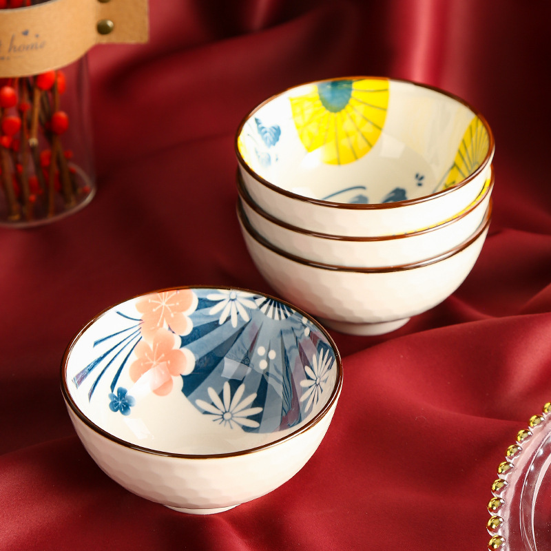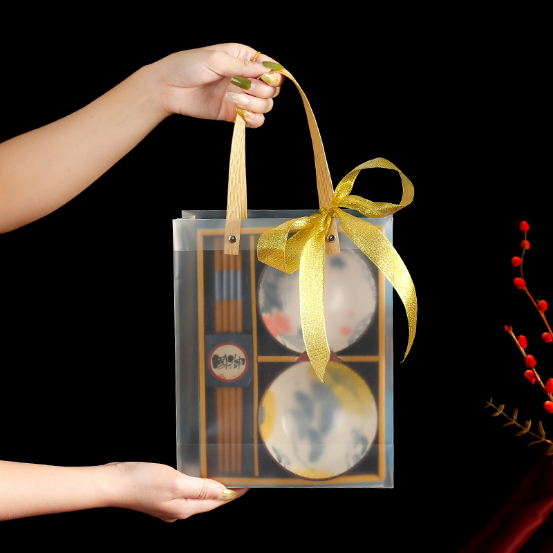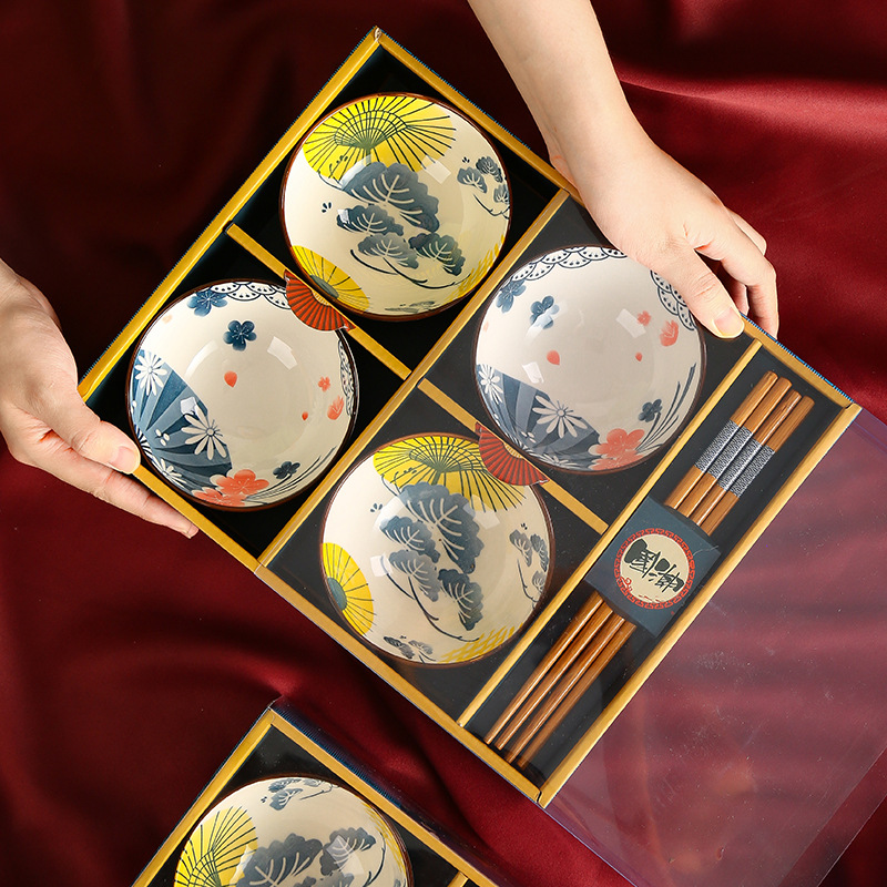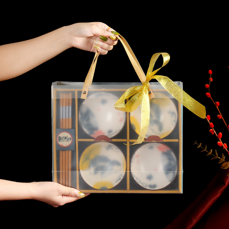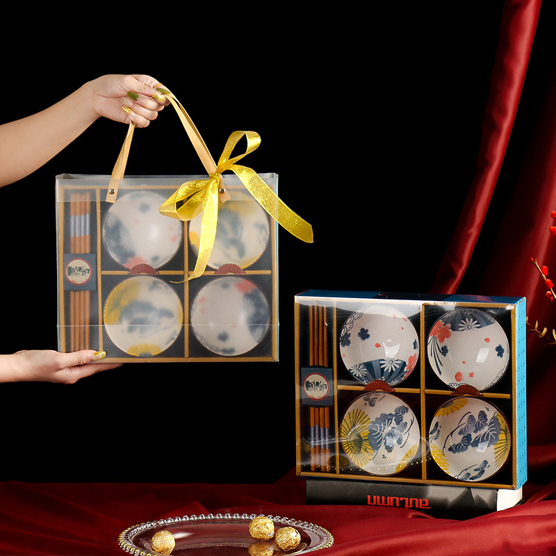 青花瓷套碗礼盒套装四碗四筷套装陶瓷碗家用伴手礼国潮礼盒碗套装