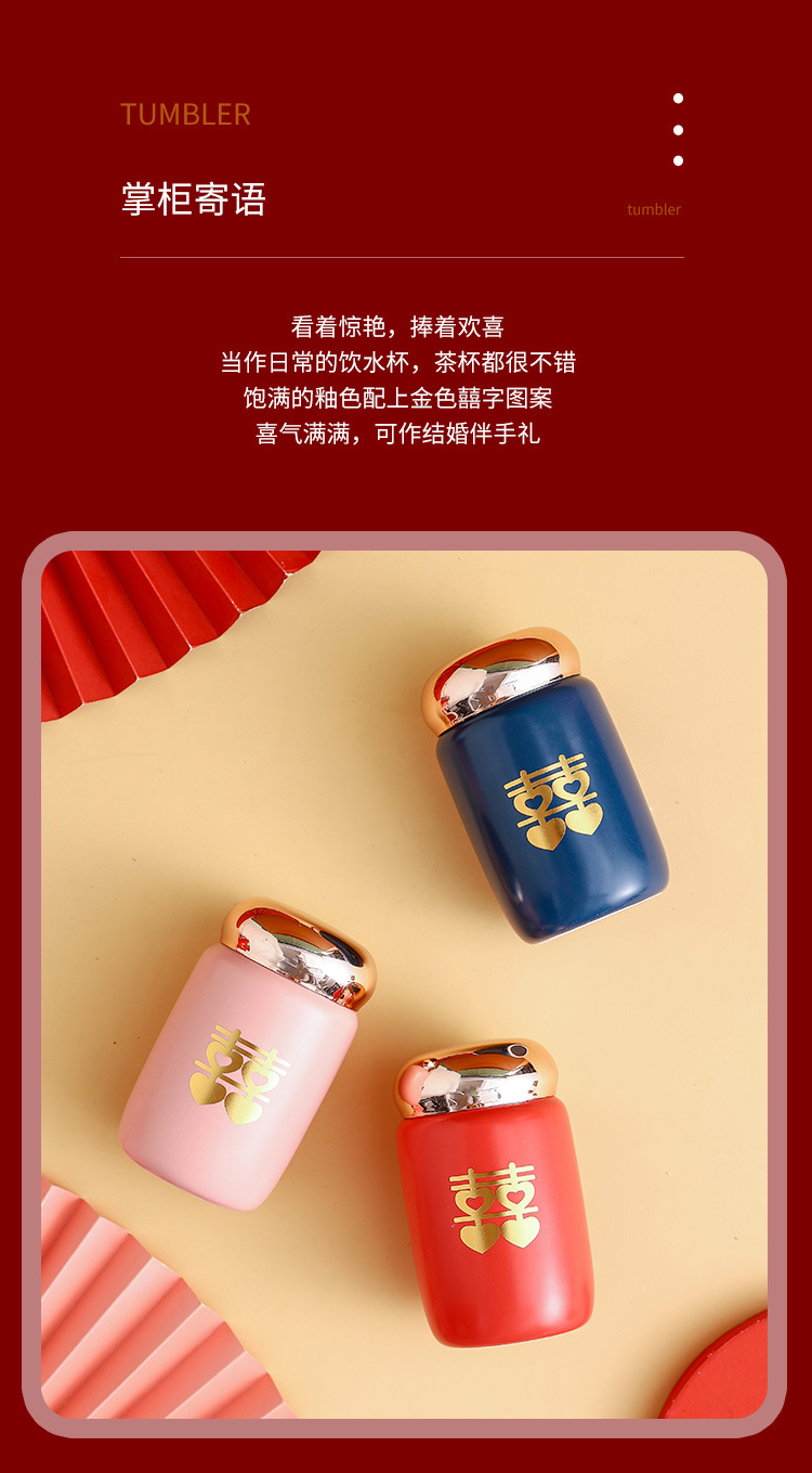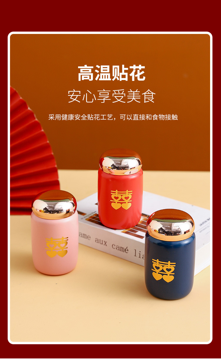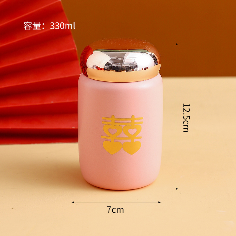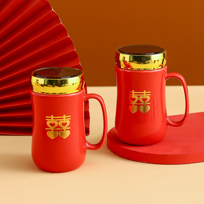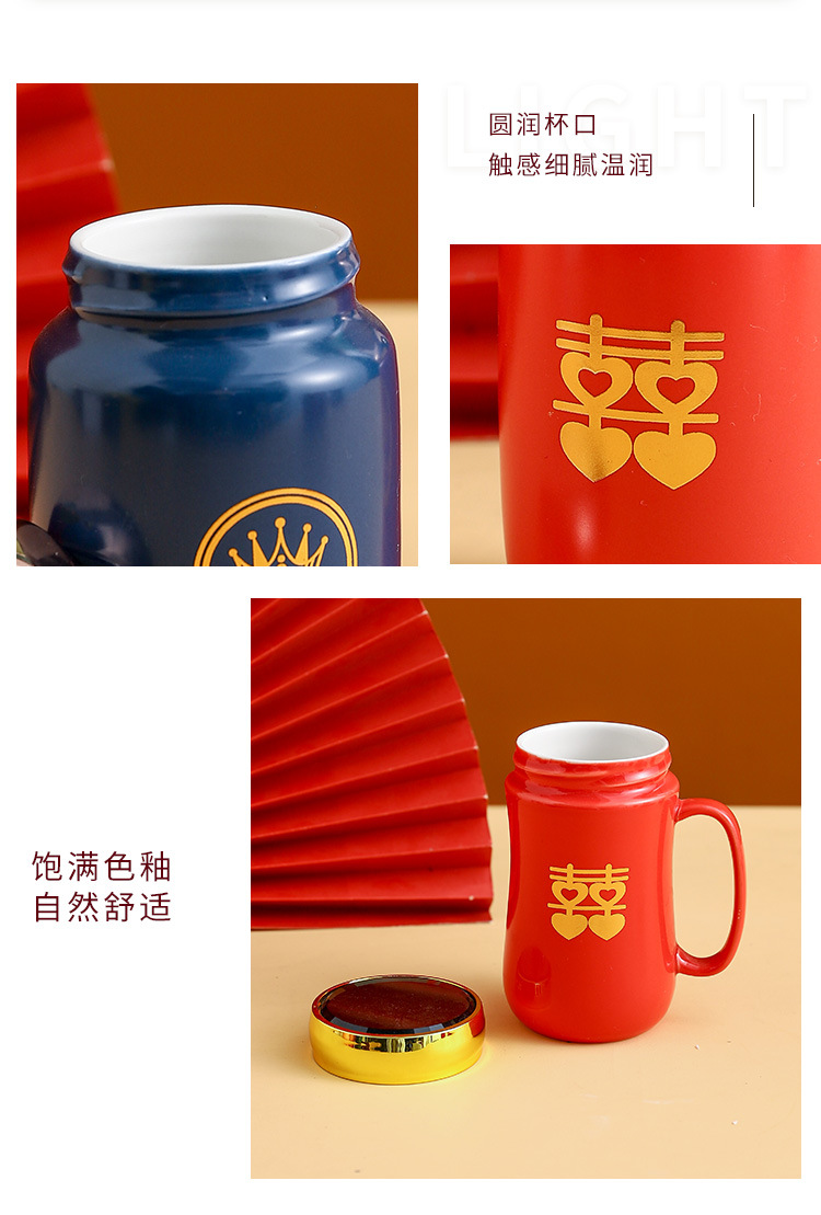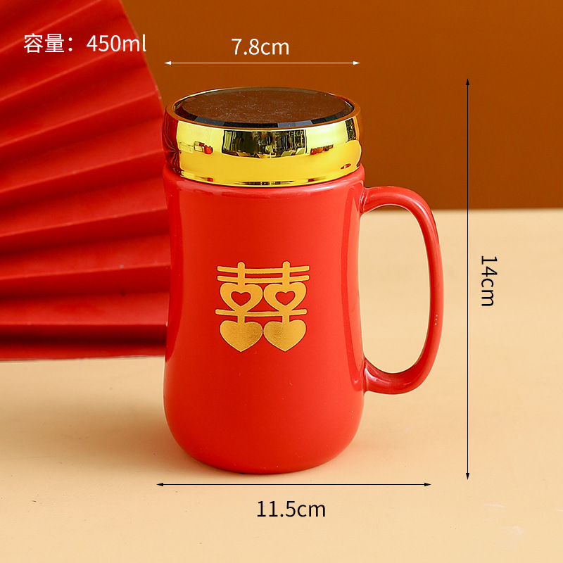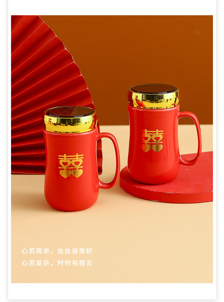 结婚伴手礼陶瓷喜杯子带蘑菇盖杯婚庆银行会销礼品陶瓷马克杯批发