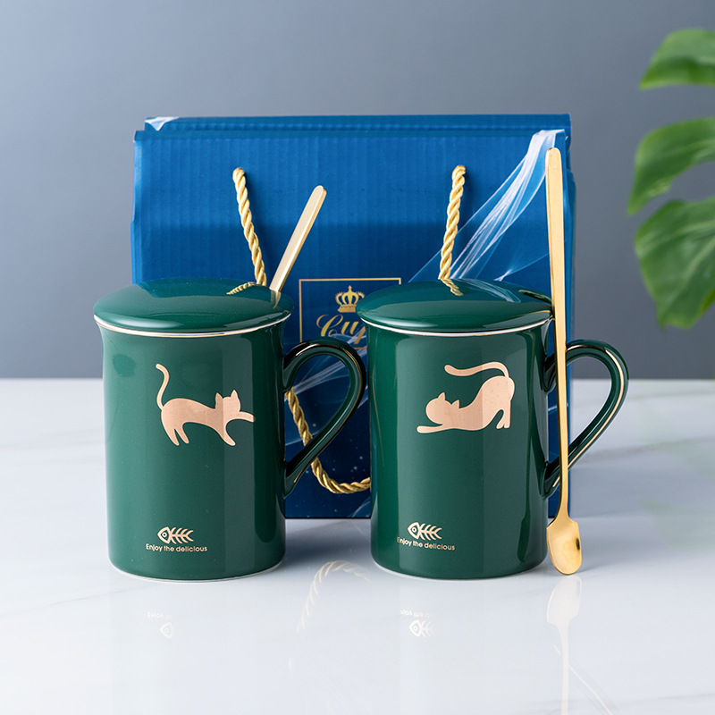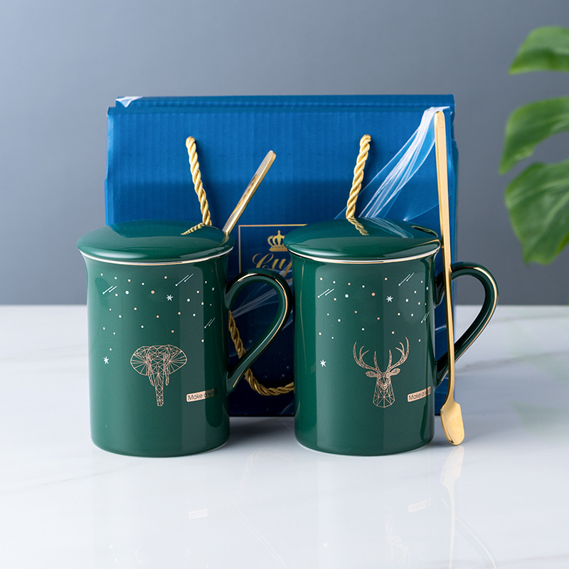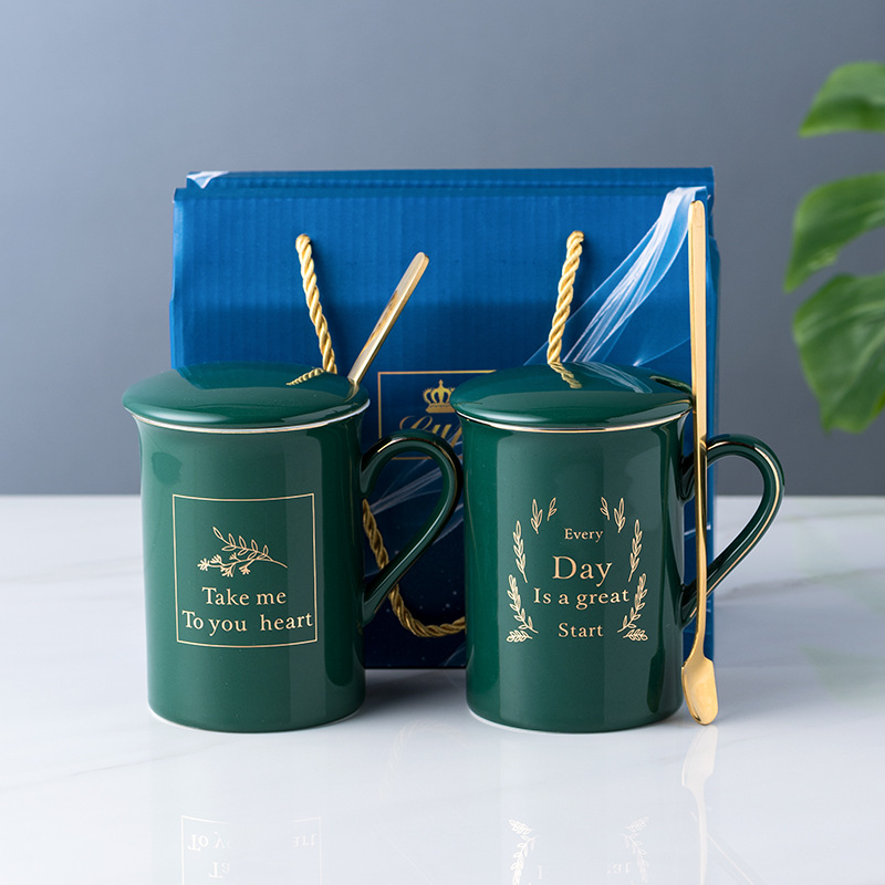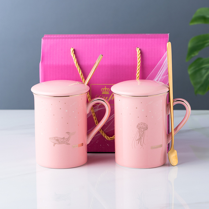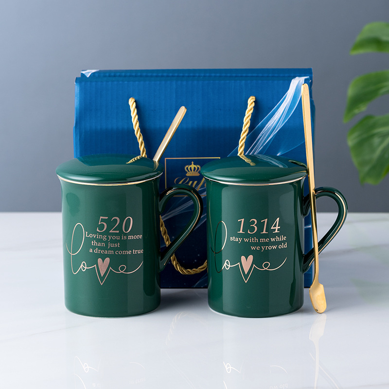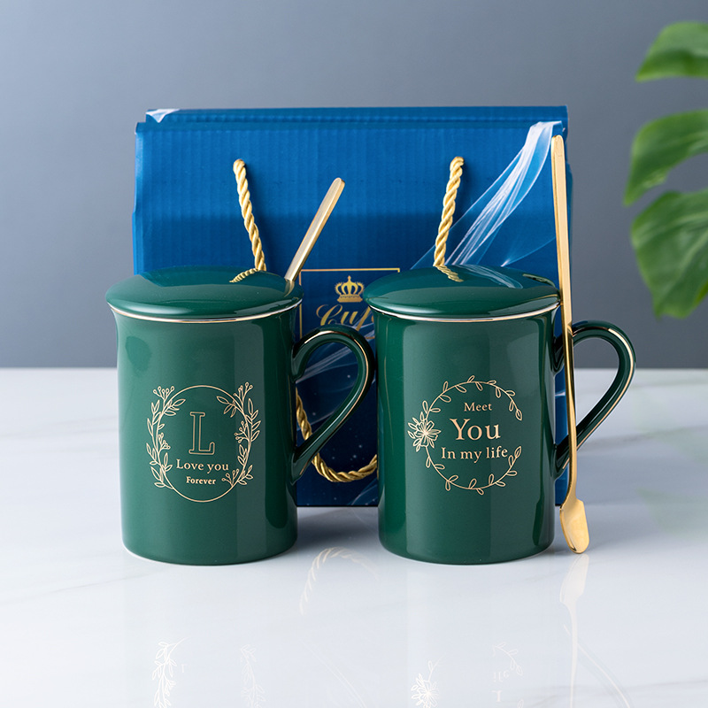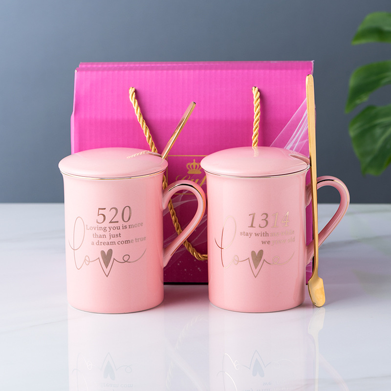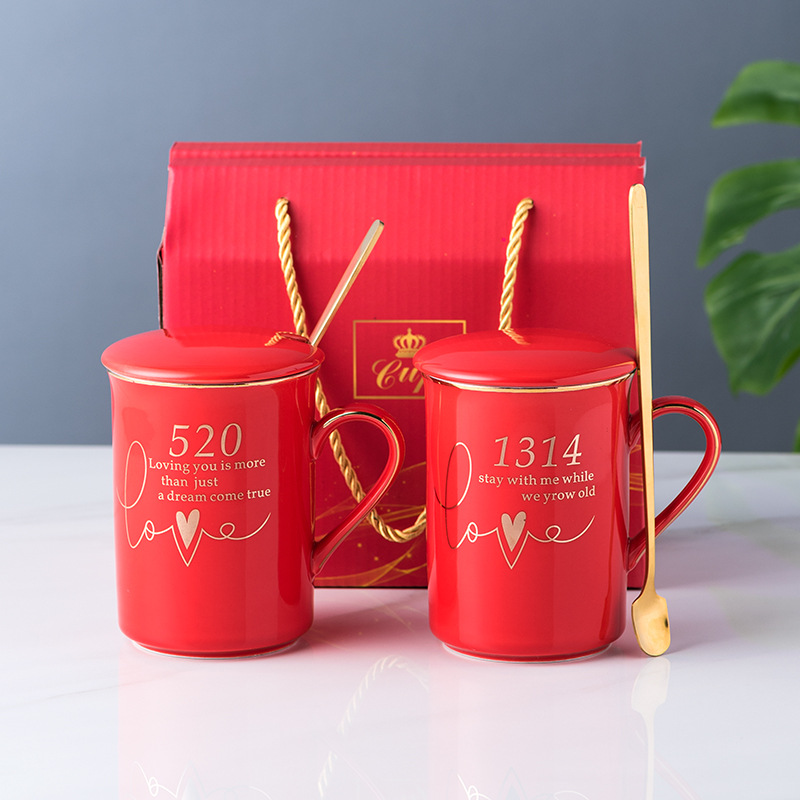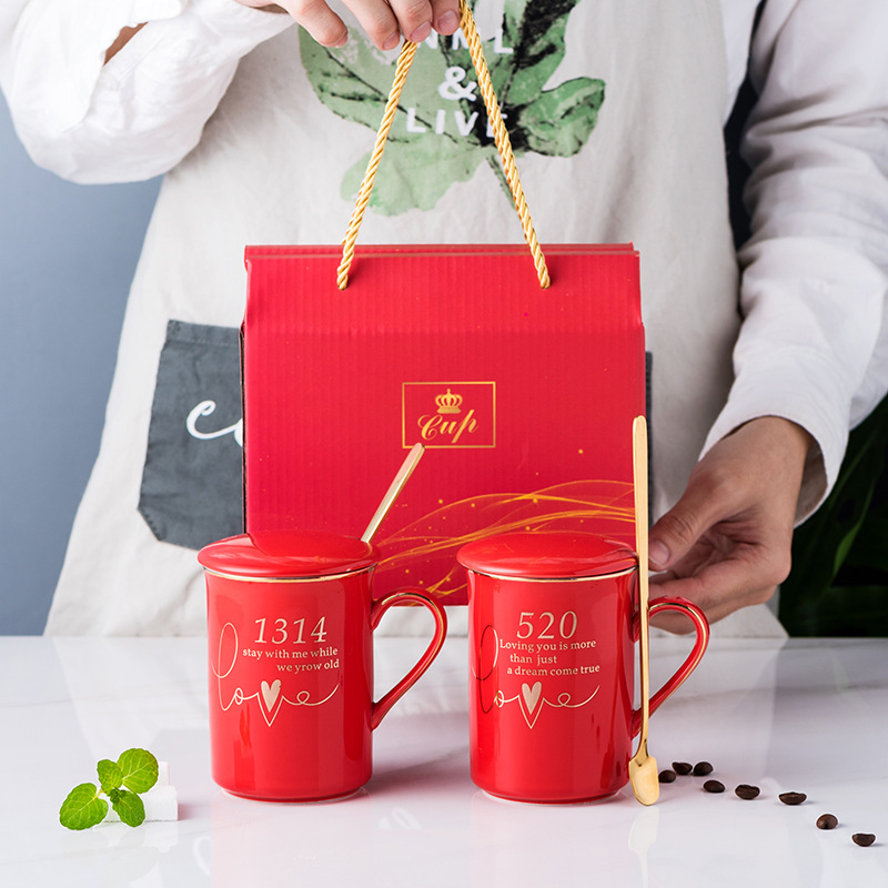 陶瓷马克杯创意情侣对杯子家用带盖勺婚礼伴手礼品可制作LOGO现货