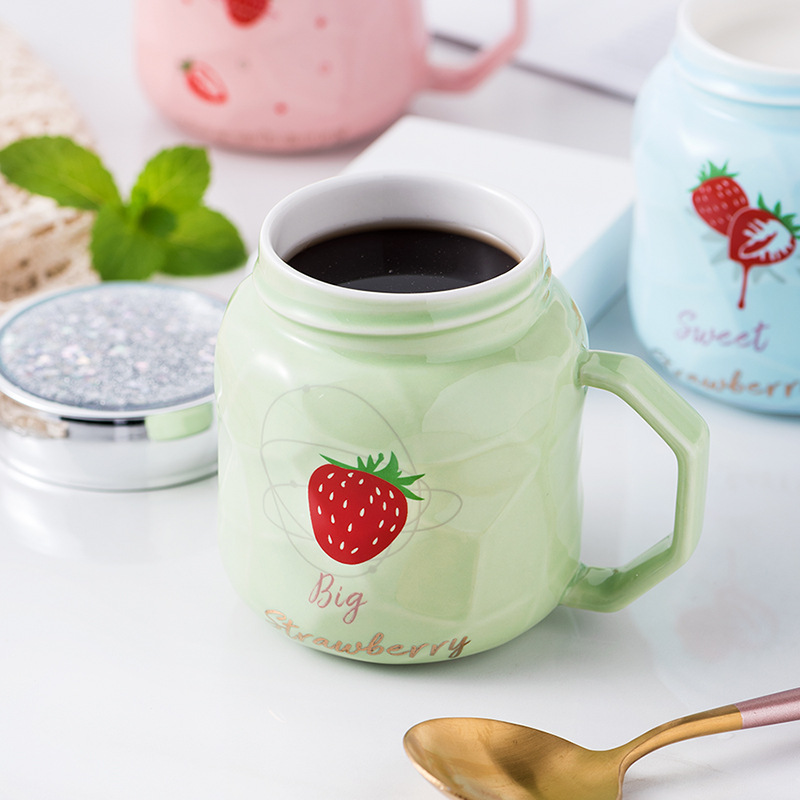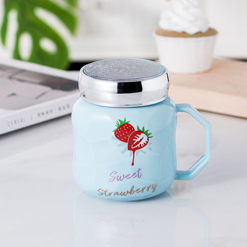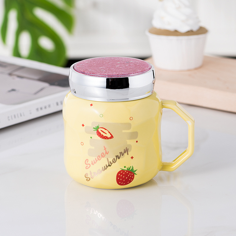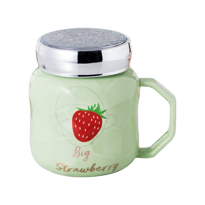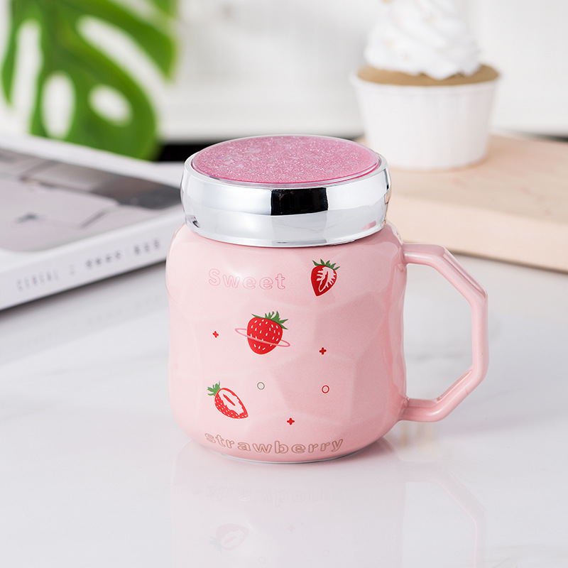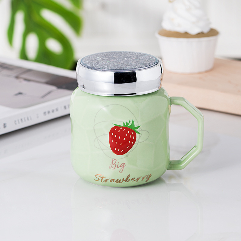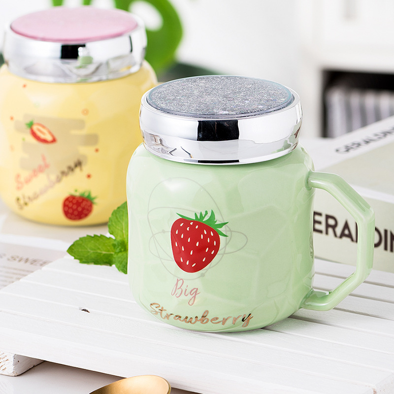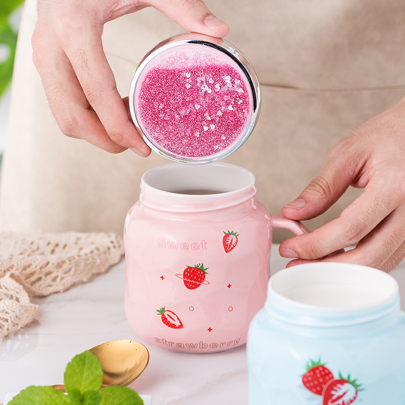 草莓系列创意办公室陶瓷镜面杯带流沙盖子马克杯制作logo实用礼品