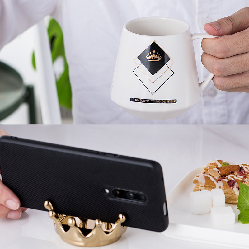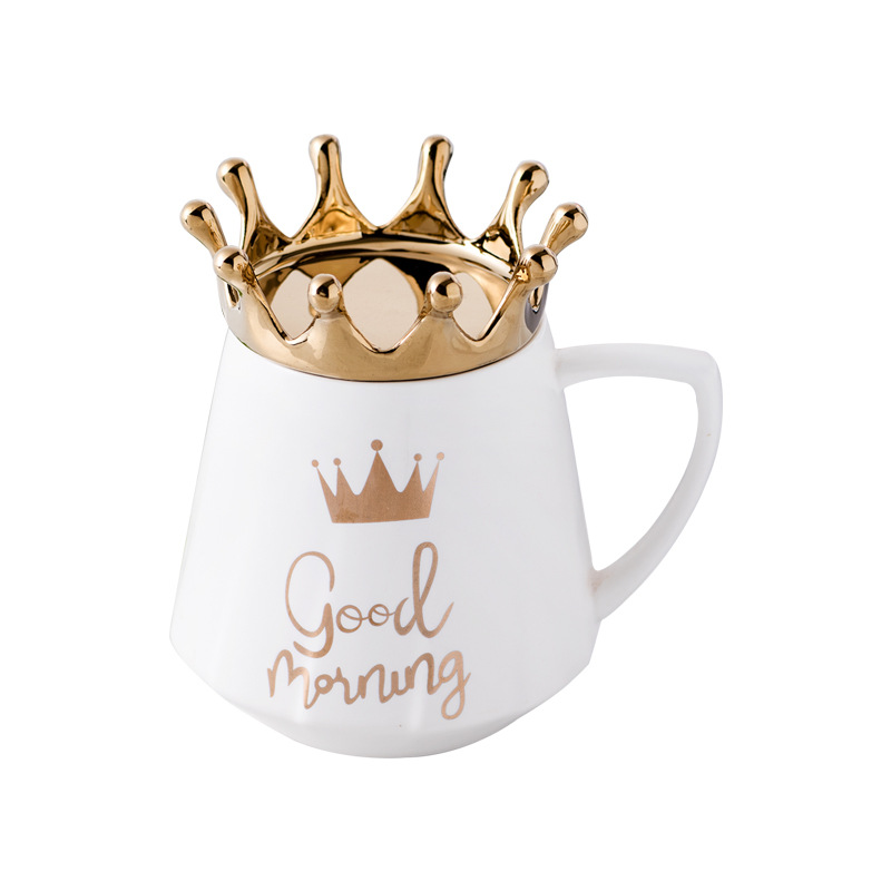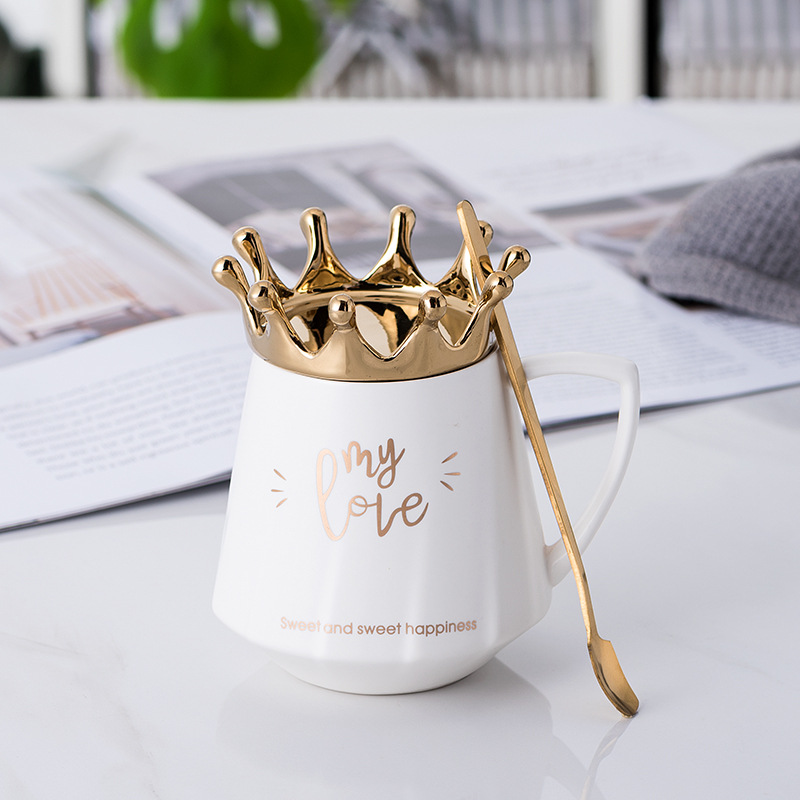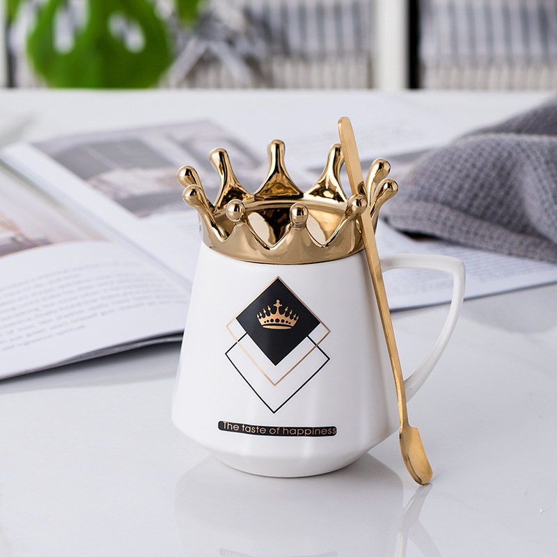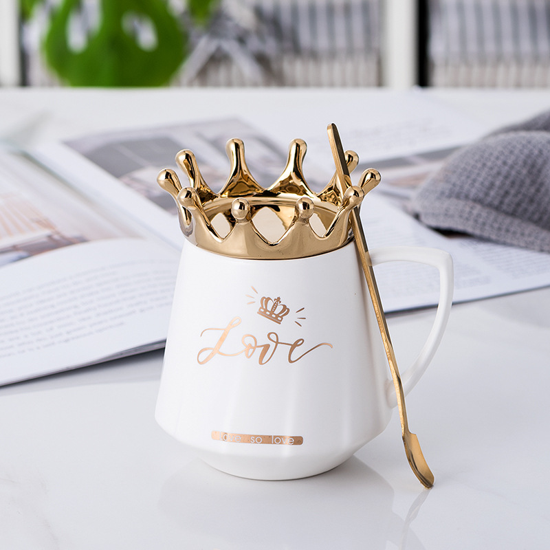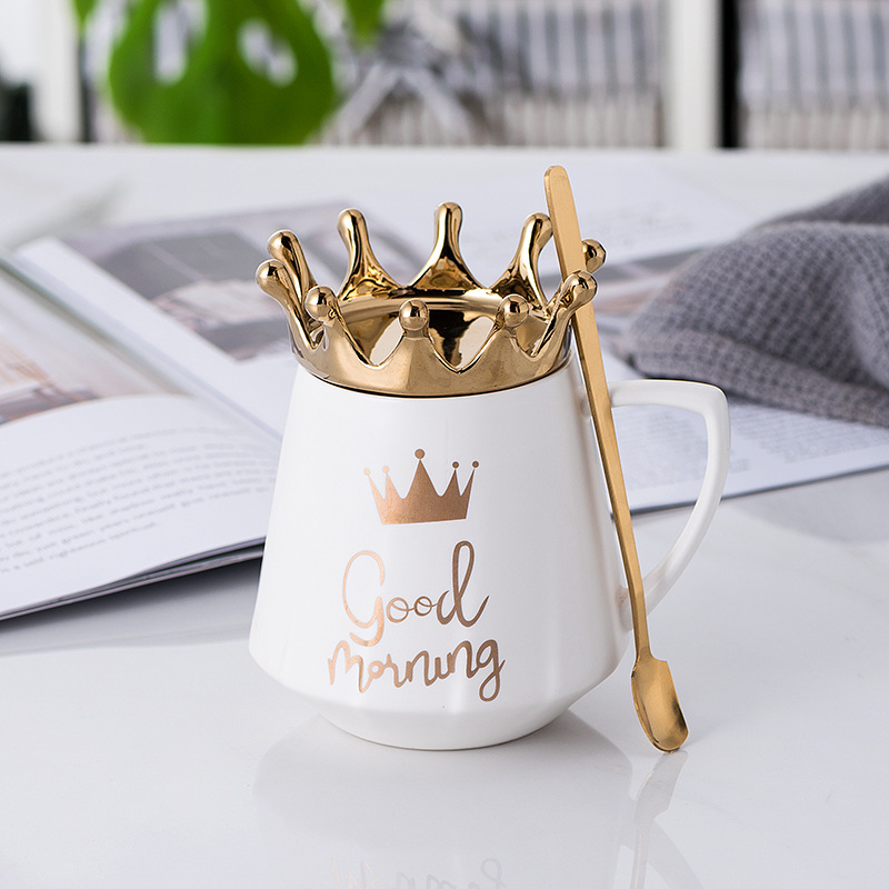 轻奢北欧皇冠陶瓷杯带盖马克杯礼品杯镀金个性咖啡杯情侣牛奶杯