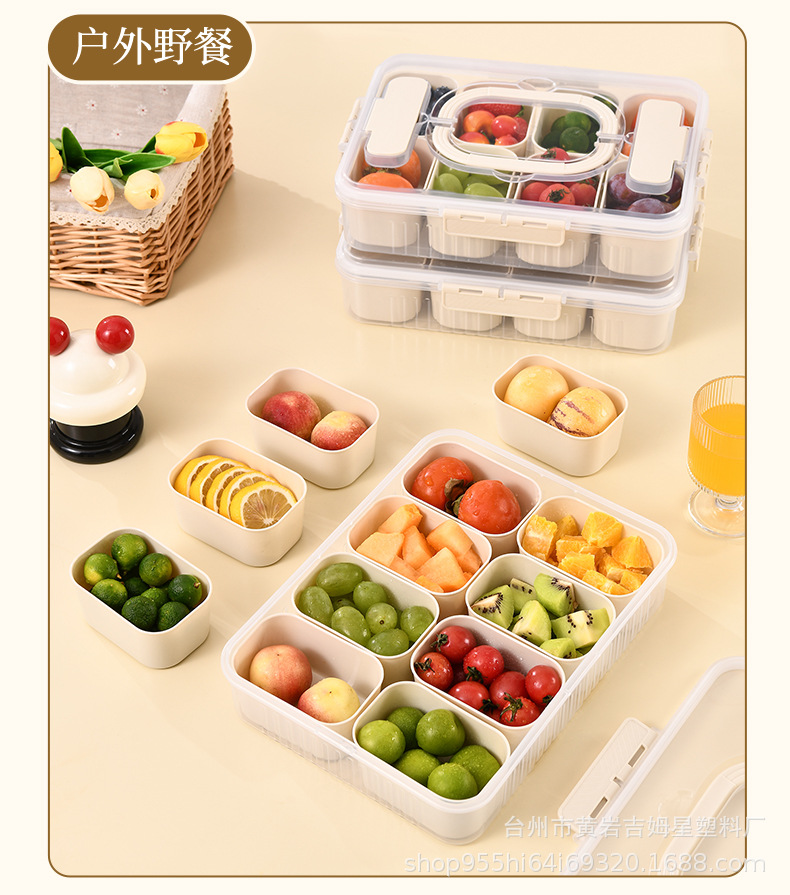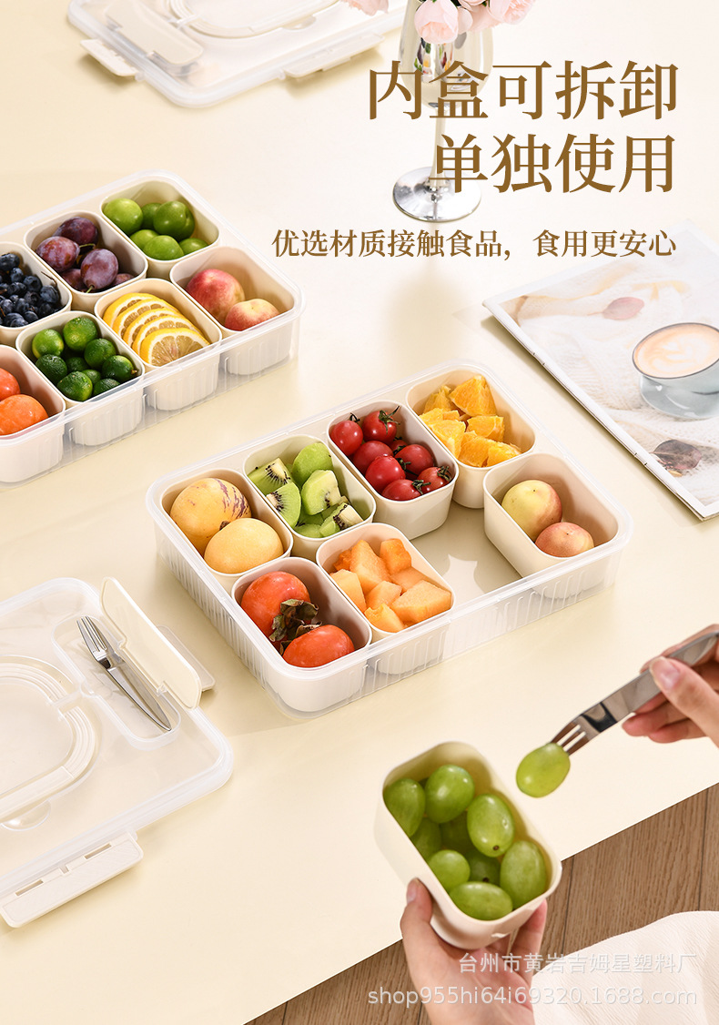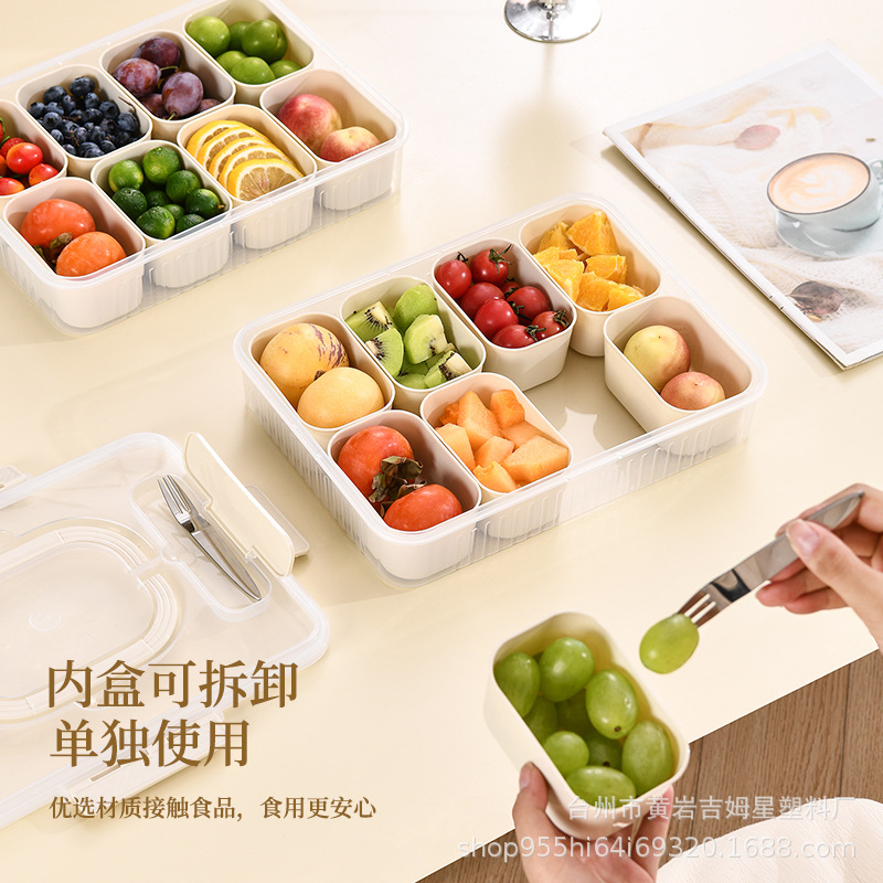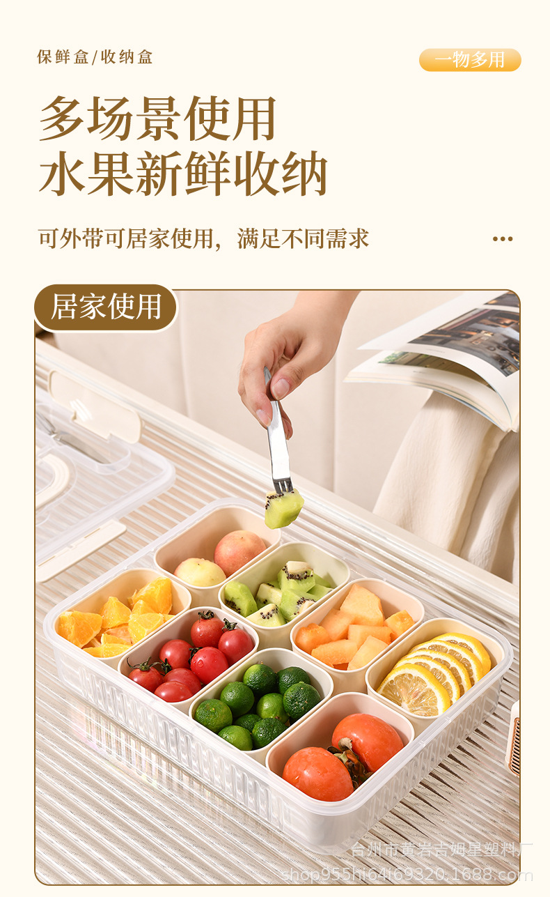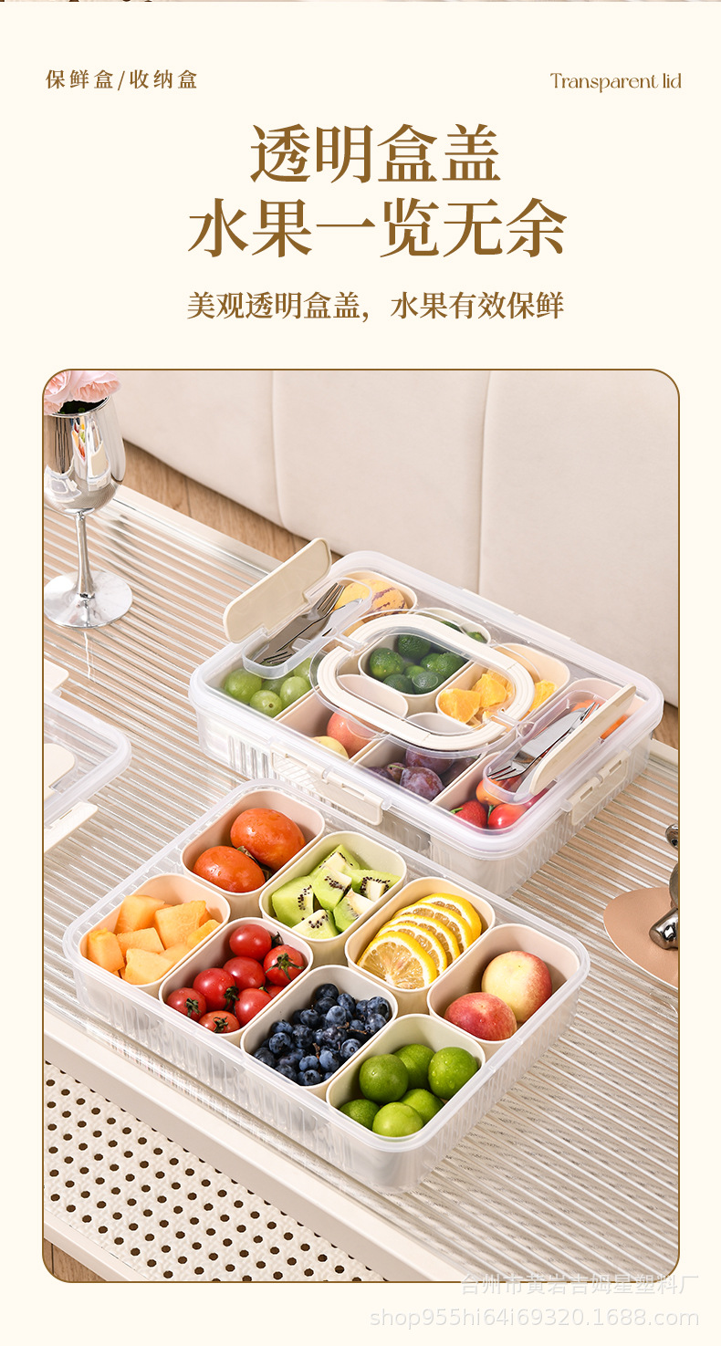 手提八分格透明保鲜盒带四个叉户外野餐带盖水果保鲜盒食品级分格