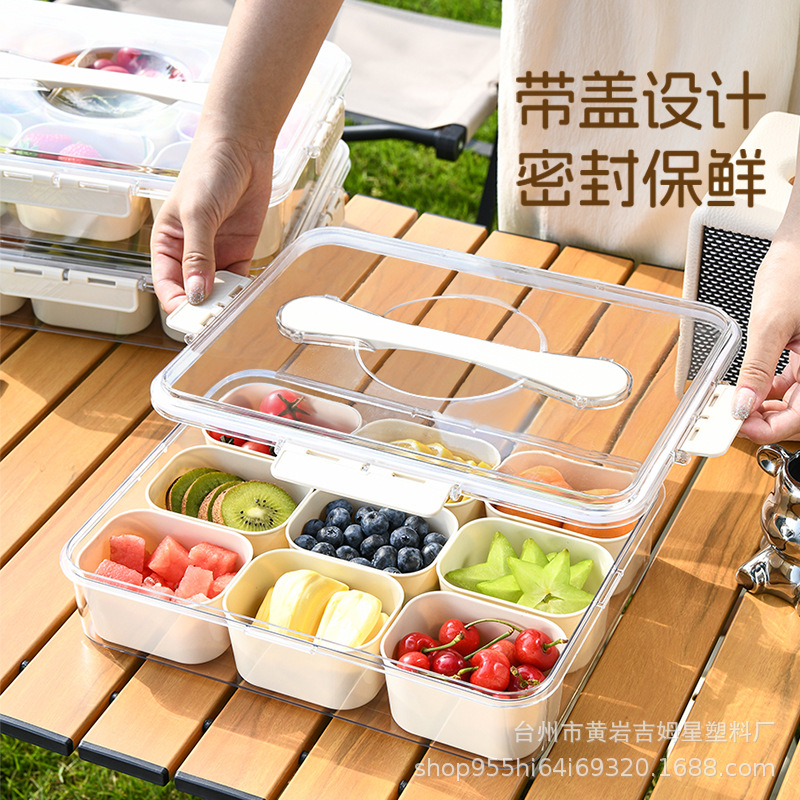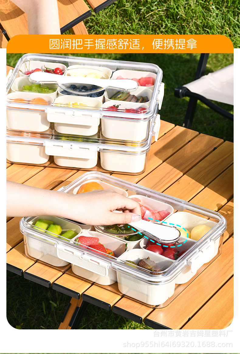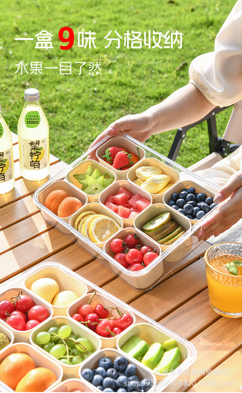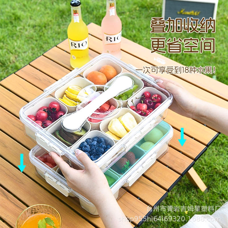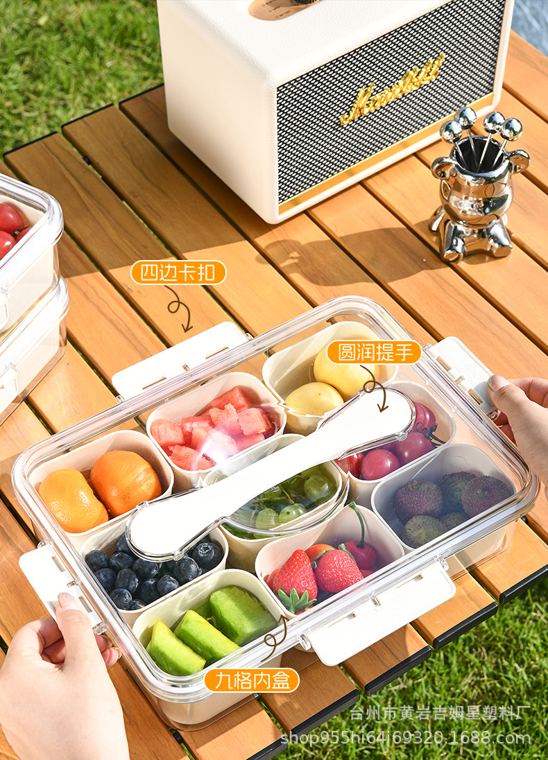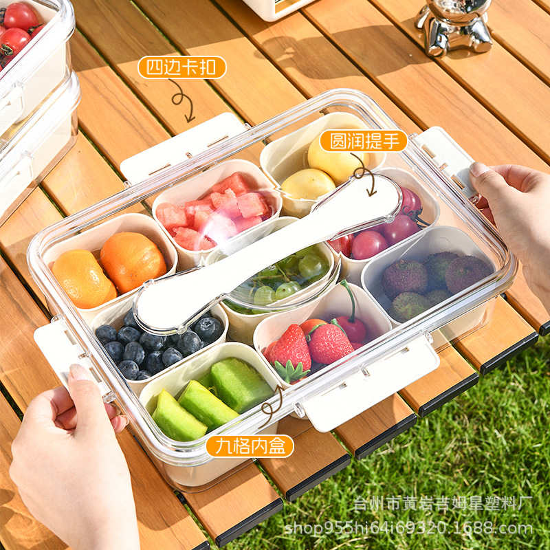手提食品级分格式透明九宫格水果收纳盒塑料厨房密封沙拉叠加保鲜