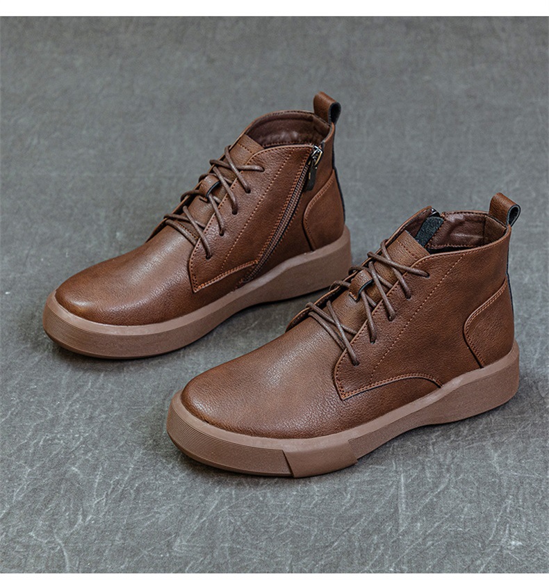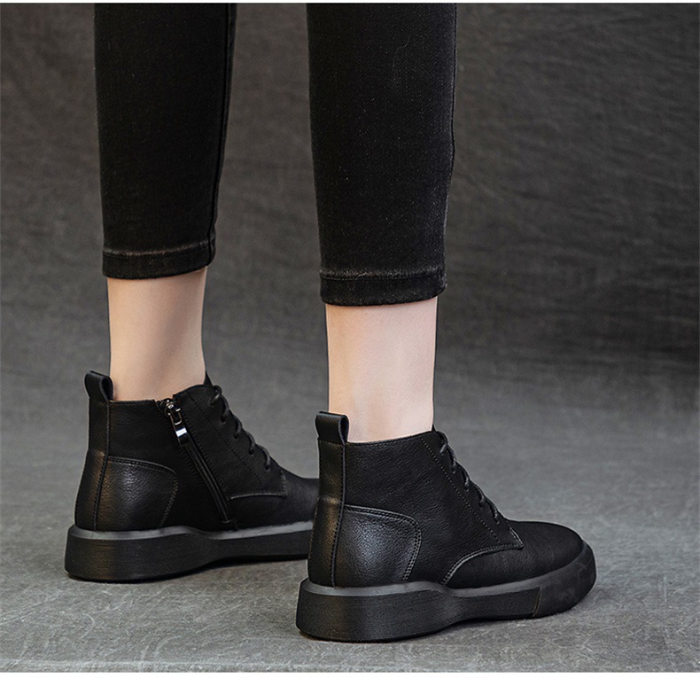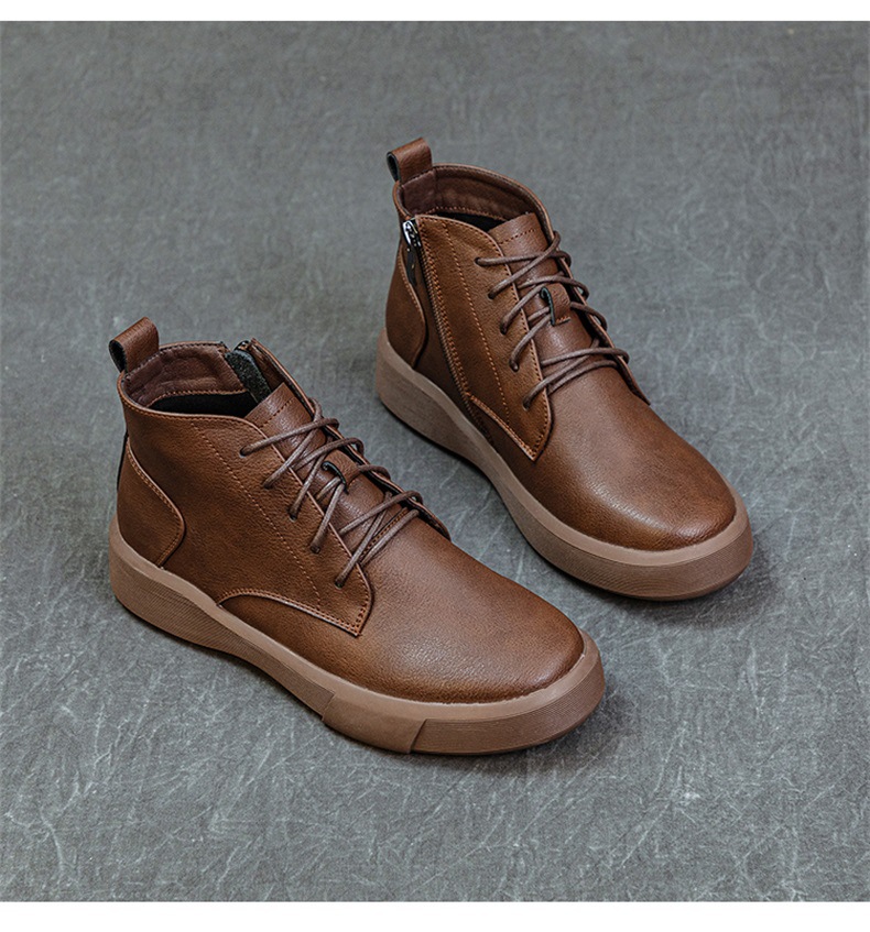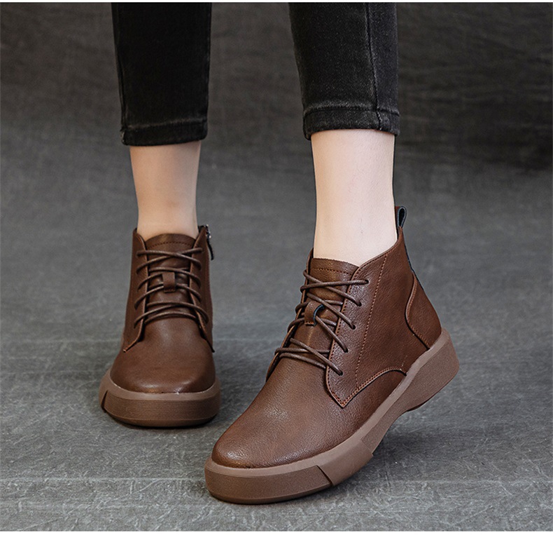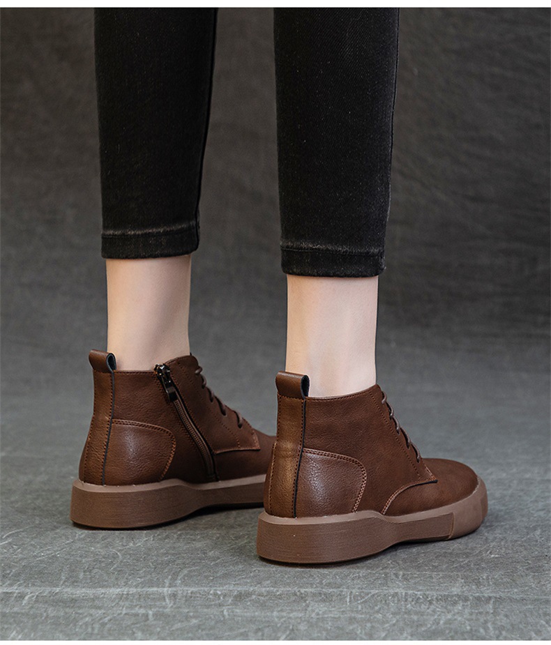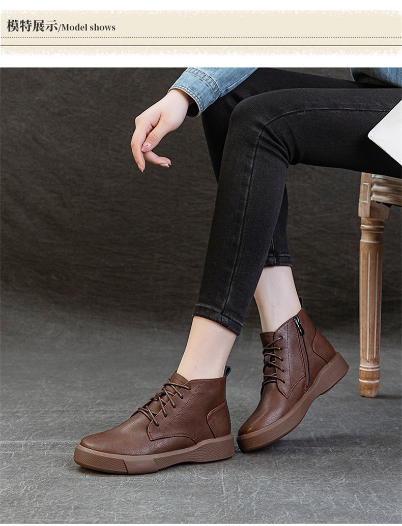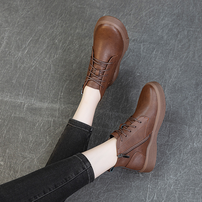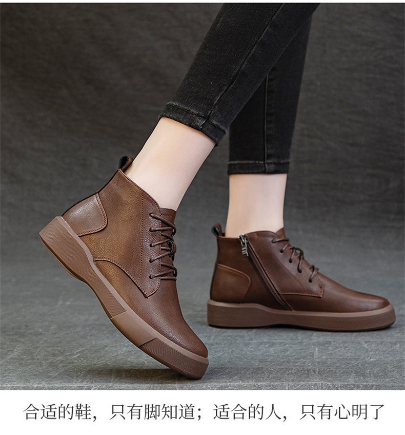 春秋冬季真皮厚底马丁靴女复古加绒圆头短靴休闲透气低筒靴子棕色