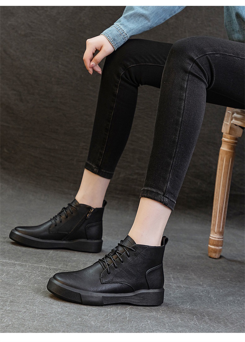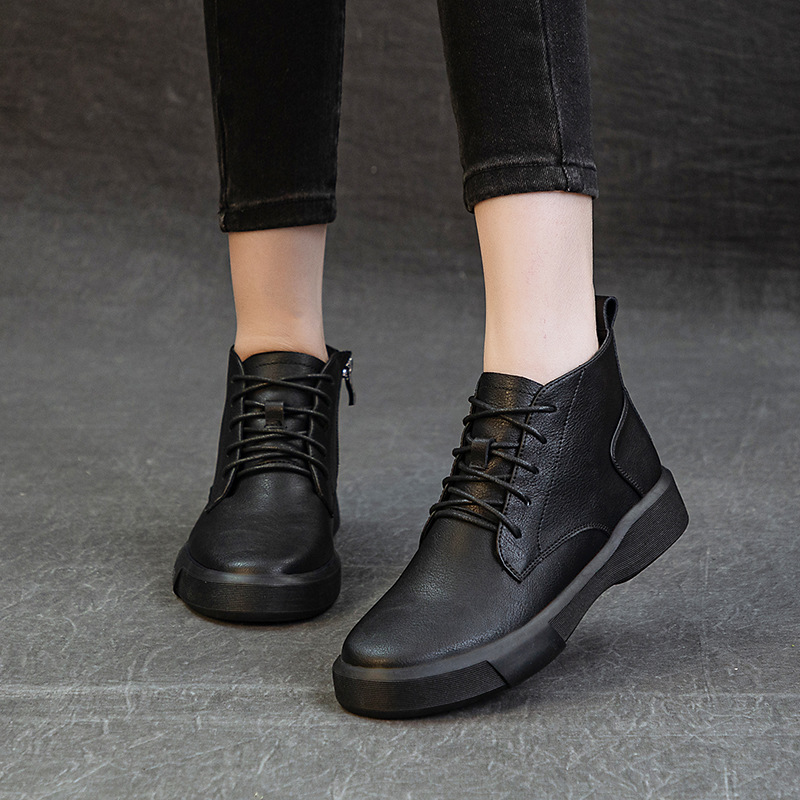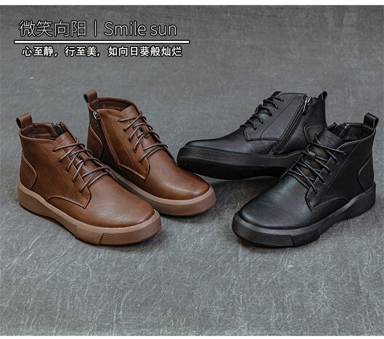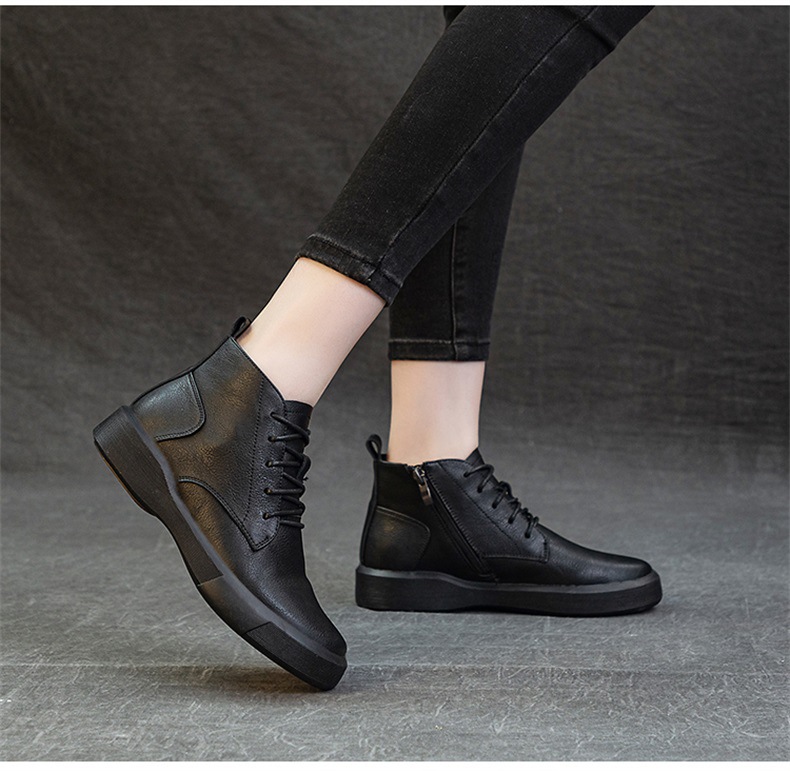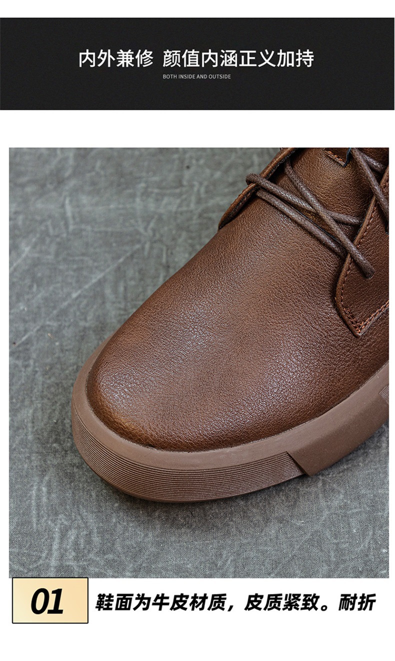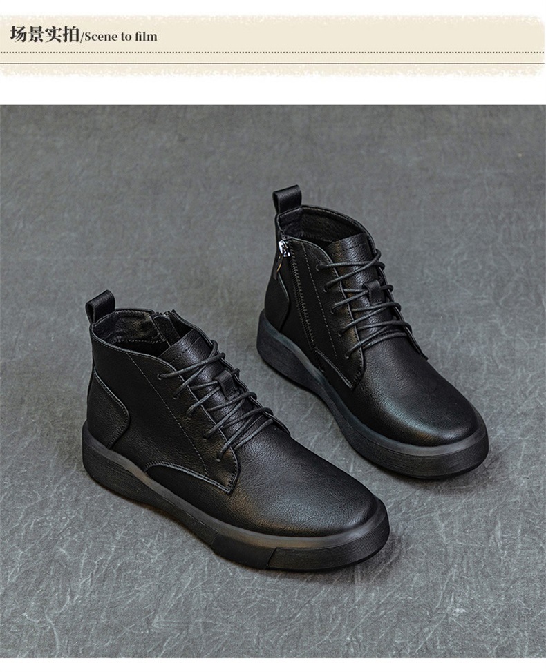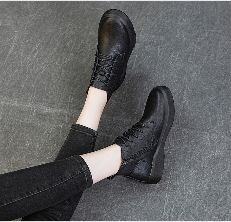 春秋冬季真皮厚底马丁靴女复古加绒圆头短靴休闲透气低筒靴子棕色