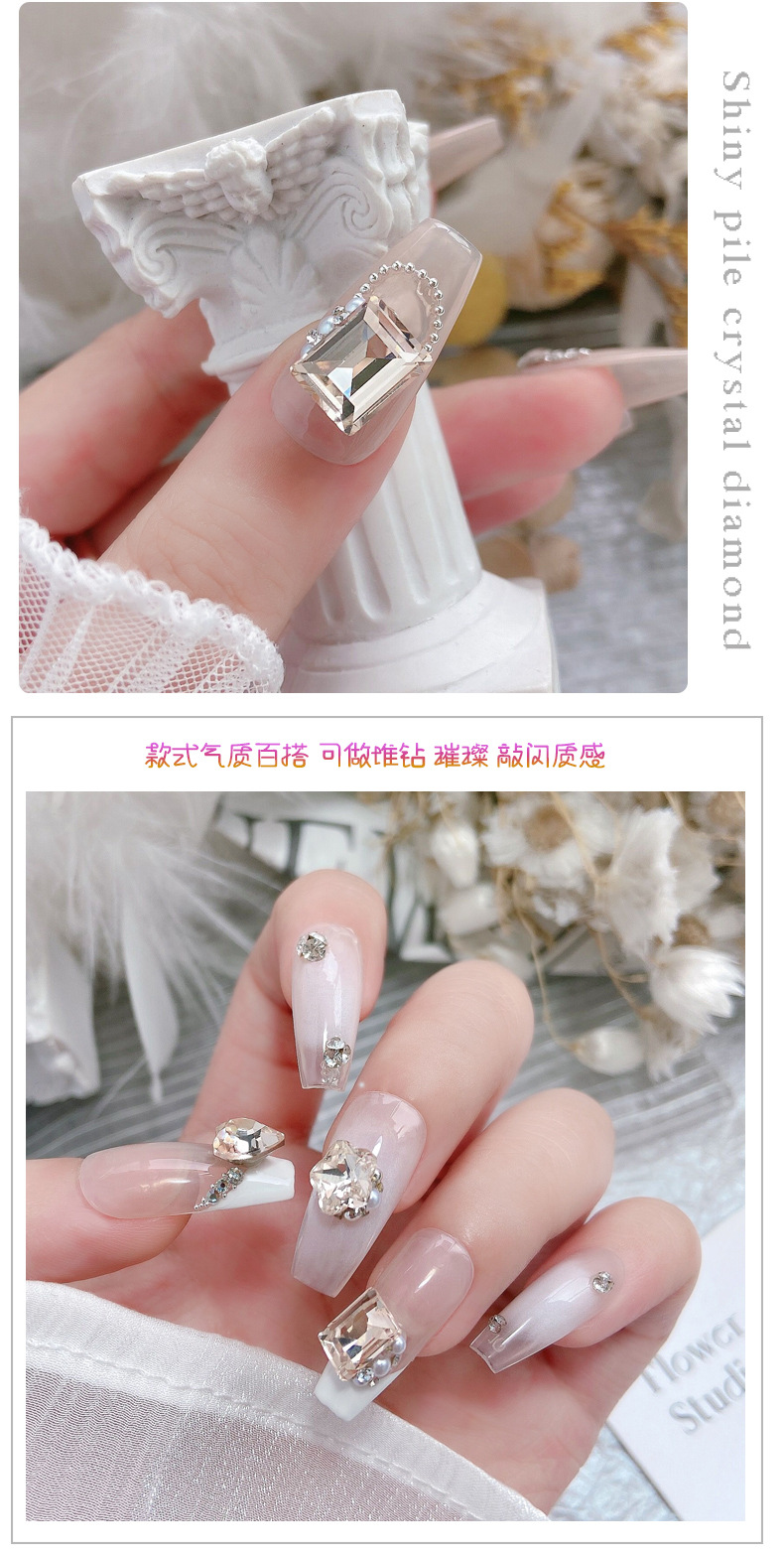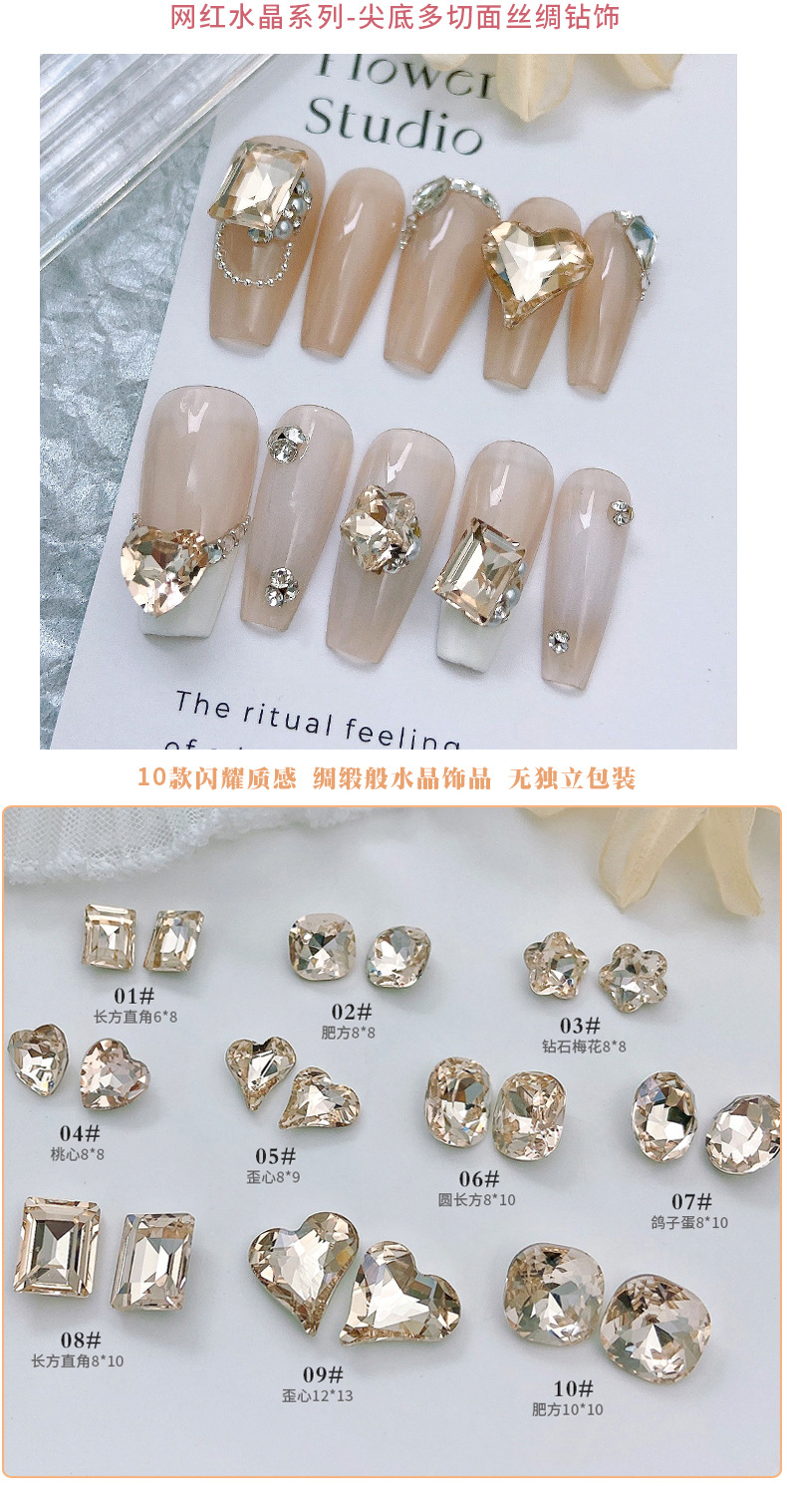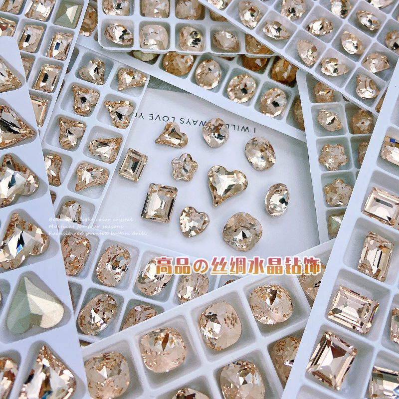 新款美甲丝绸高品尖底指甲钻超闪浅香槟异形歪心冰糖肥方水晶钻饰