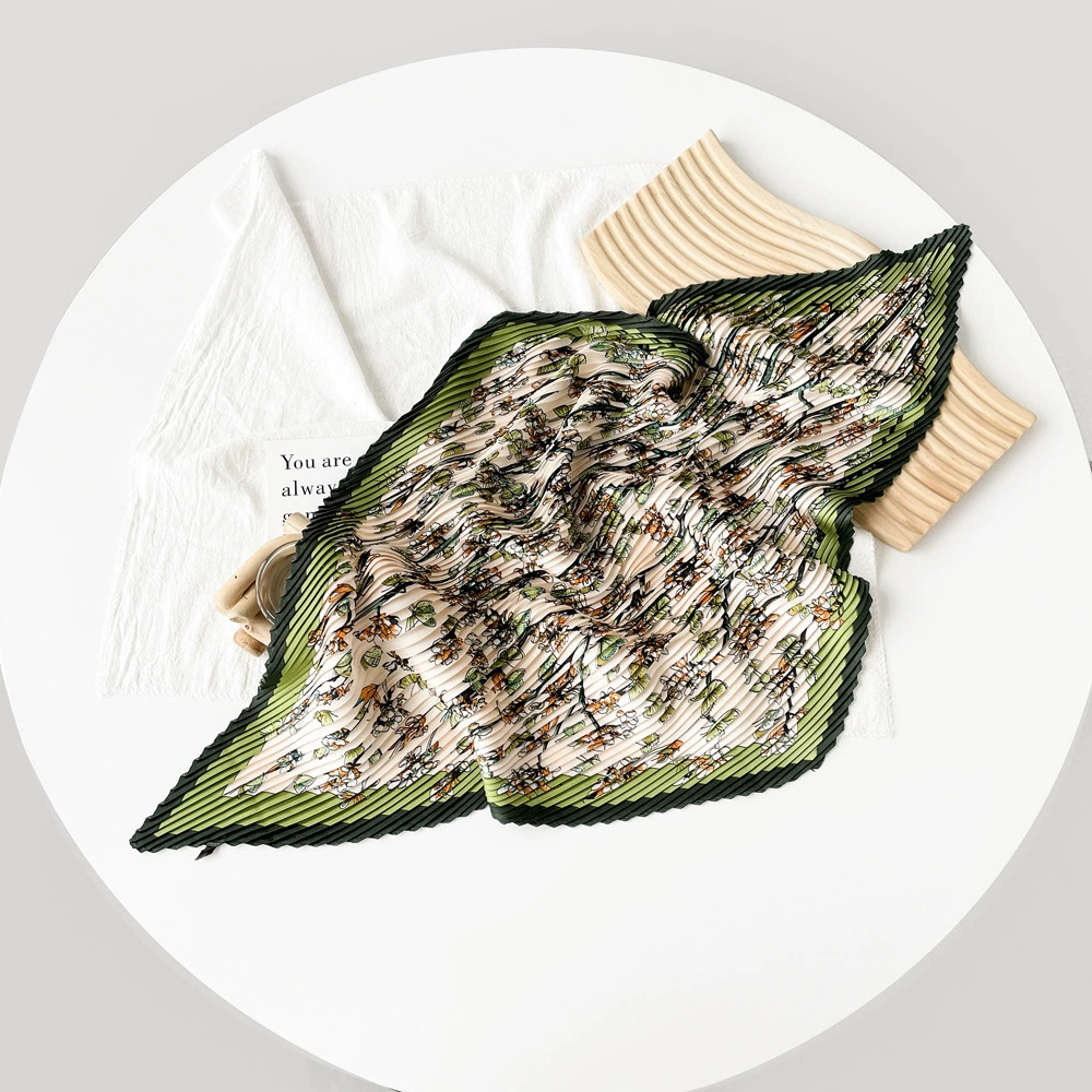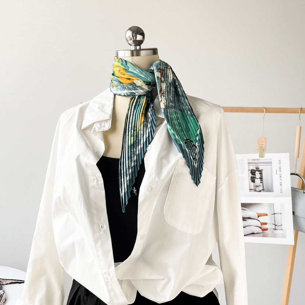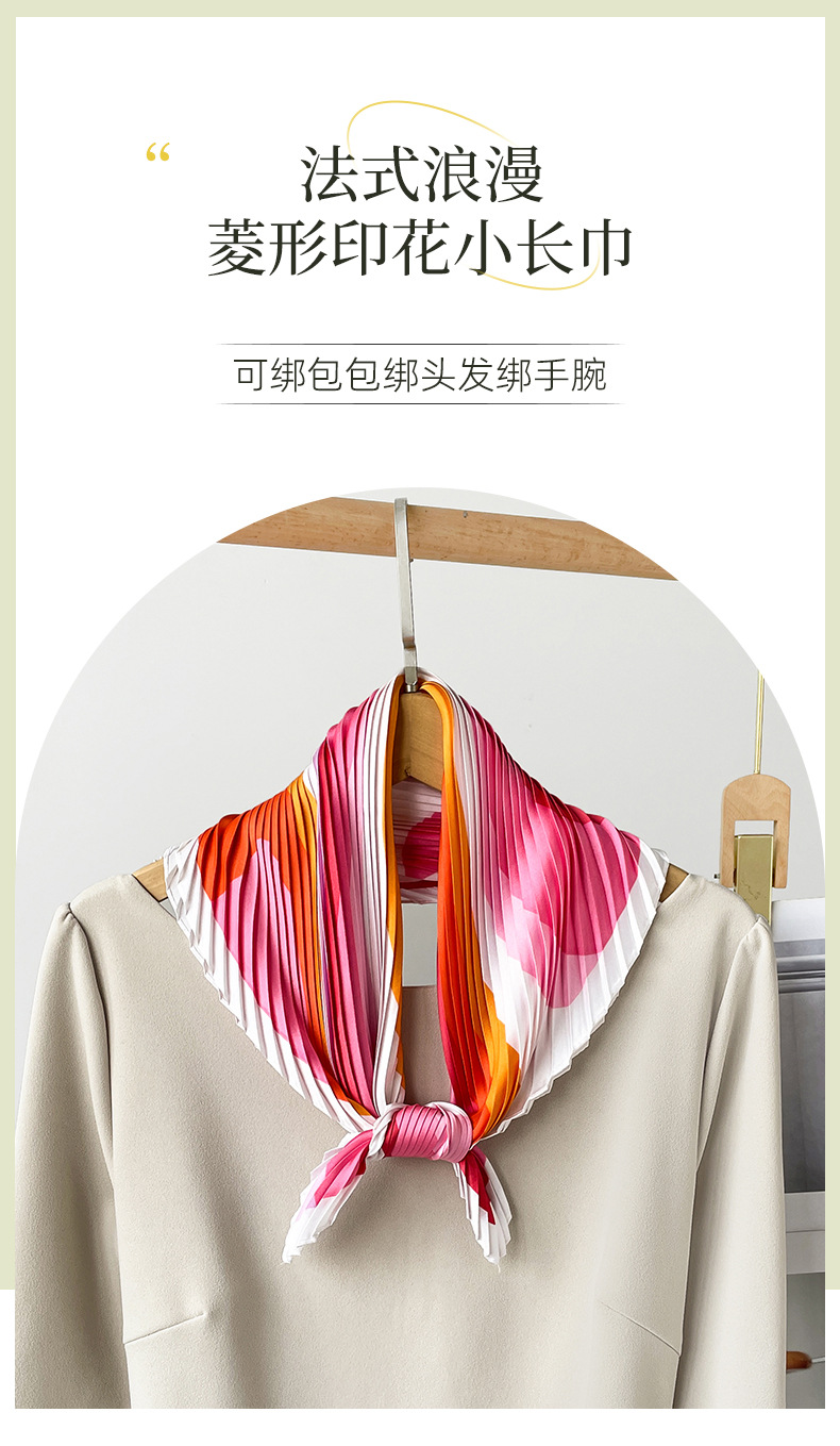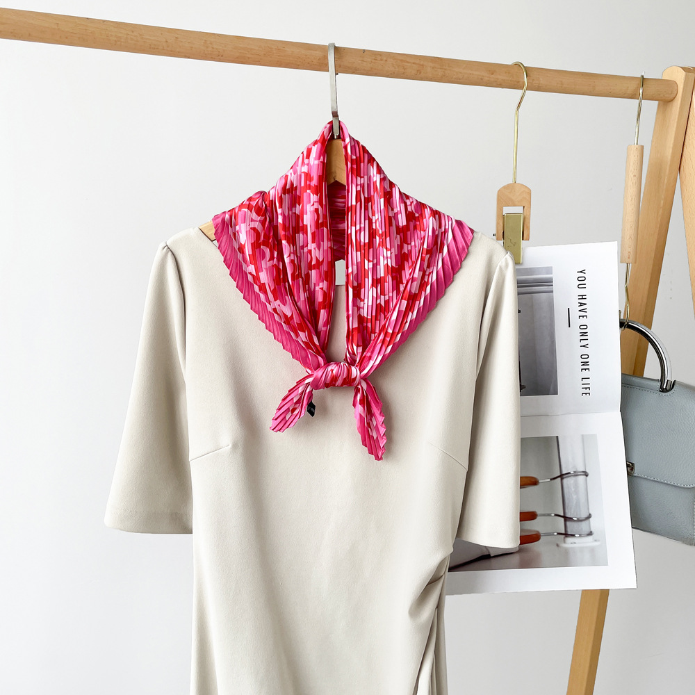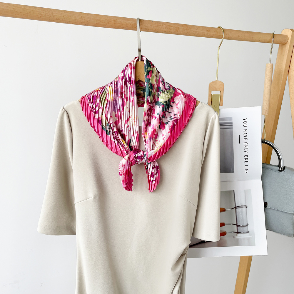 新款褶皱丝巾小方巾70cm印花小丝巾女士新款领巾缎面压褶围巾批发