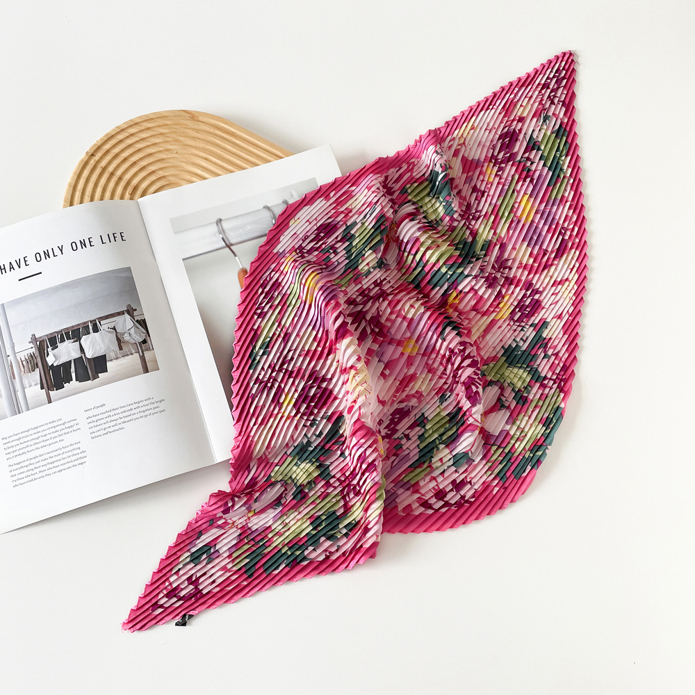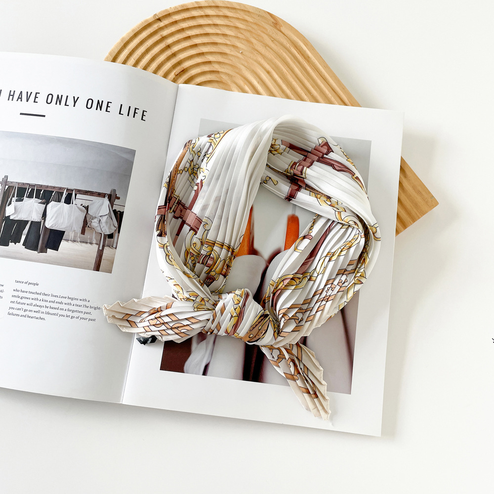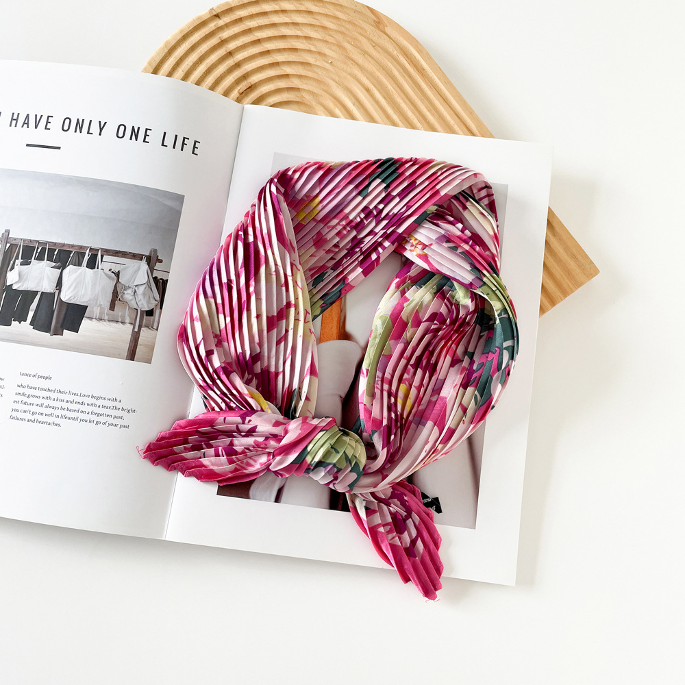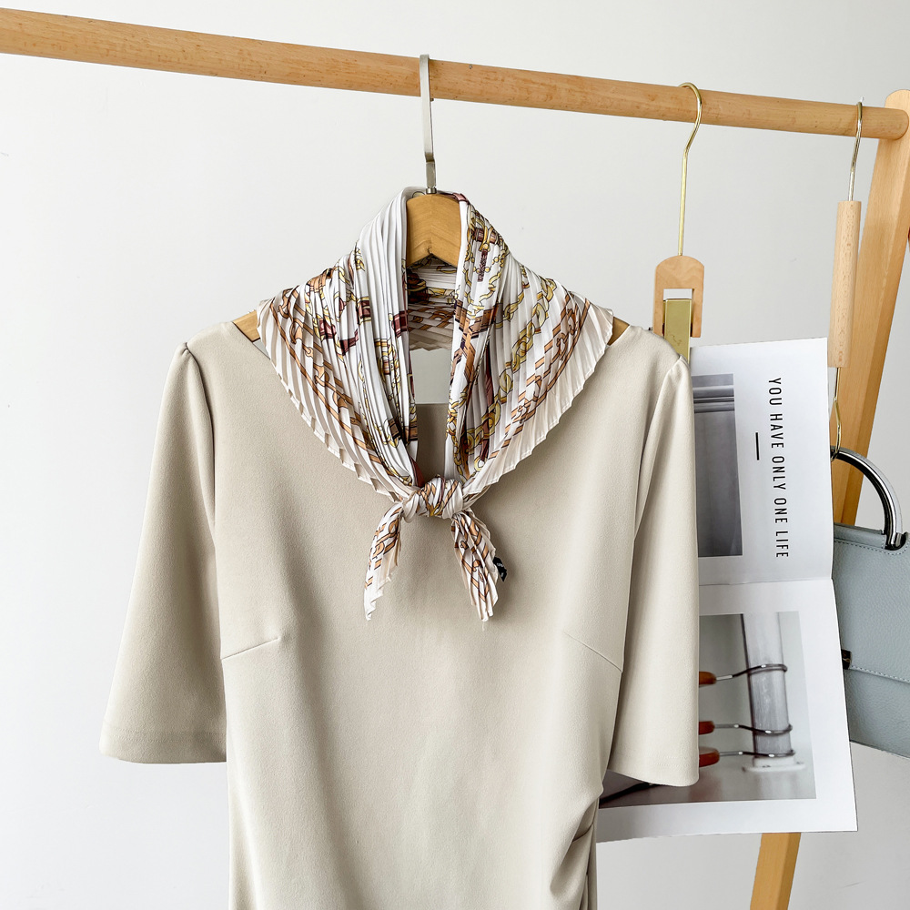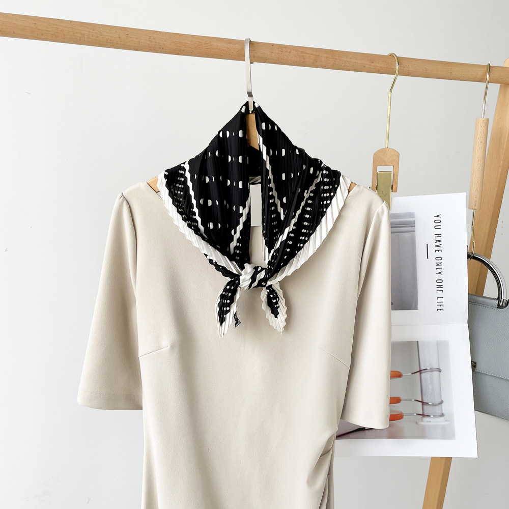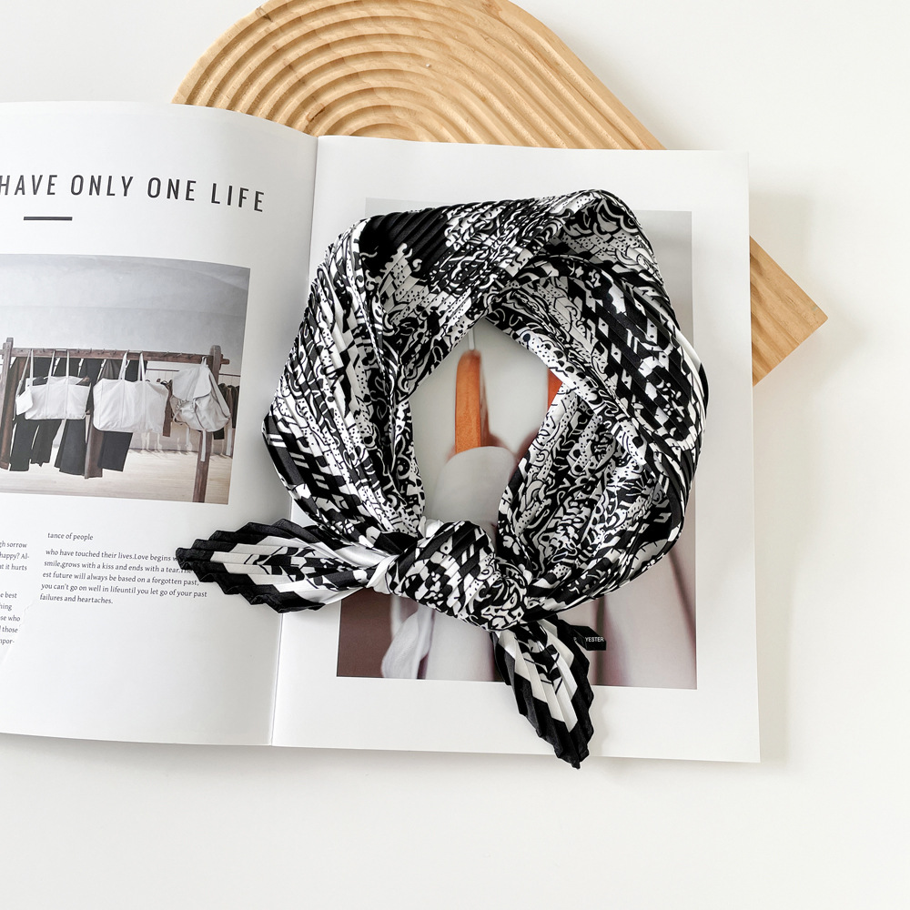 新款褶皱丝巾小方巾70cm印花小丝巾女士新款领巾缎面压褶围巾批发