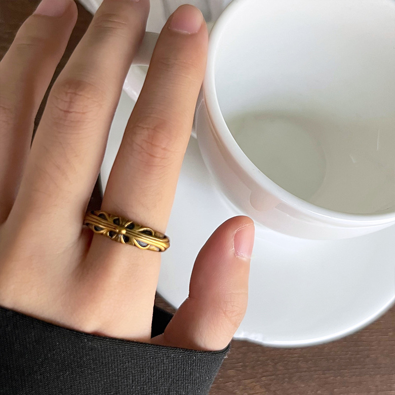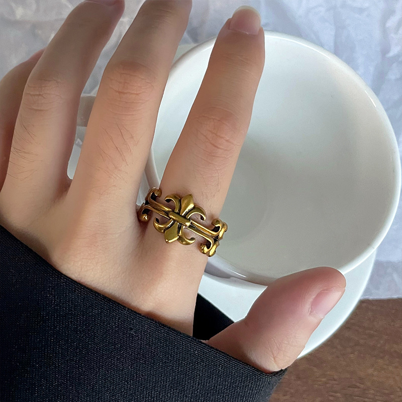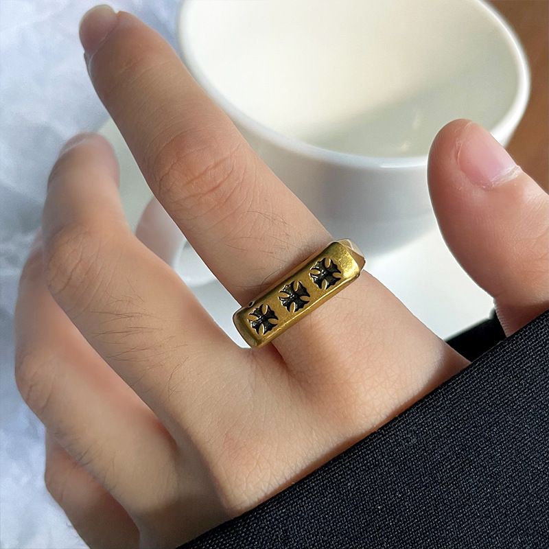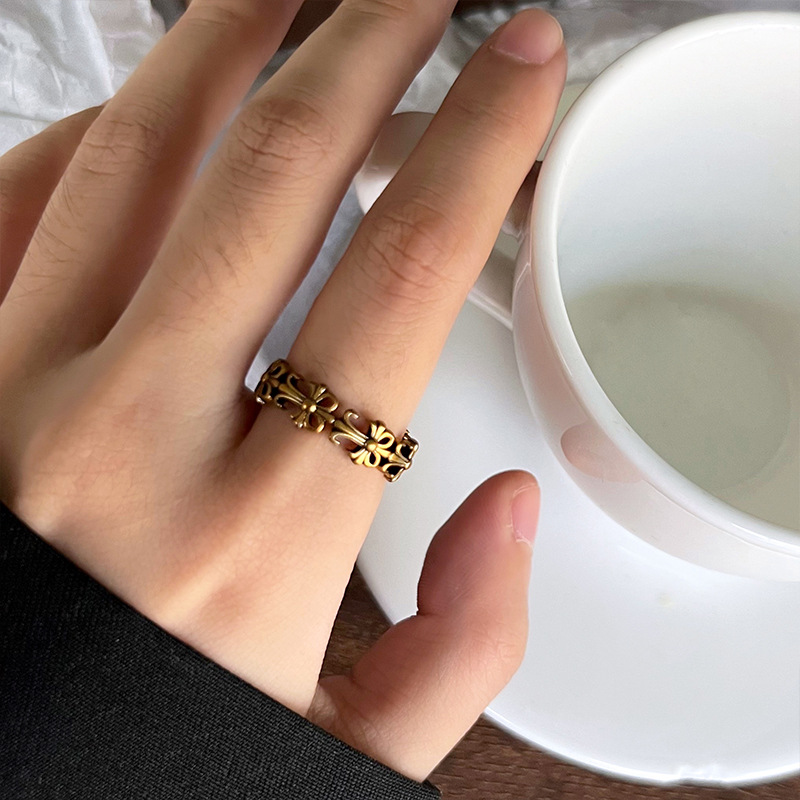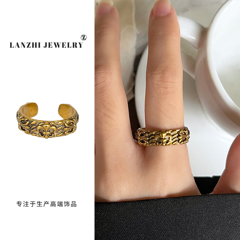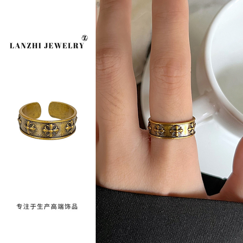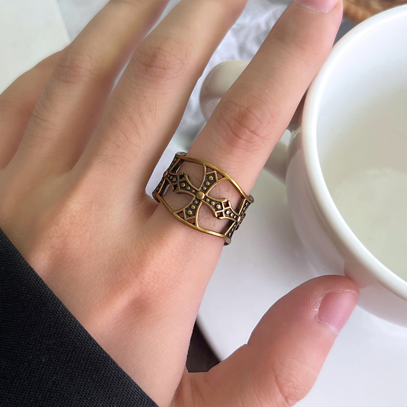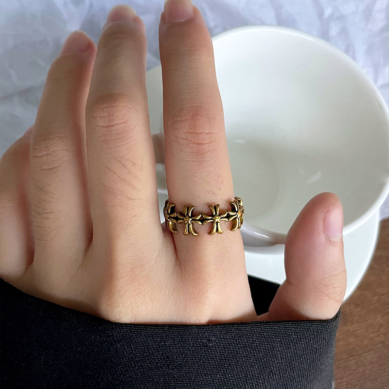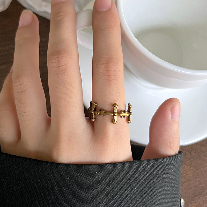 岚芷十字架复古做旧高级感古金戒指女开口指环轻奢小众港风饰品男
