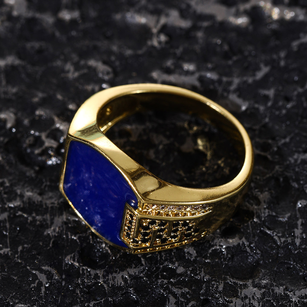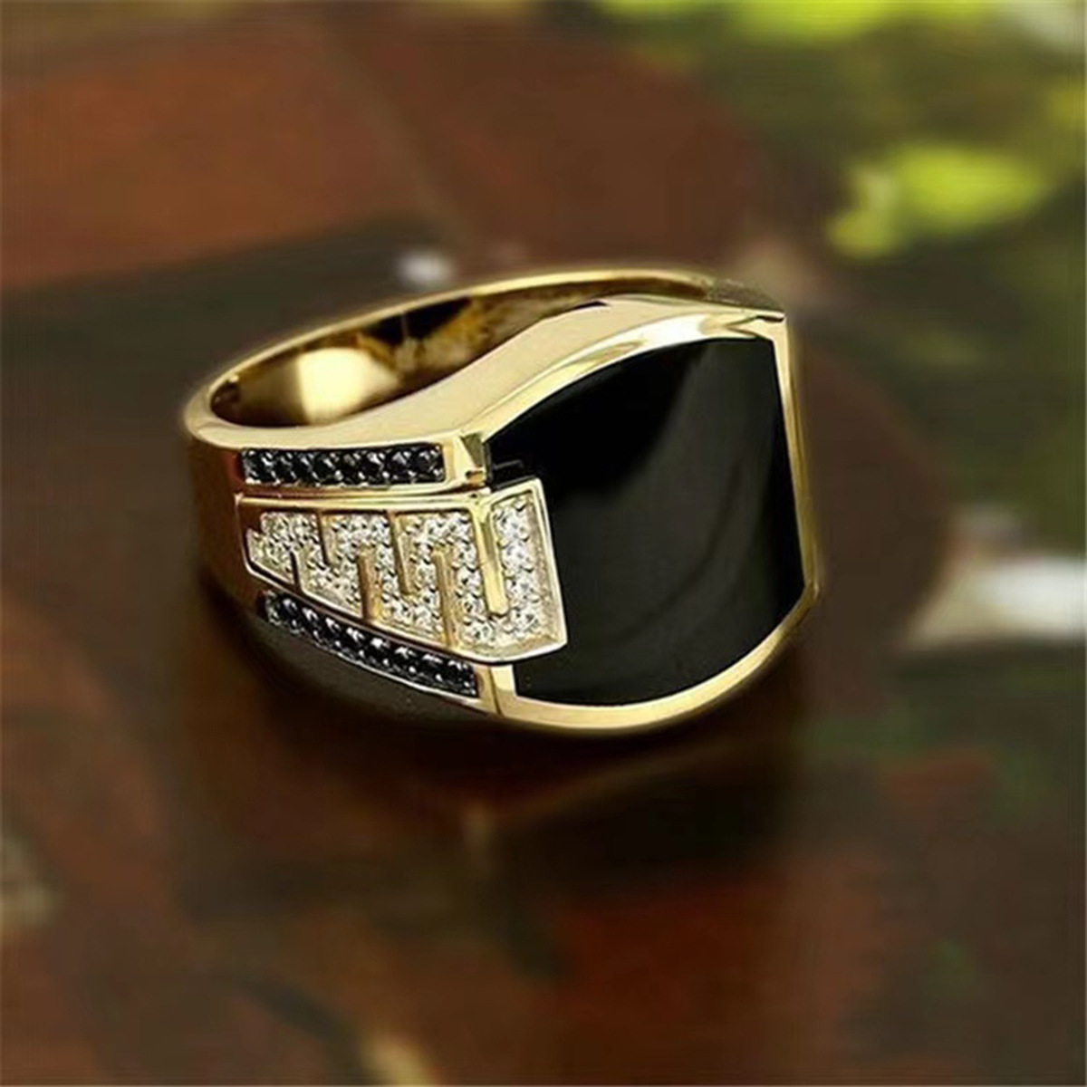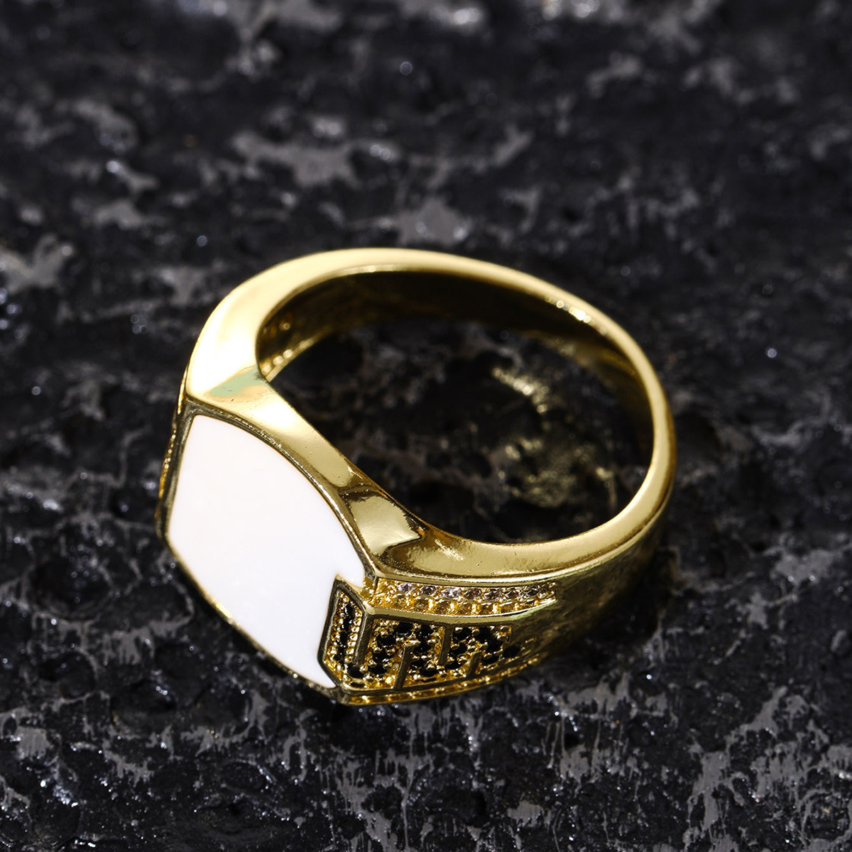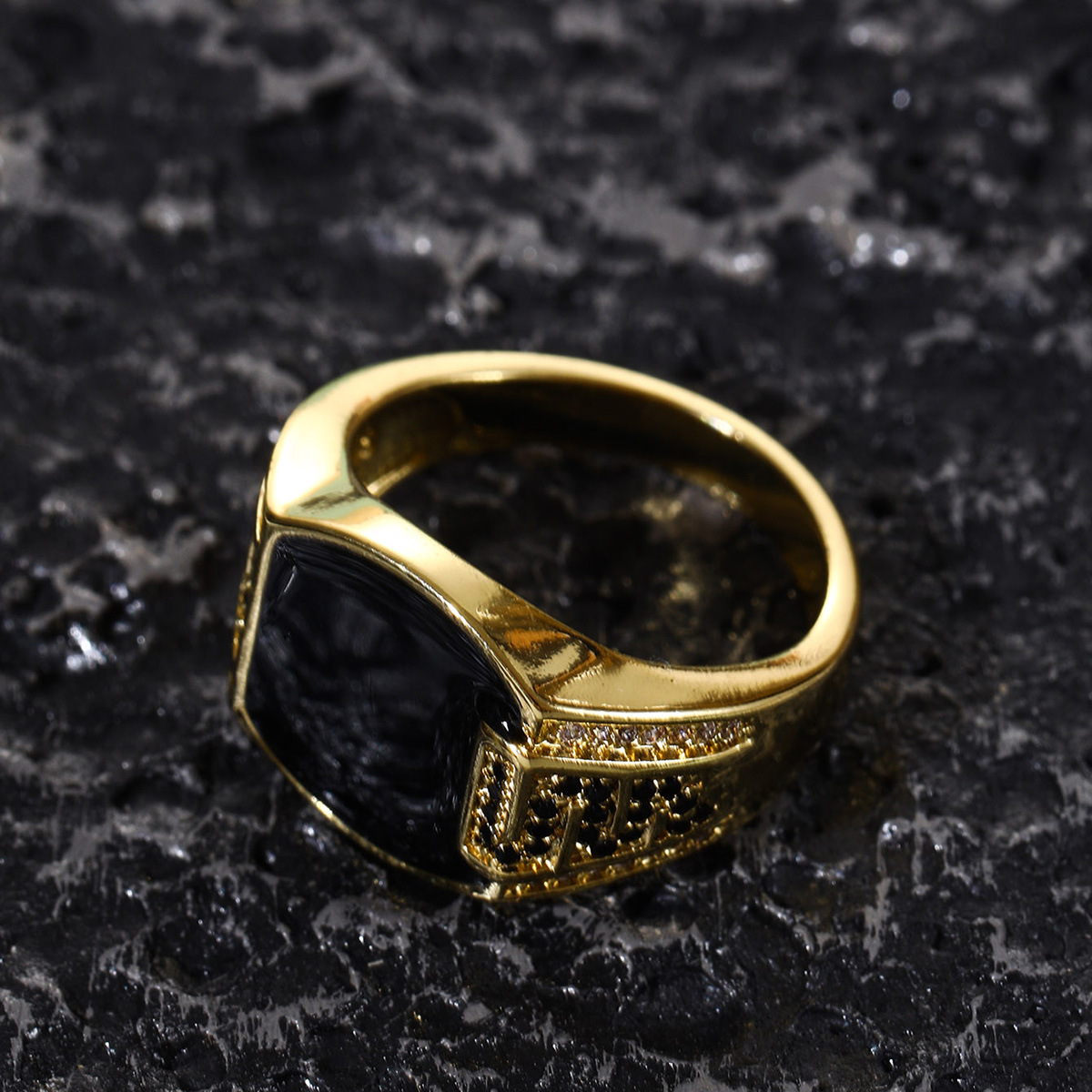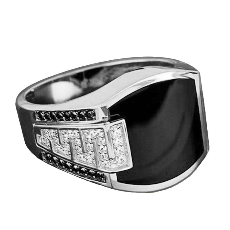欧美嘻哈风男士商务戒指黑钻珐琅微镶锆石仿真钻戒潮流男流行首饰