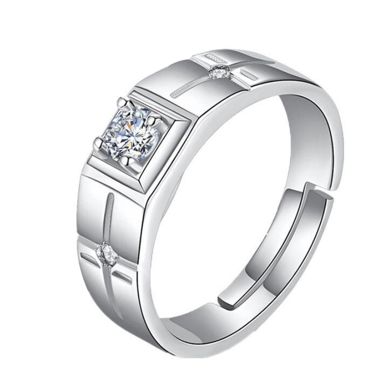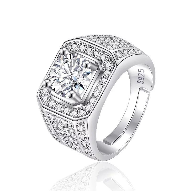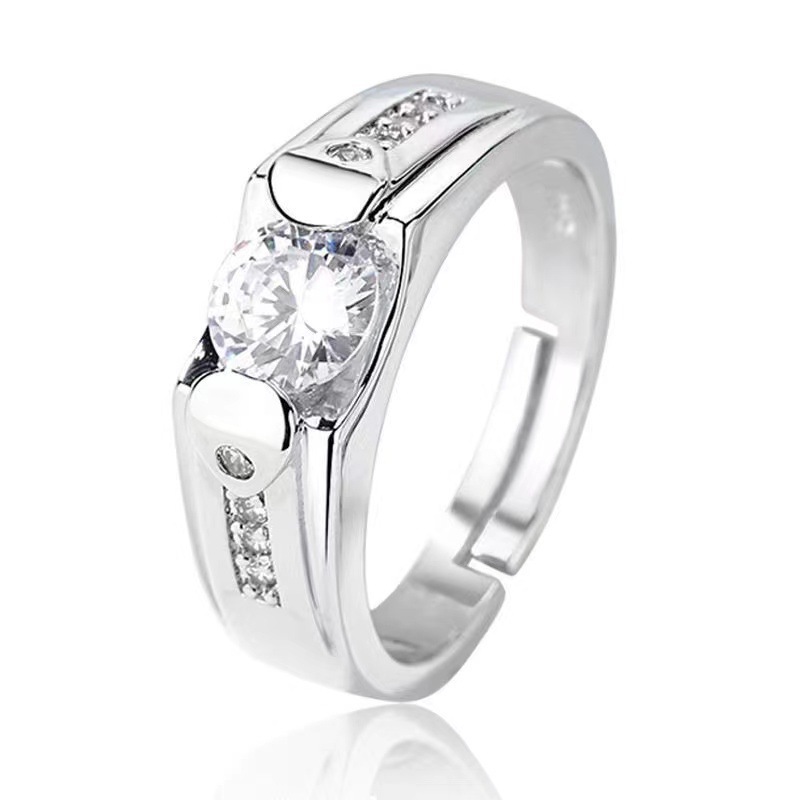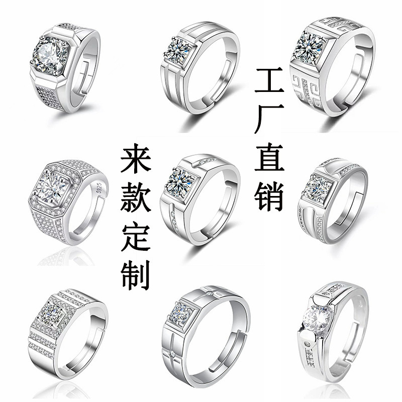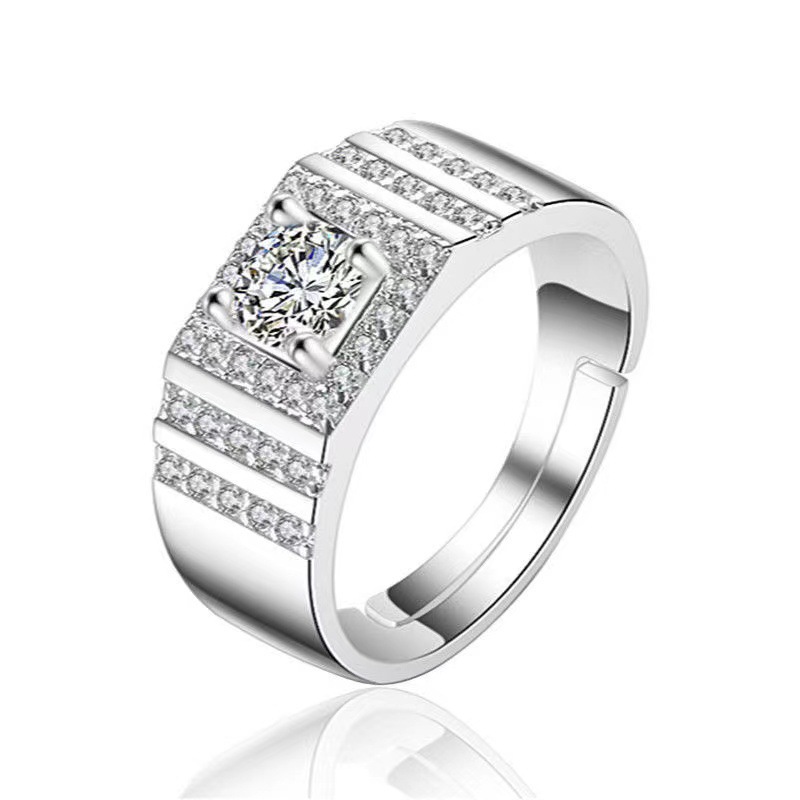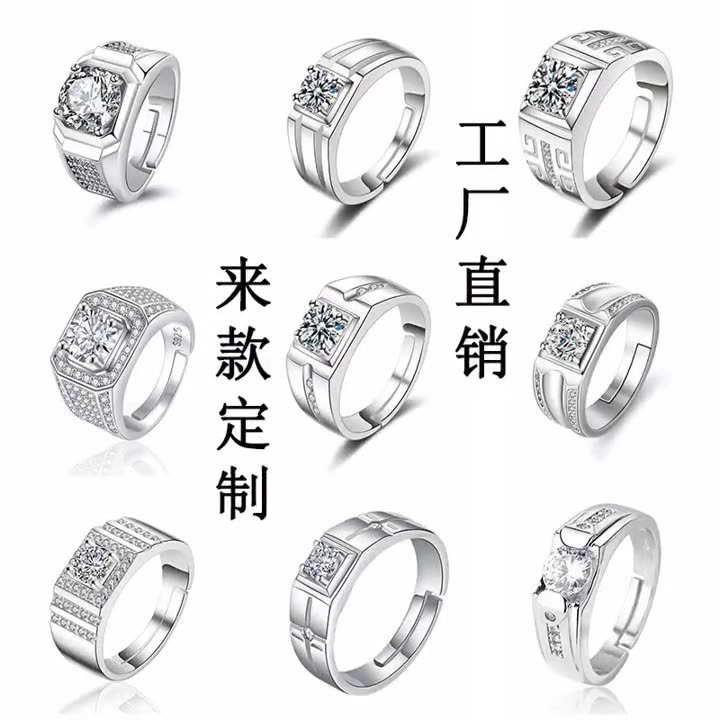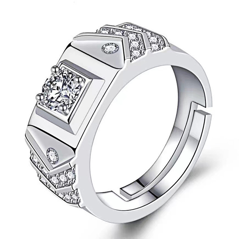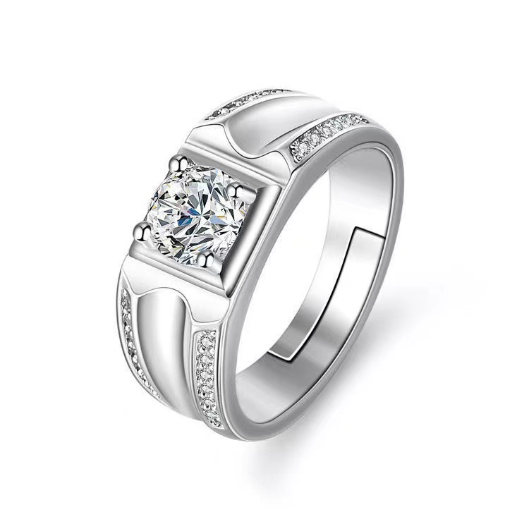大男戒指高级感镀白金一克拉钻戒工厂直销霸气男士开口可调节指环