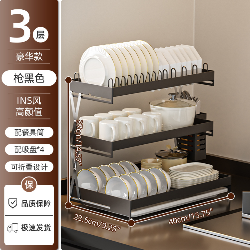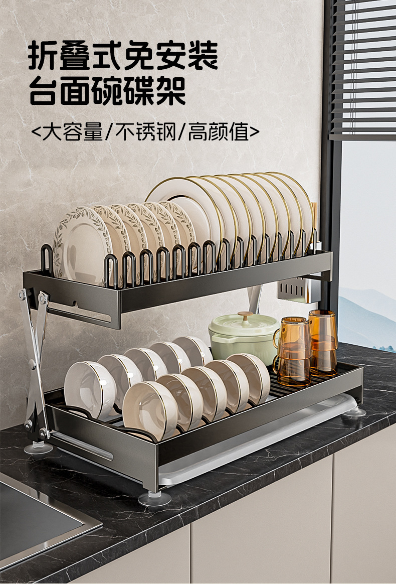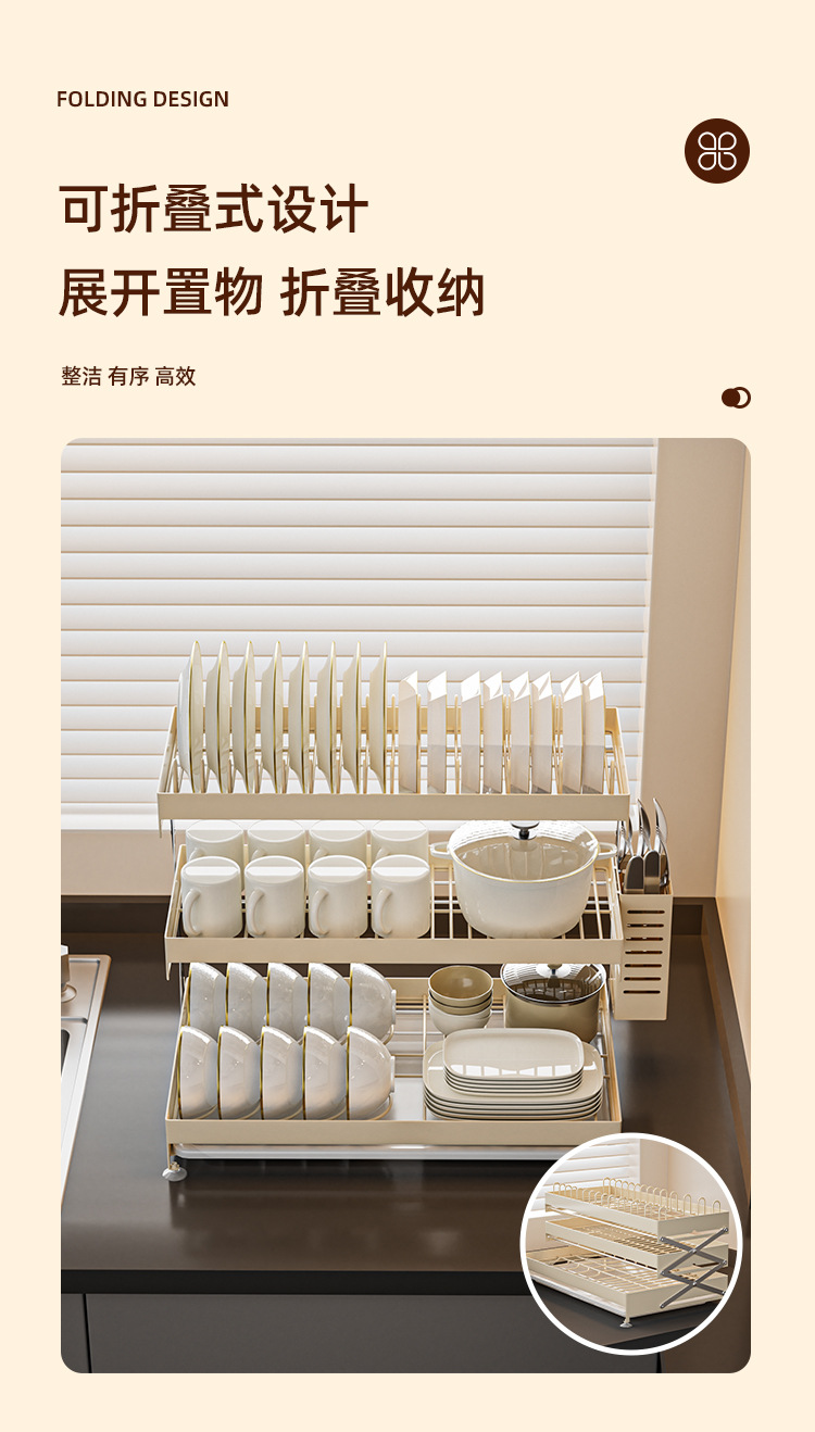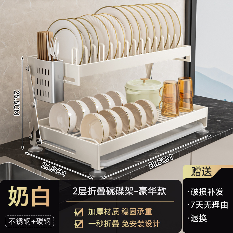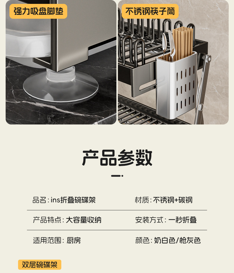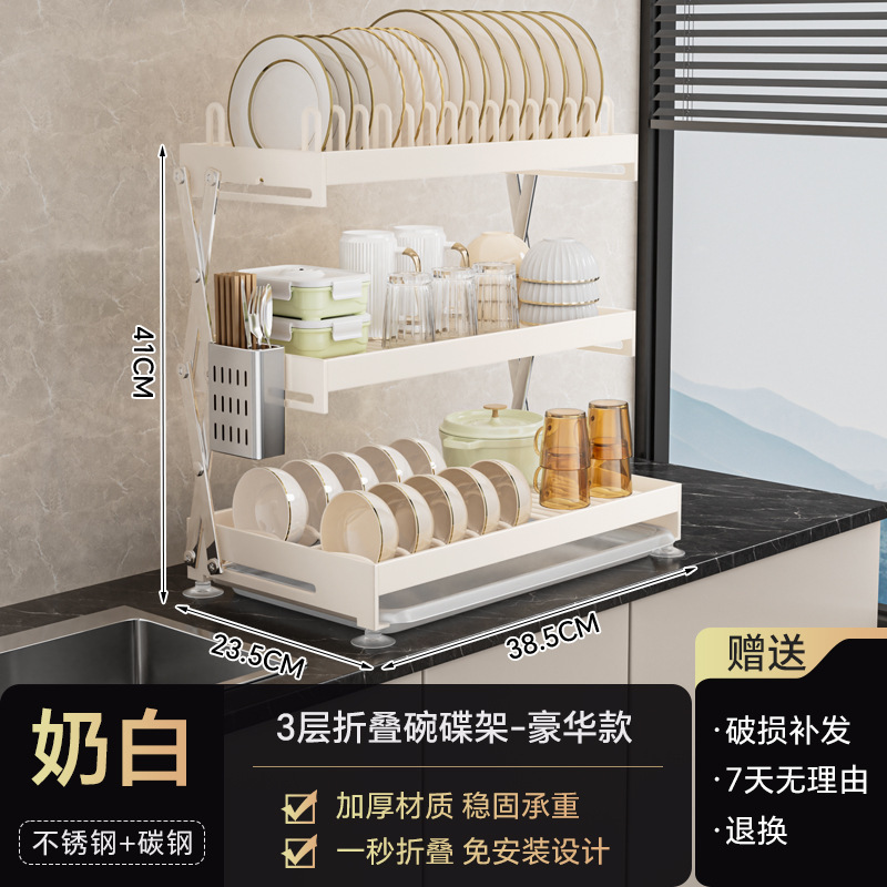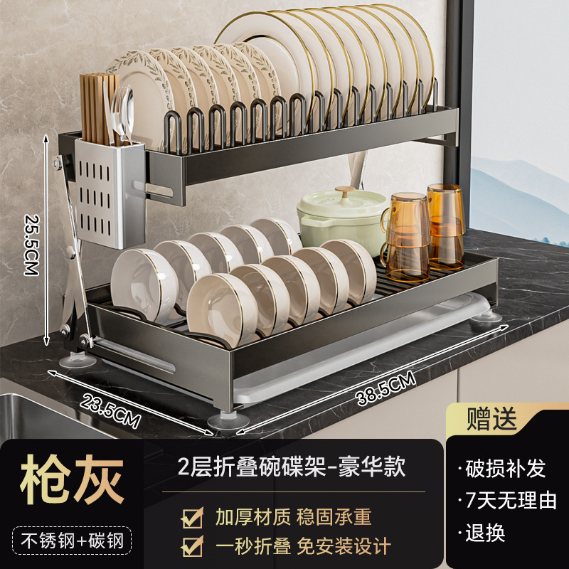 可折叠厨房碗碟架带筷子筒免安装沥水收纳架防滑脚垫置物