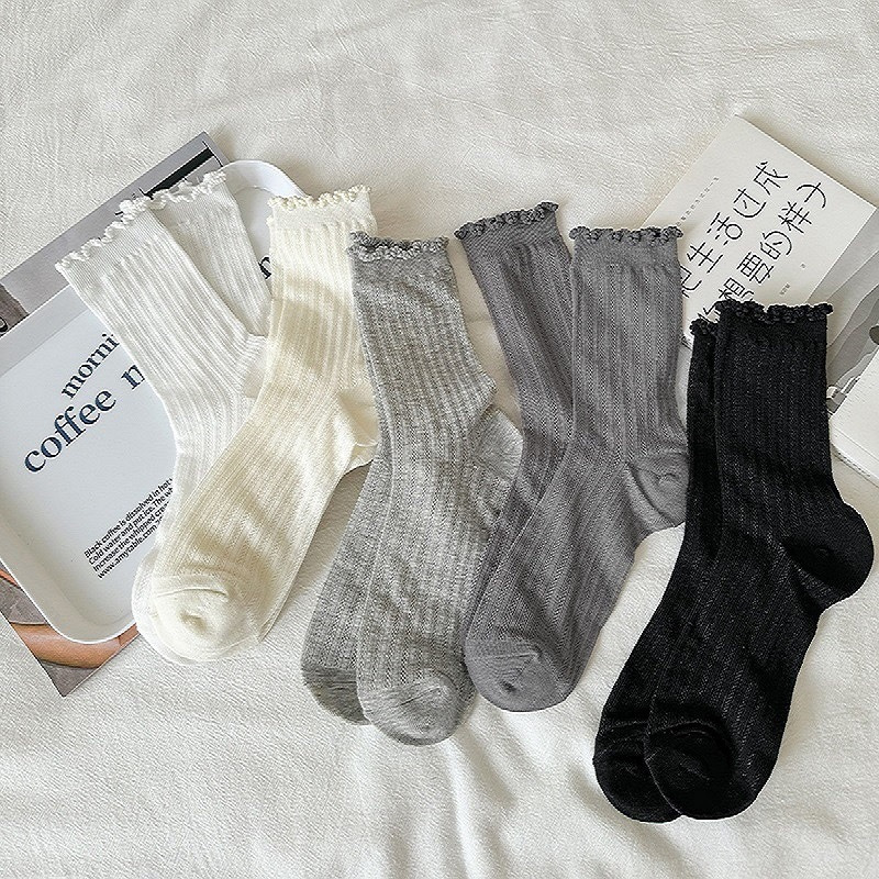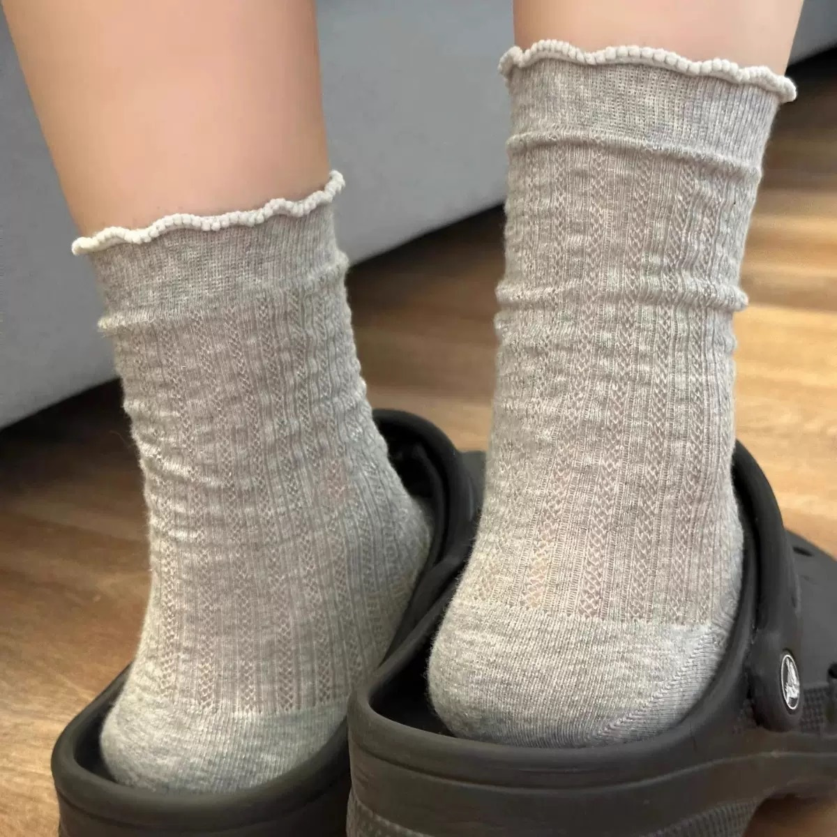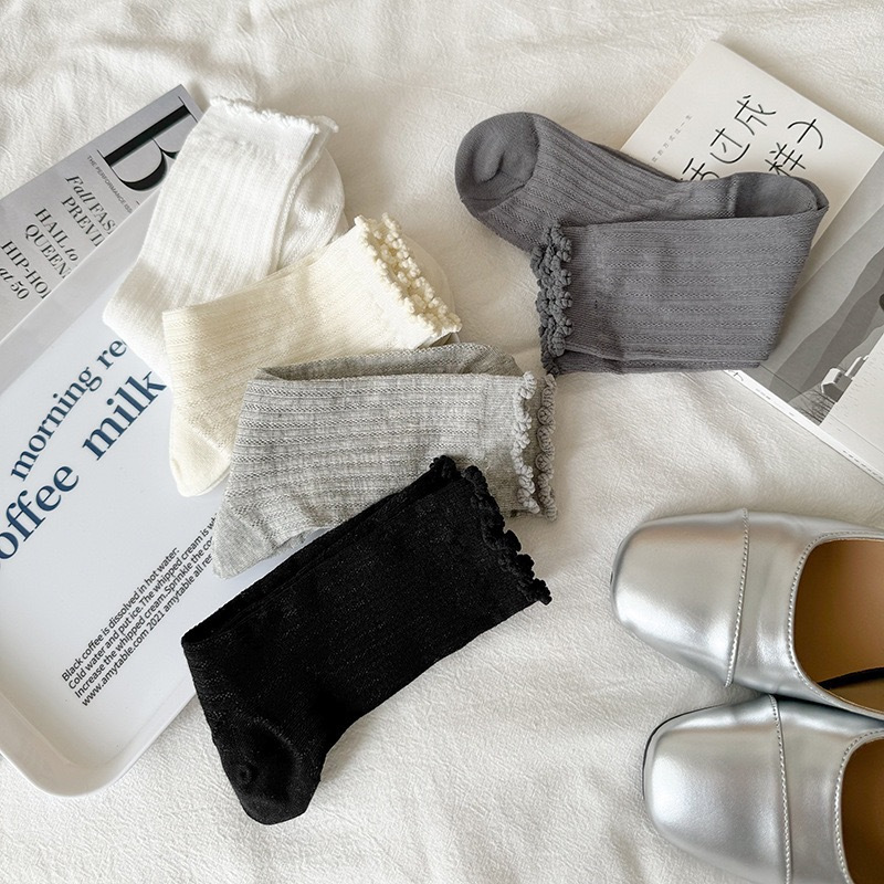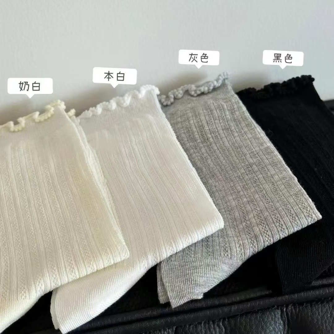 袜子女夏季薄款ins纯色花边中筒袜夏天女士吸汗透气堆堆袜百搭款