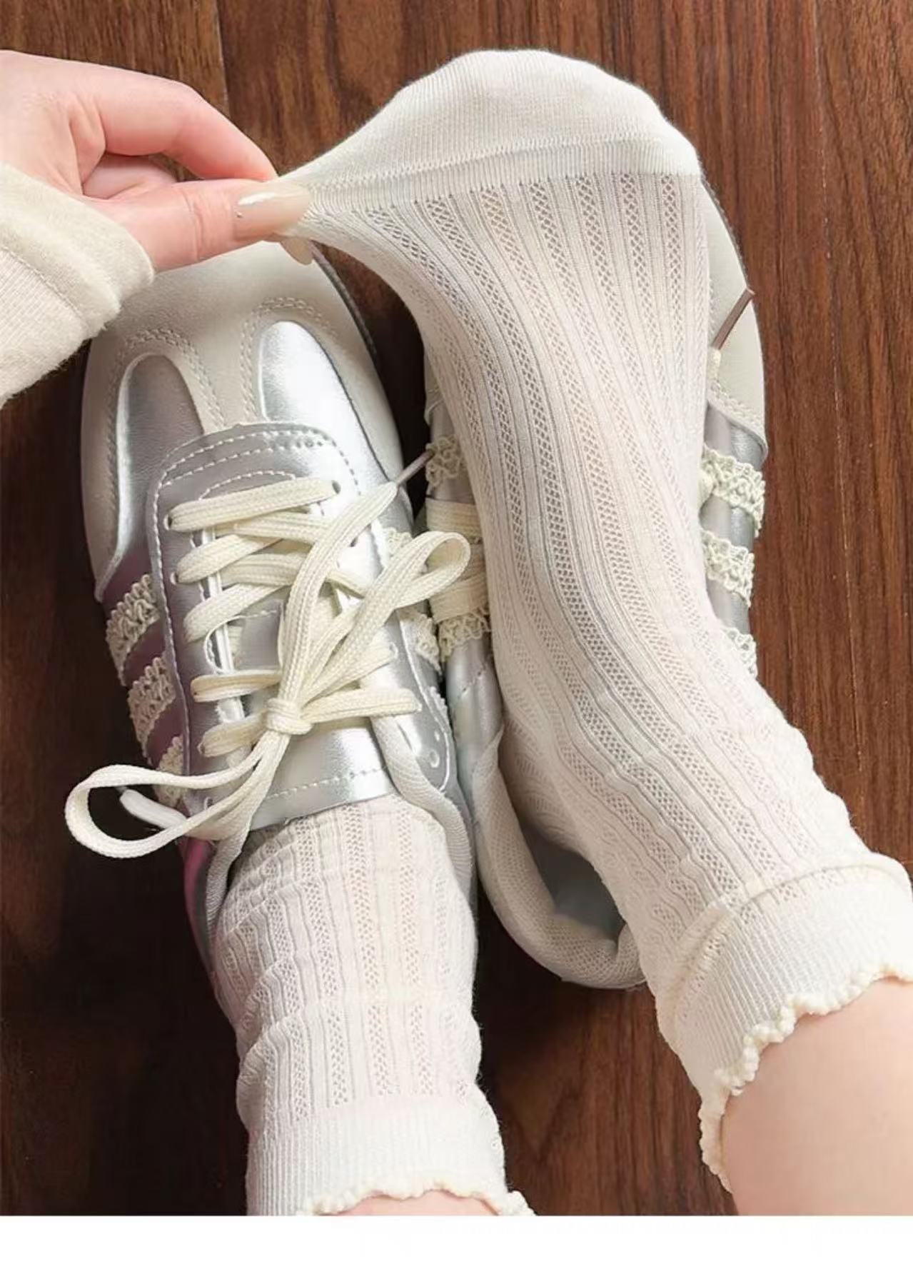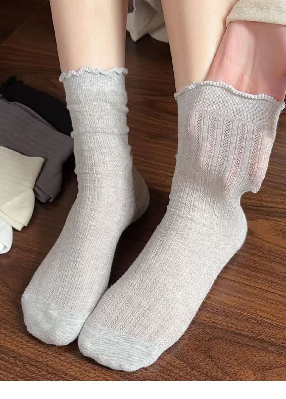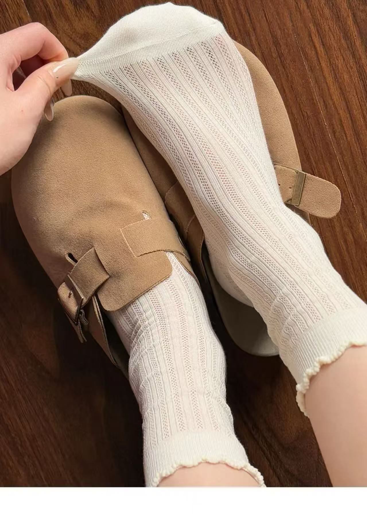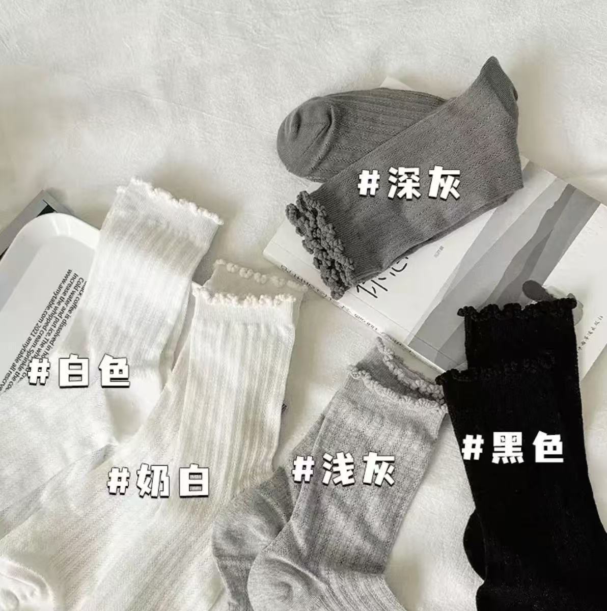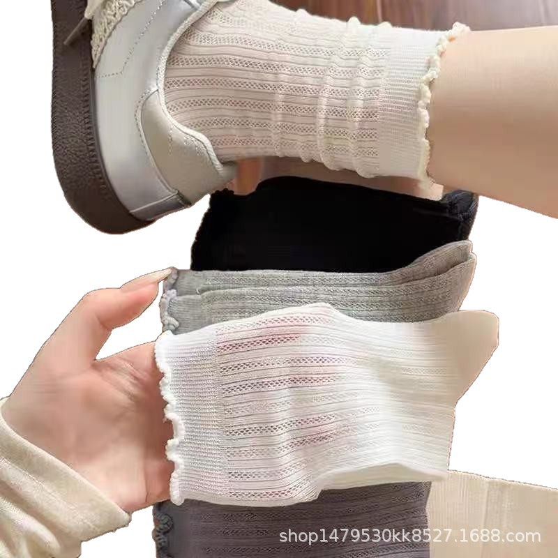 夏天薄款袜子女纯色镂空网眼中筒袜白色防臭透气少女花边堆堆袜棉