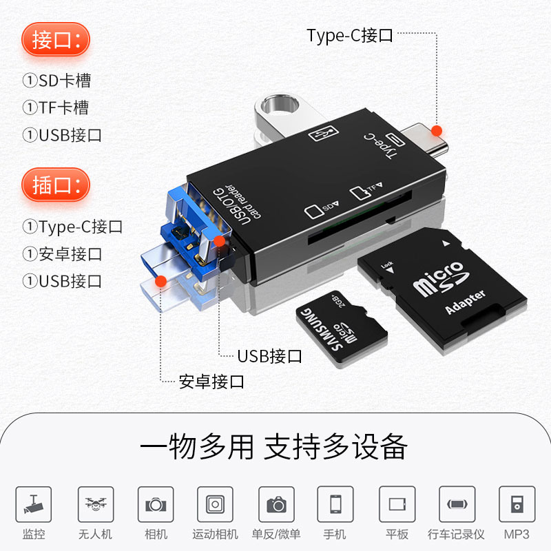 USB2.0读卡器type-c安卓手机电脑OTG2.0 SD/TF六合一多功能读卡器