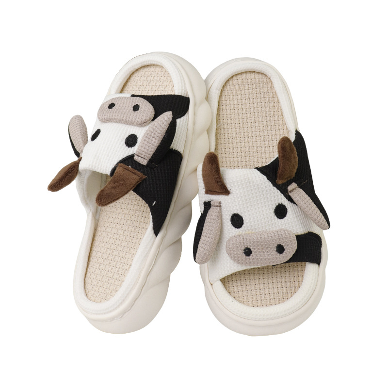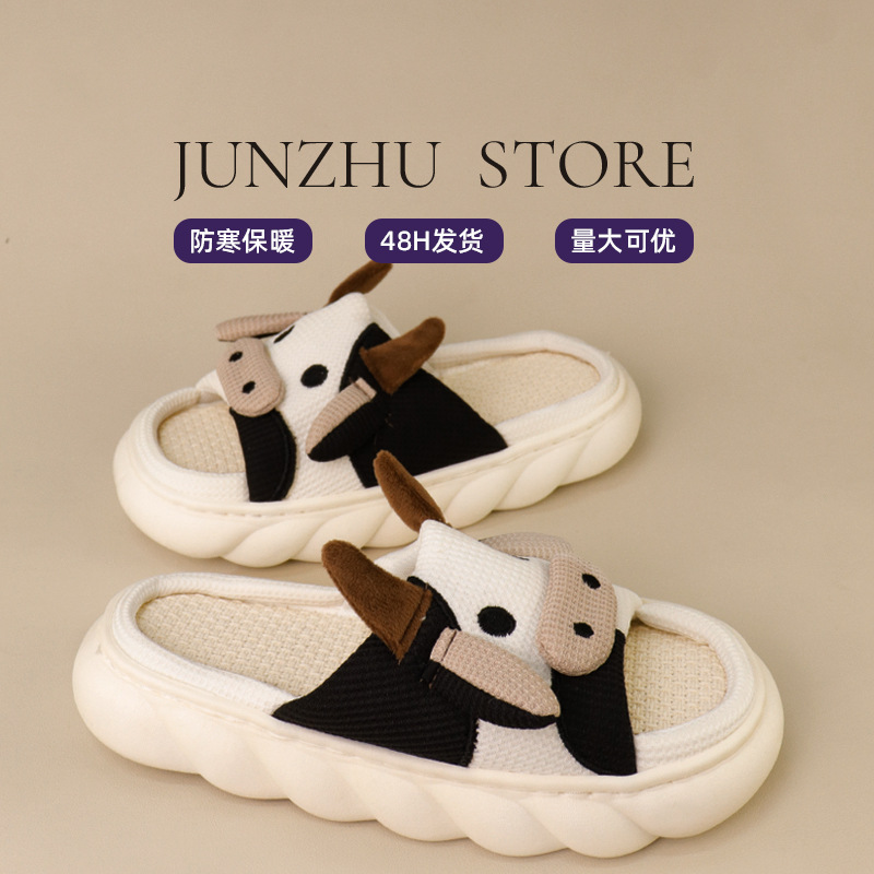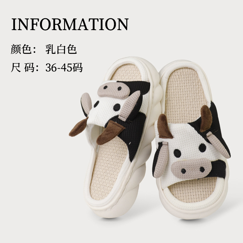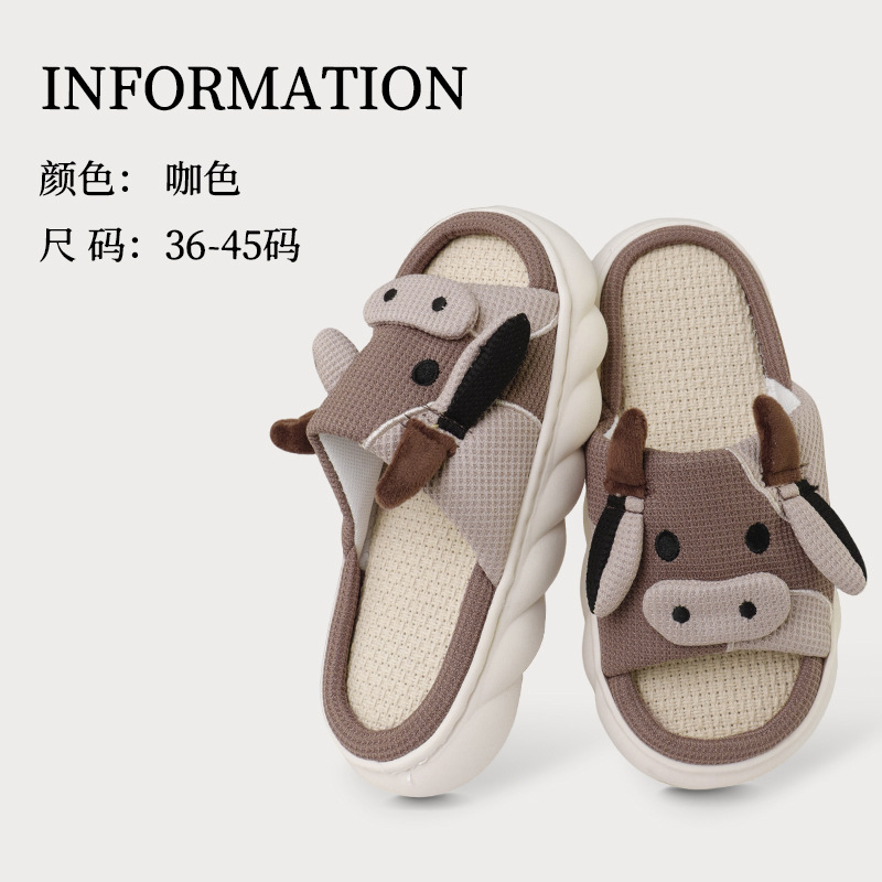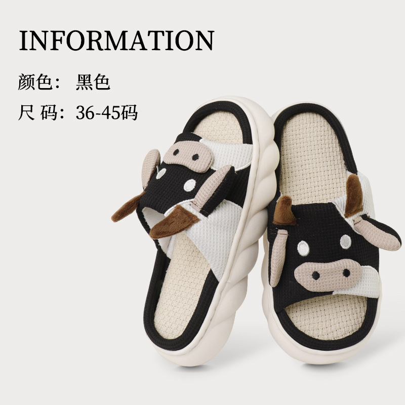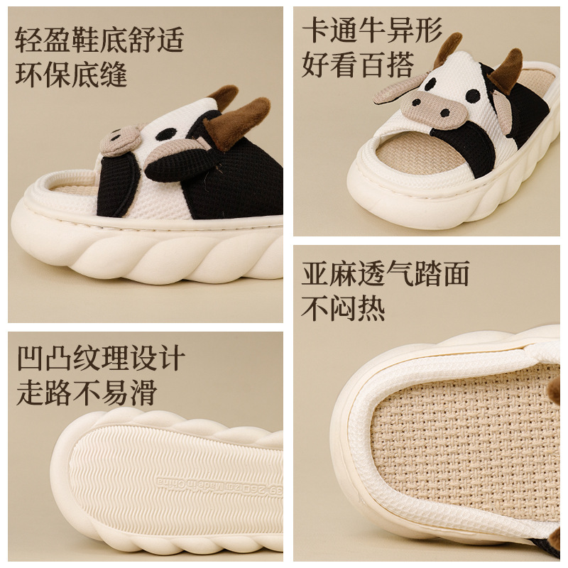 俊竹 可爱奶牛亚麻拖鞋女夏情侣居家防滑厚底踩屎感室内凉拖男