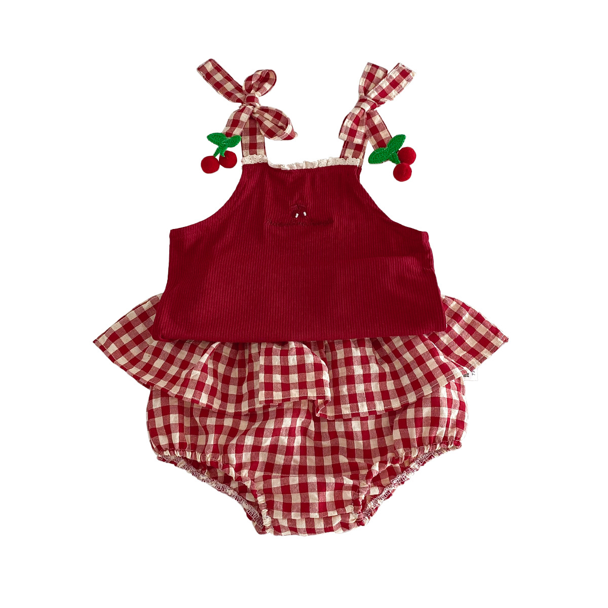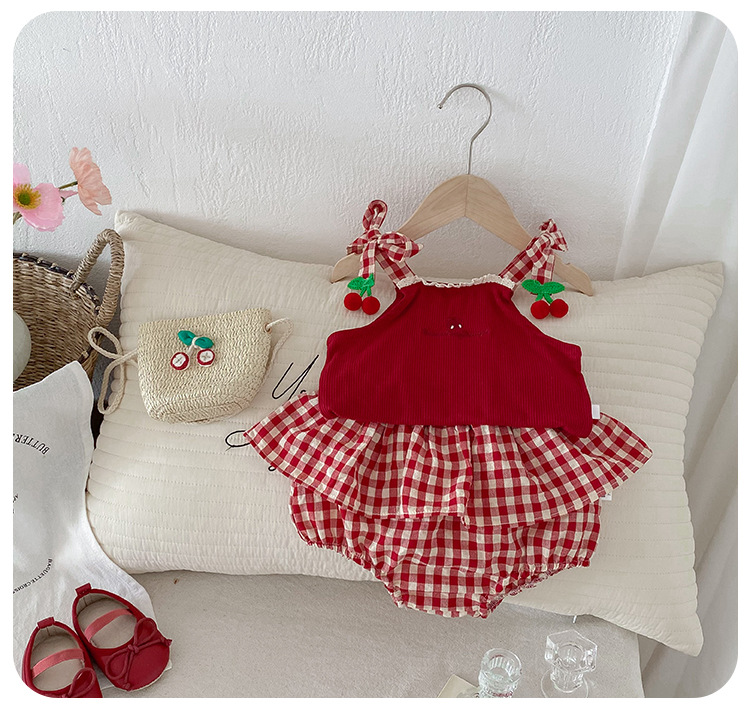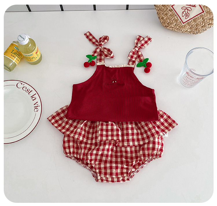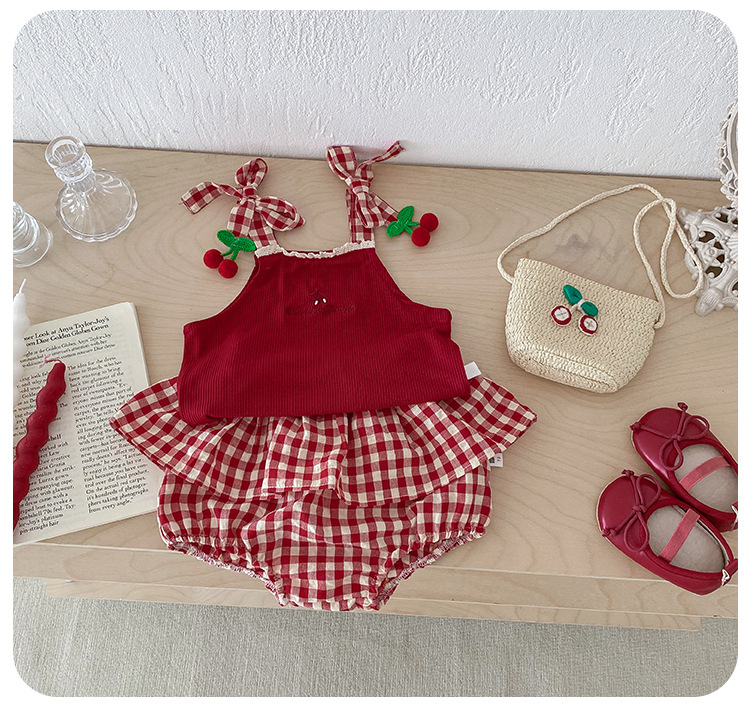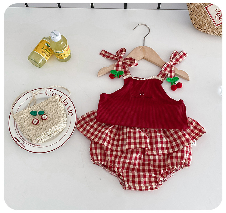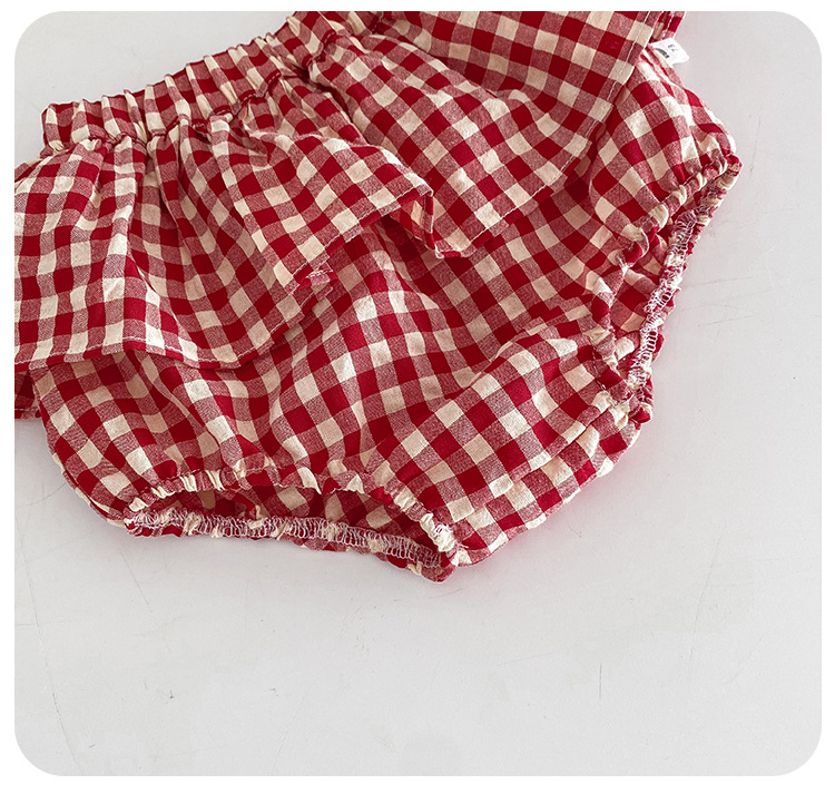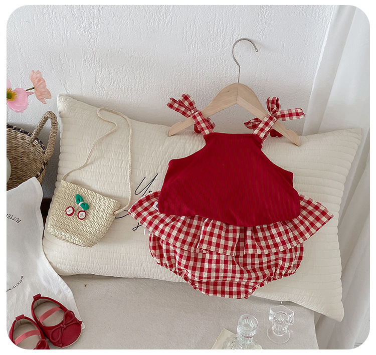婴儿衣服夏装女宝宝套装超萌夏季吊带上衣格子包屁短裤三件套薄款