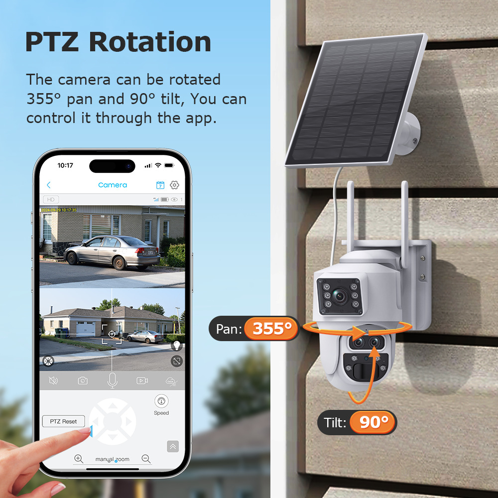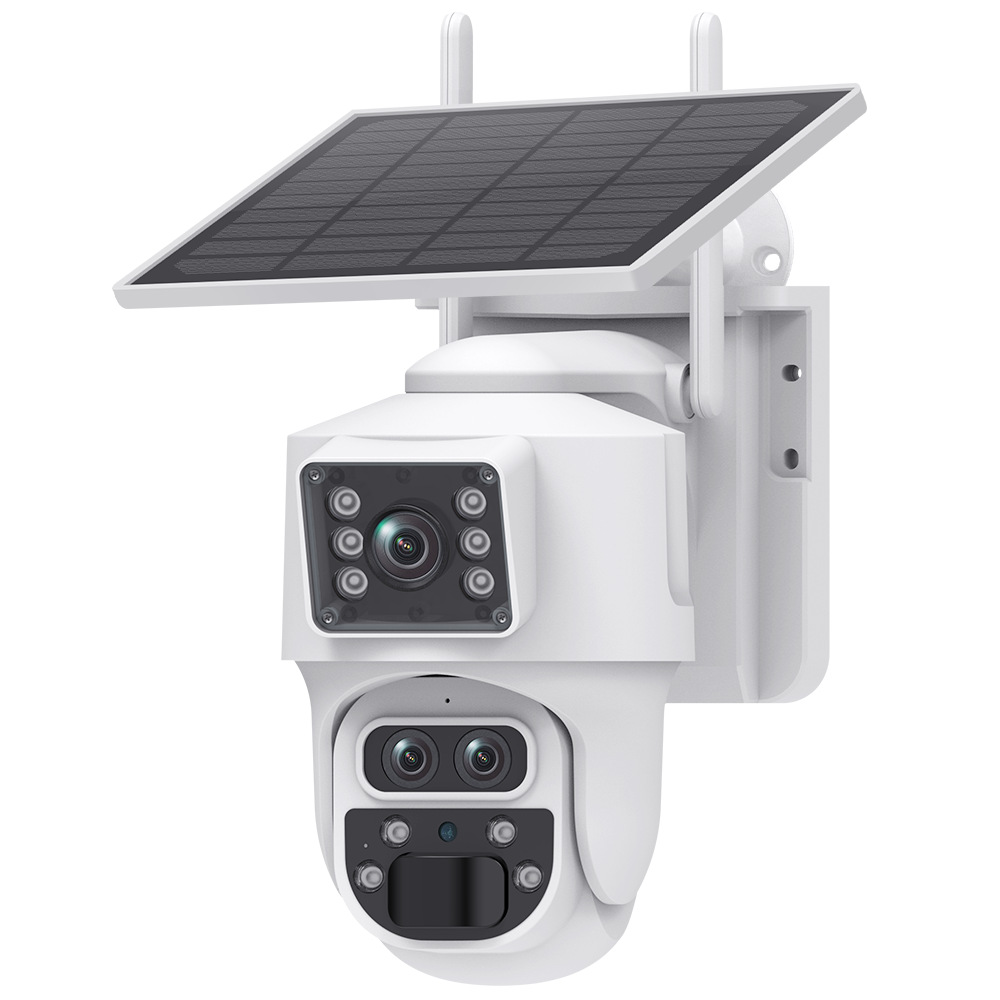 跨境新款三目太阳能摄像头6MP无线高清15X变焦双画面wifi摄像头