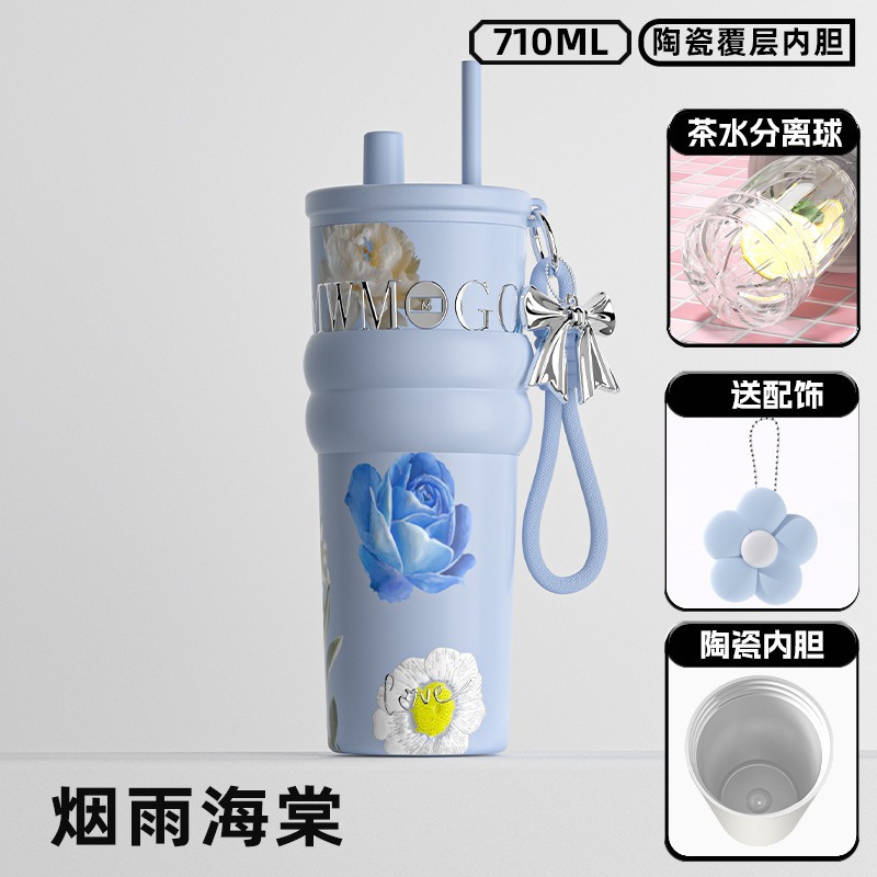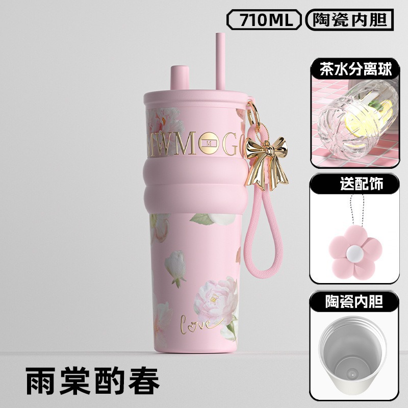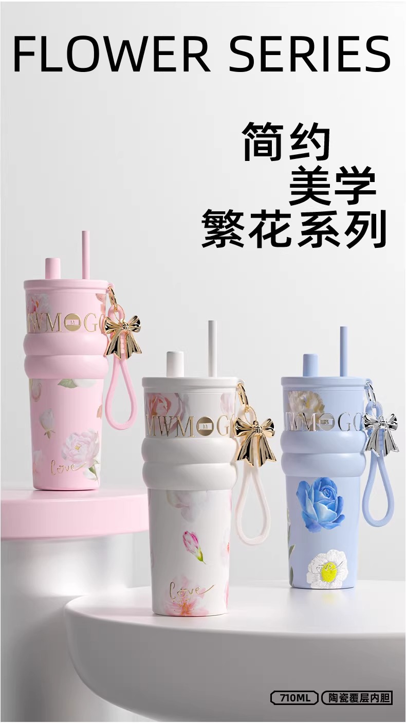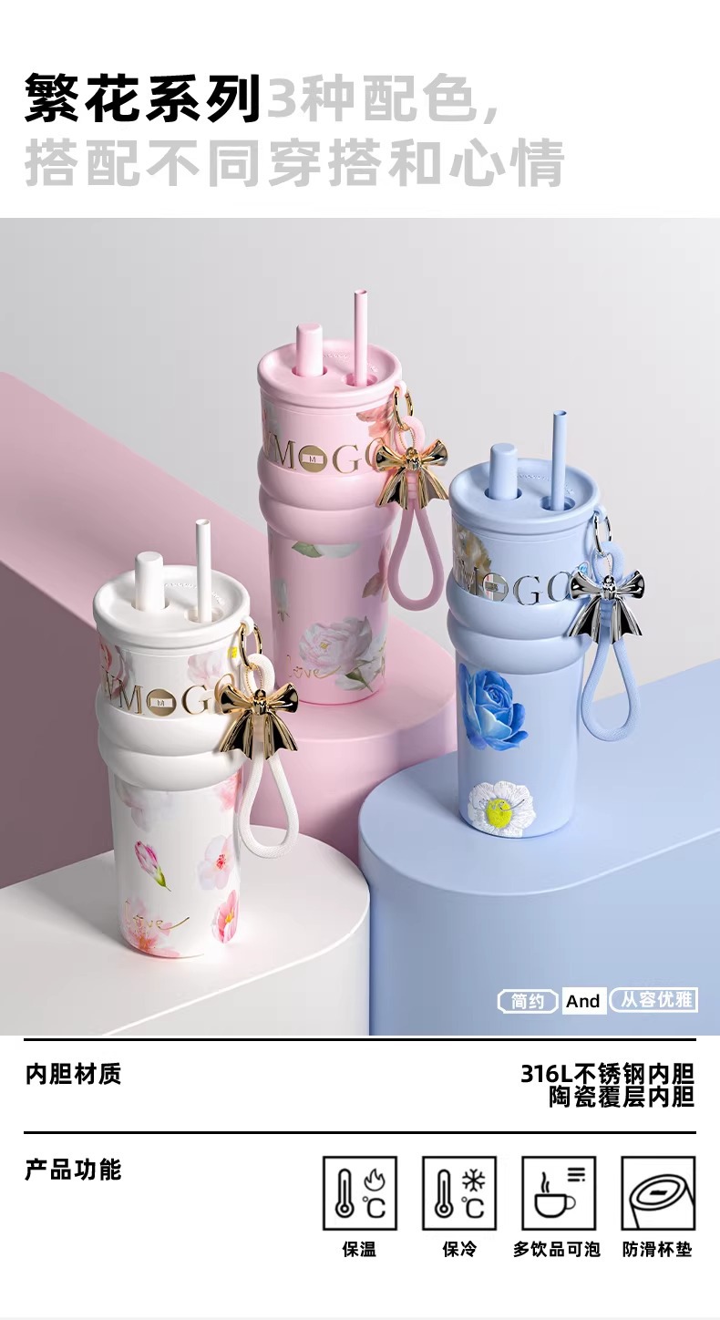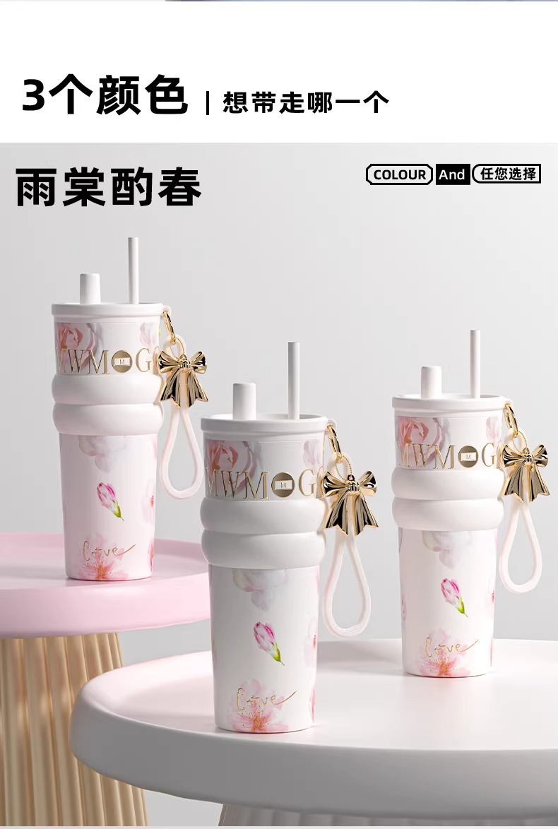 繁花高颜值吸管保温杯大容量女生外出便携杯子车载陶瓷内胆水杯