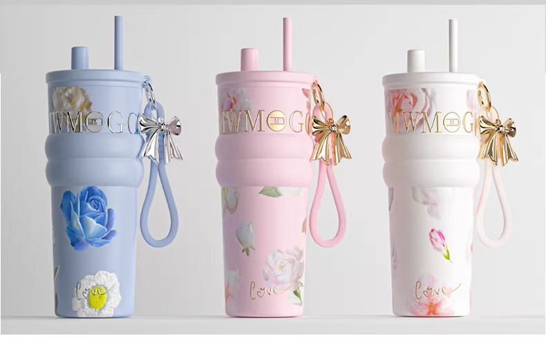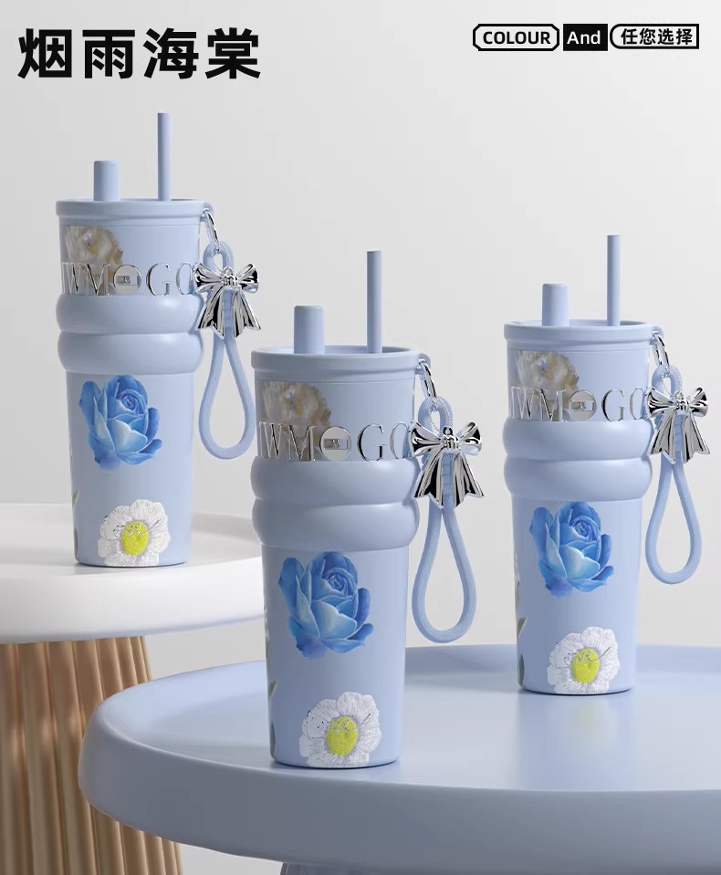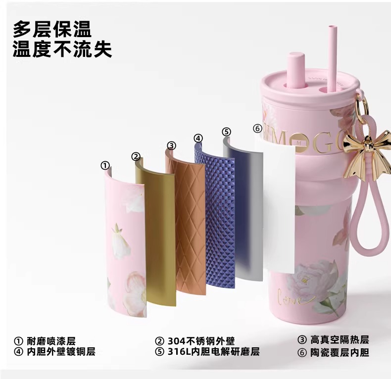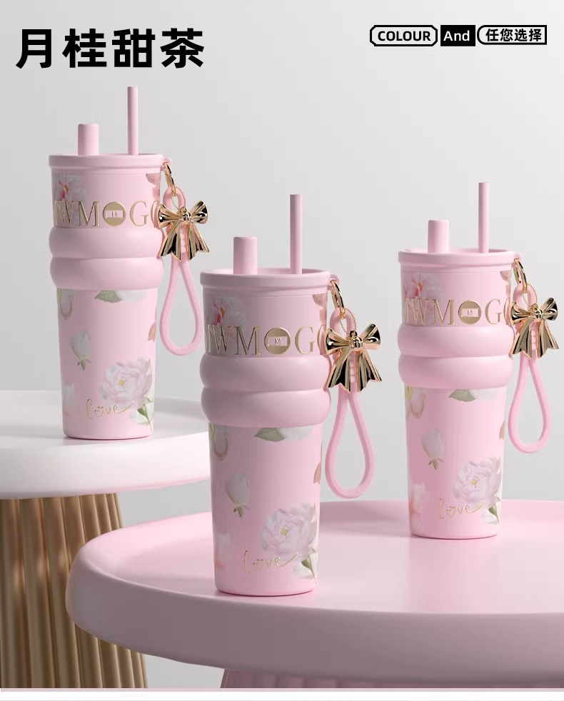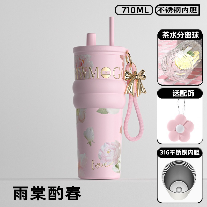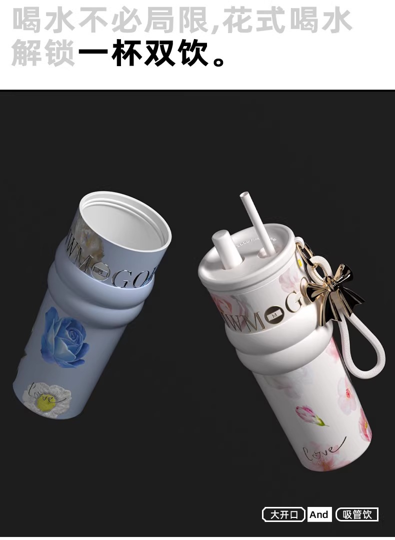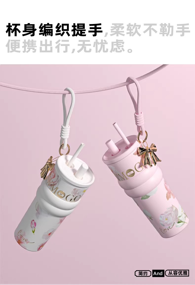 繁花高颜值吸管保温杯大容量女生外出便携杯子车载陶瓷内胆水杯