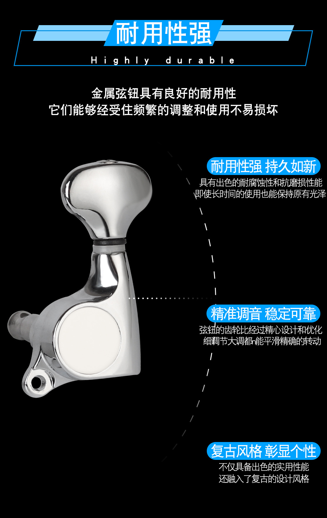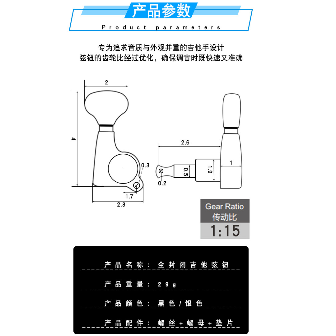 吉他弦钮旋钮小鱼尾弦轴银色电木民谣吉他弦扭上弦器调配件送工具
