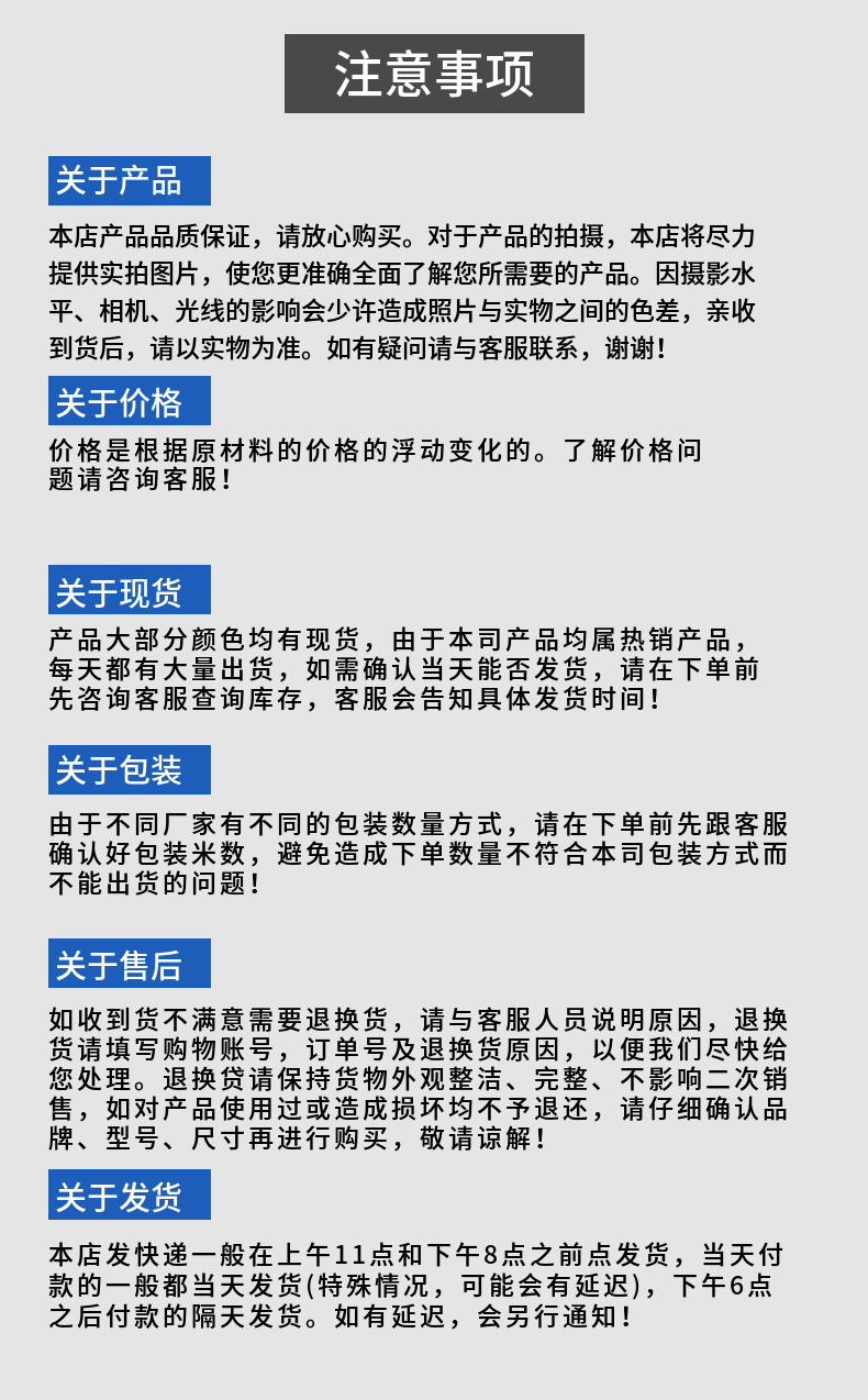 小本经营,利润微薄,售出产品出现破损,可拍照,联系客服进行售后处理。由于款式太多,可能会出现个别款缺货,如有缺货,当联系不上客户,我们会发有货的先,缺货联系客服退款,本店不支持以任何质量不好、卖不了等各种理由来退货。注意7天无理由只对单个自用客户有效,批发看样客户不享受7天无理由,谢谢配合。小店价格不包含开票,如需开票、定制请 联系 经理微信