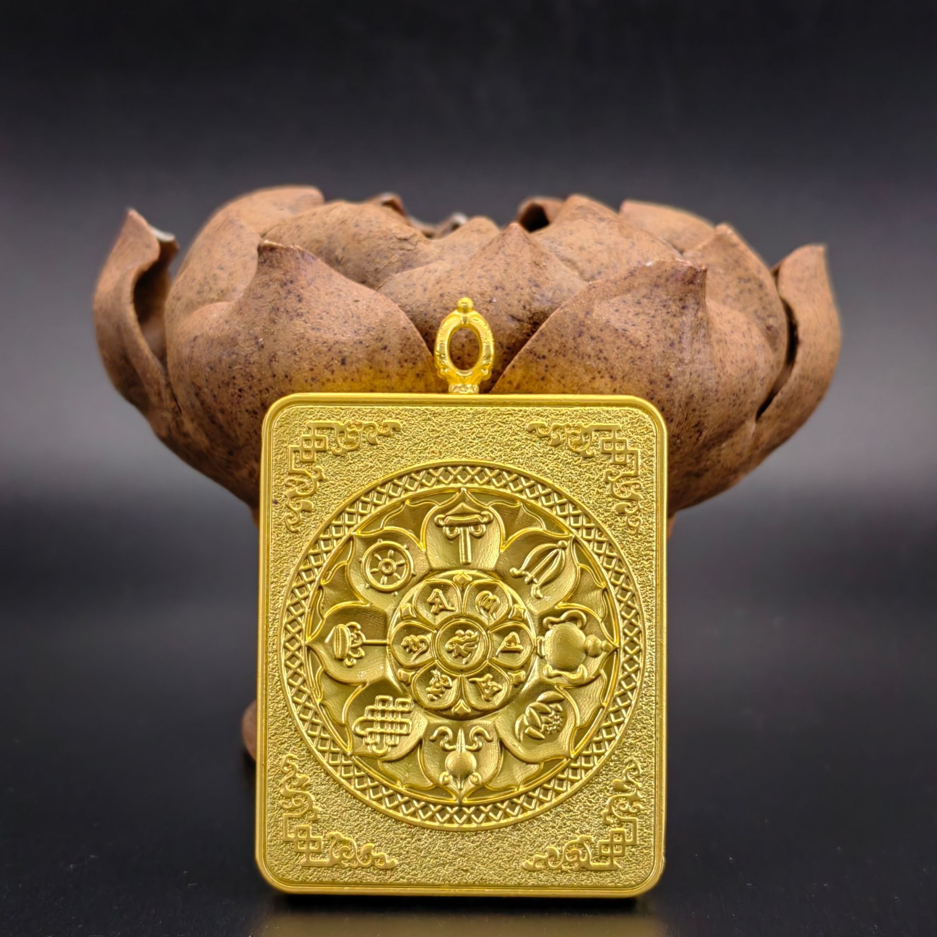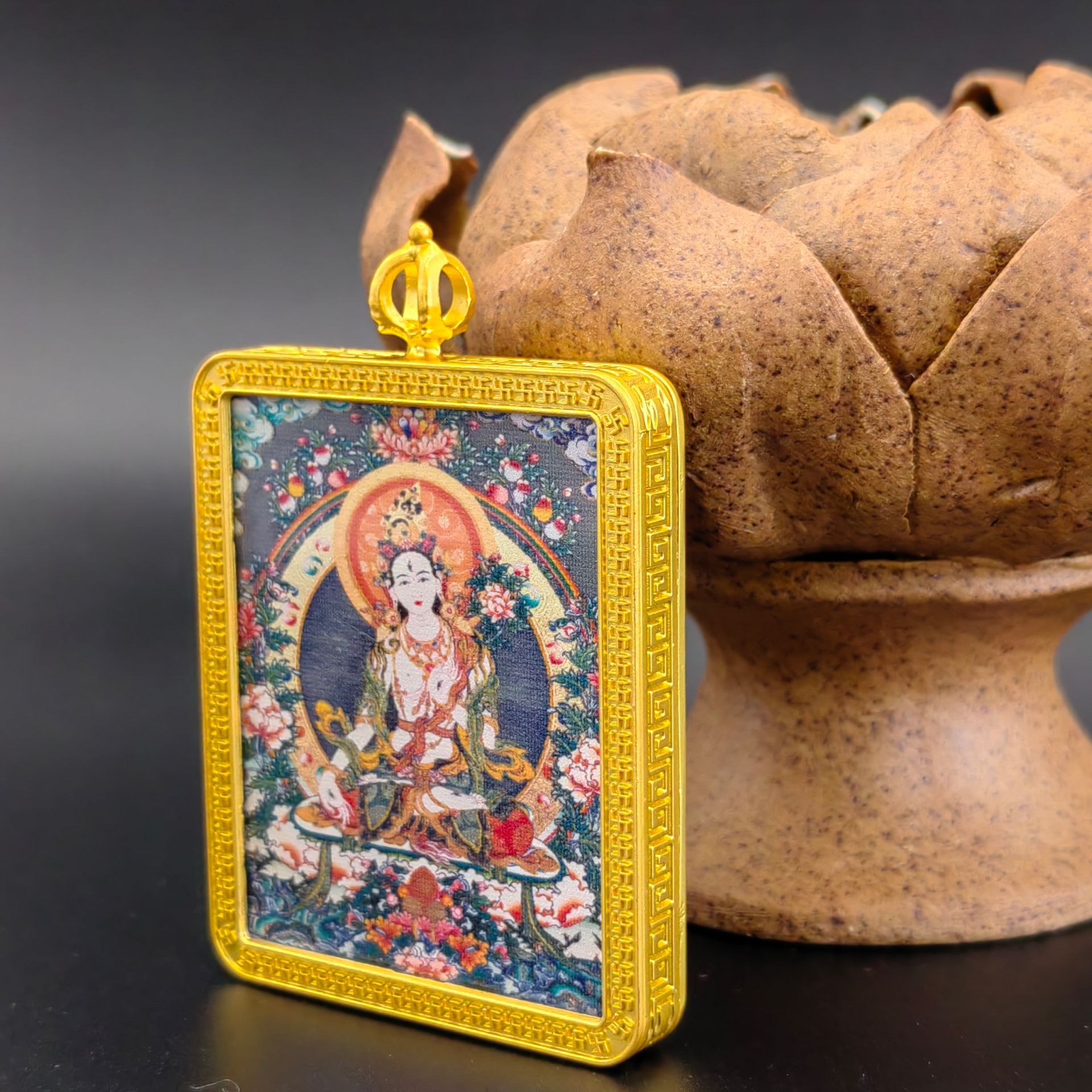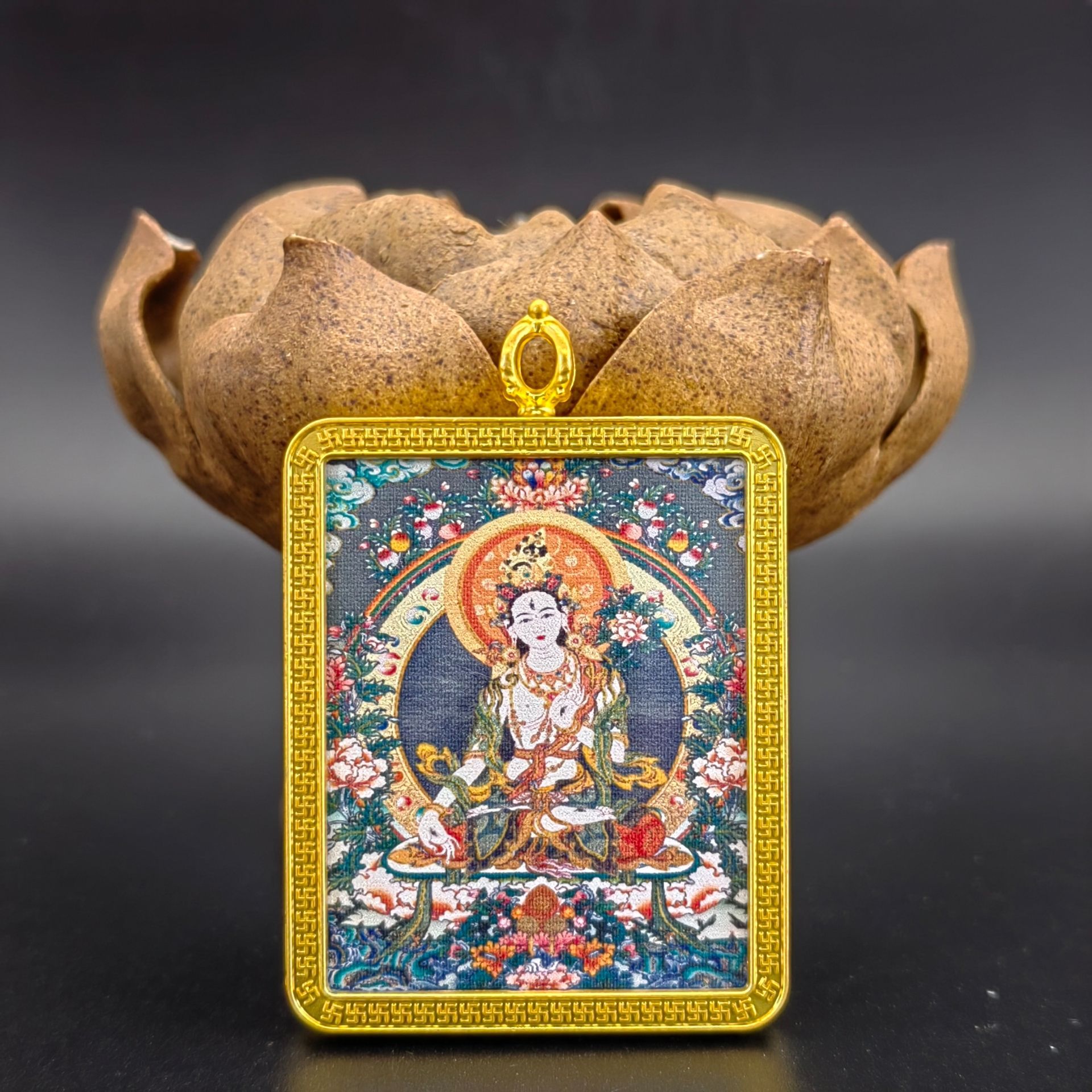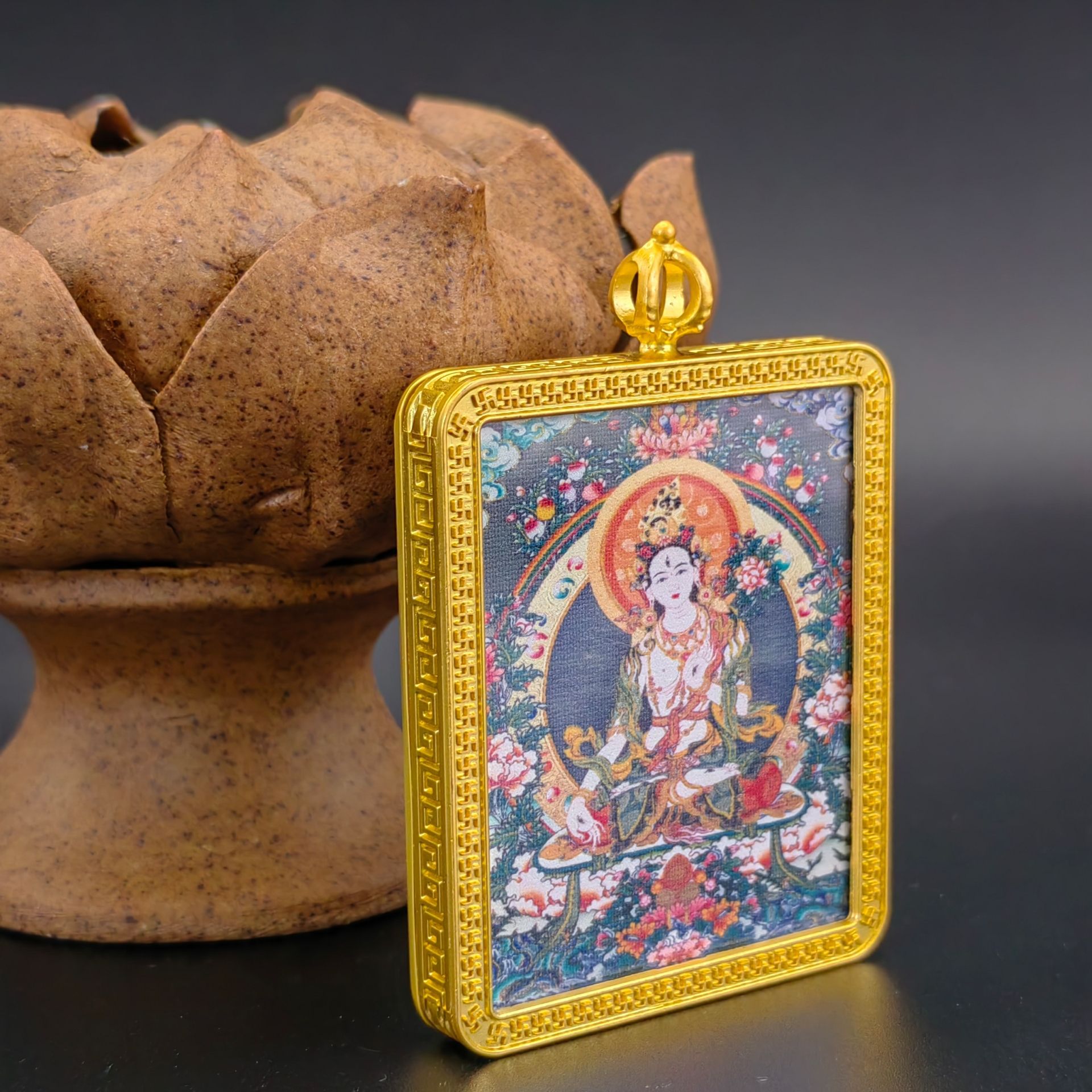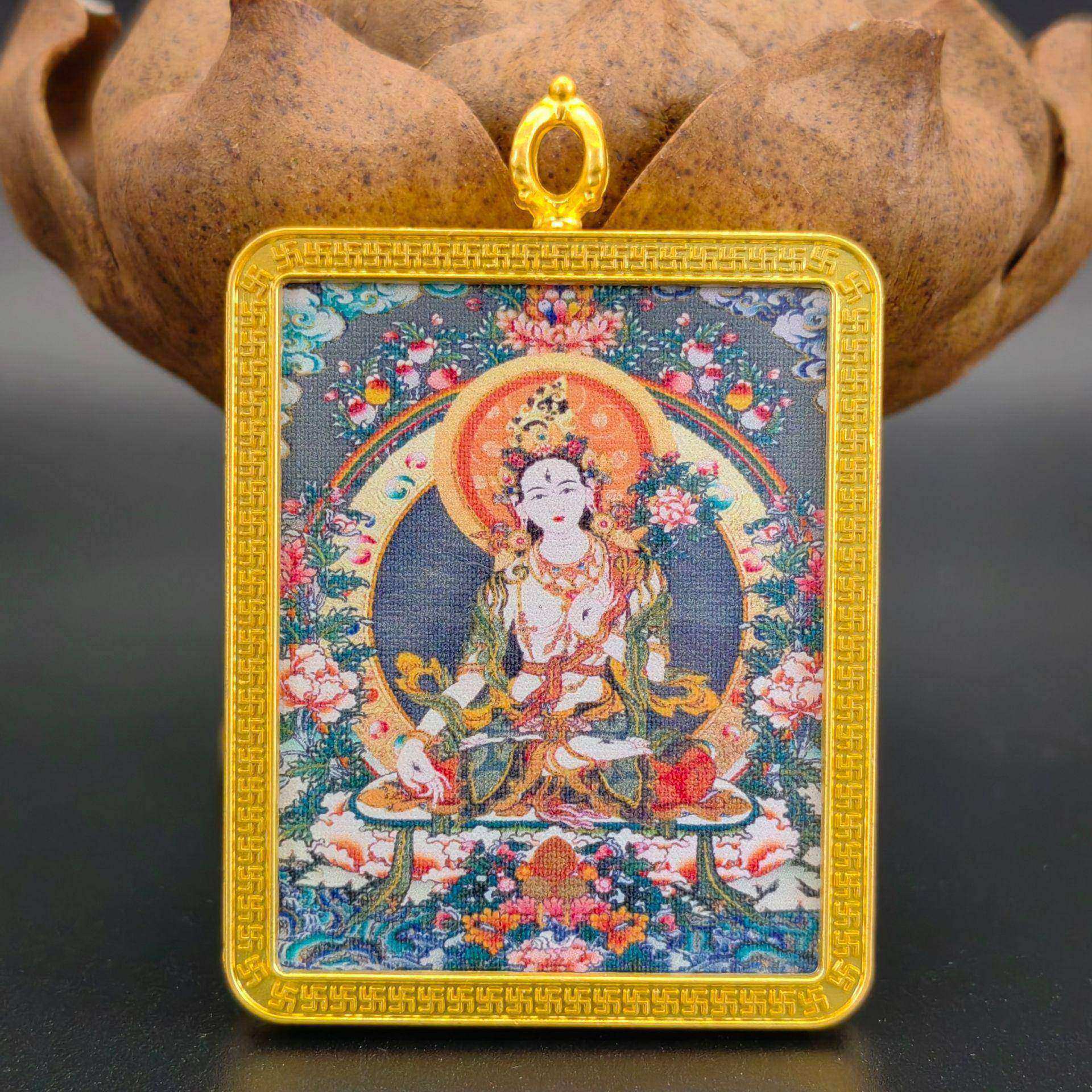 单面描金白度母4x5八宝莲花万字壳唐卡吊坠立体项链饰品装饰礼品