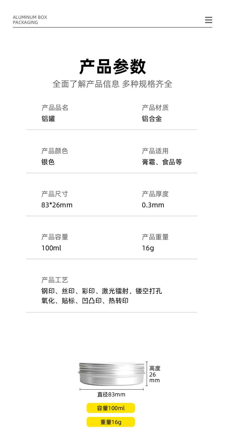 爆款现货批发圆形螺纹铝盒100克83*26系列 茶叶罐蜡烛罐化妆品