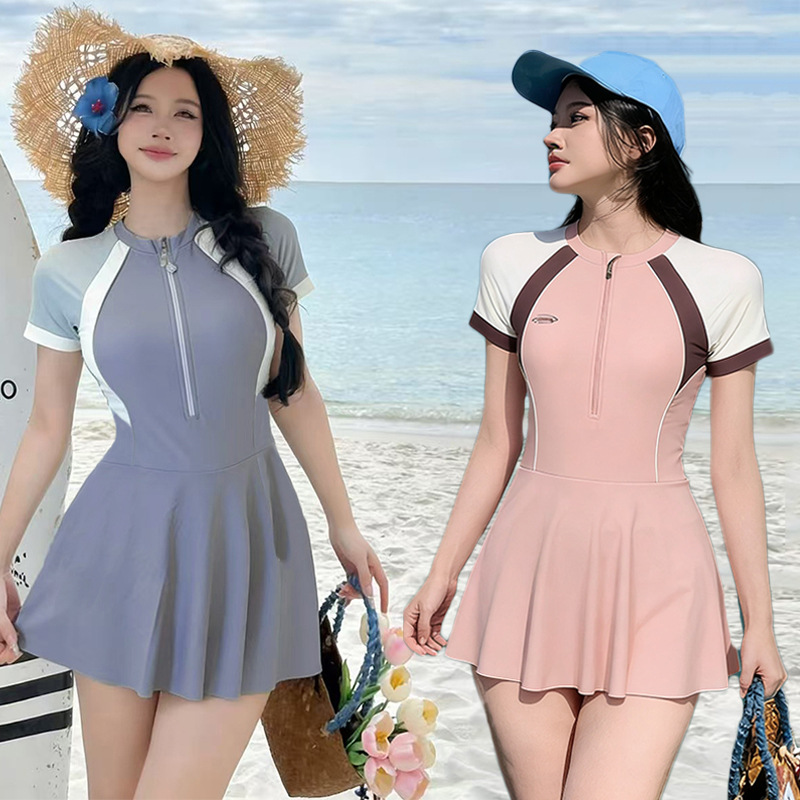 大码泳衣女款连体裙式韩版休闲运动拼色学生保守显瘦遮肚温泉泳衣