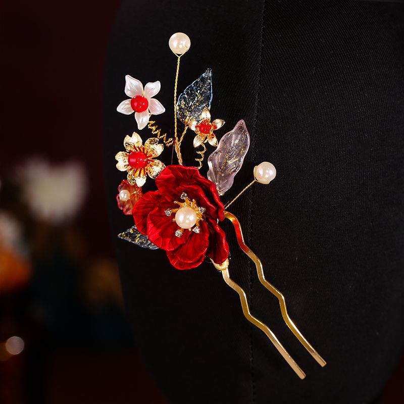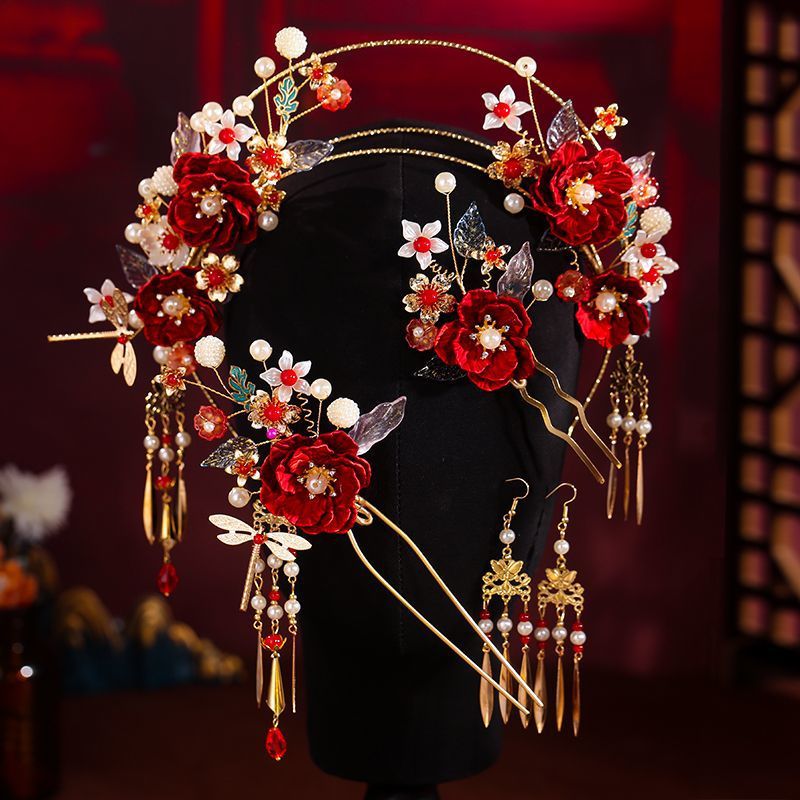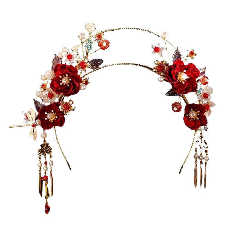 新中式头饰古风秀禾服秀禾汉服流苏发饰新娘头饰发簪红色旗袍配饰