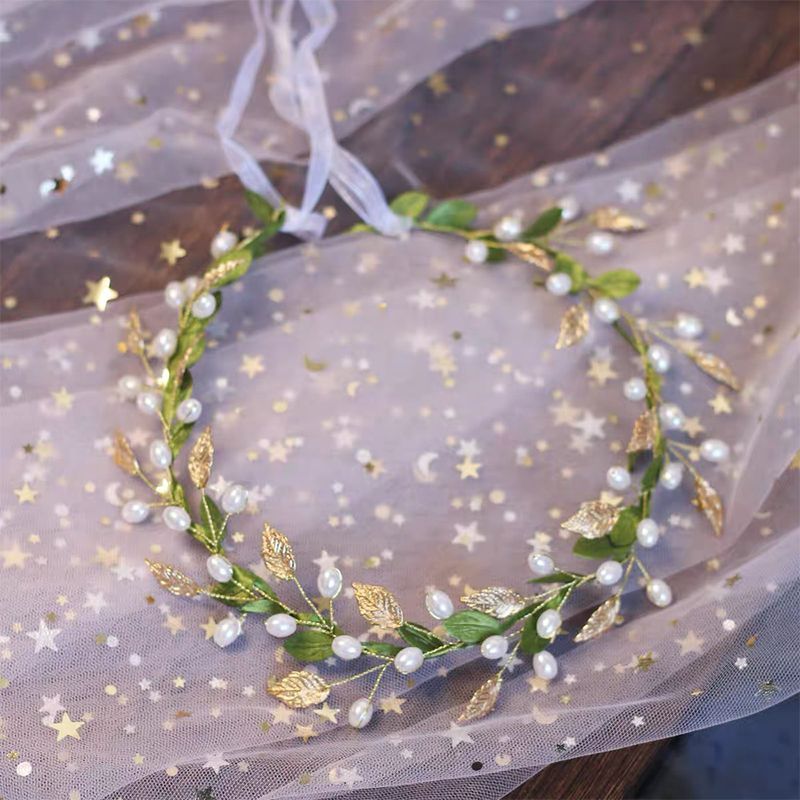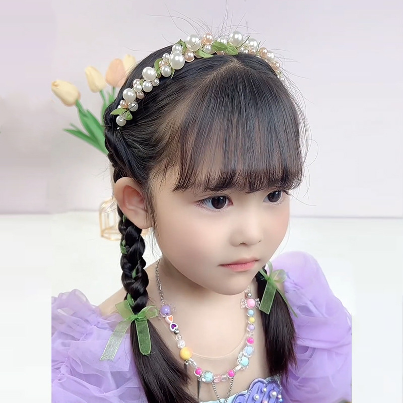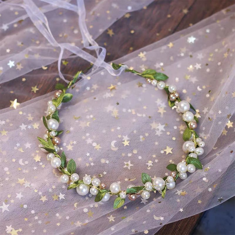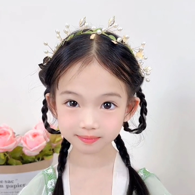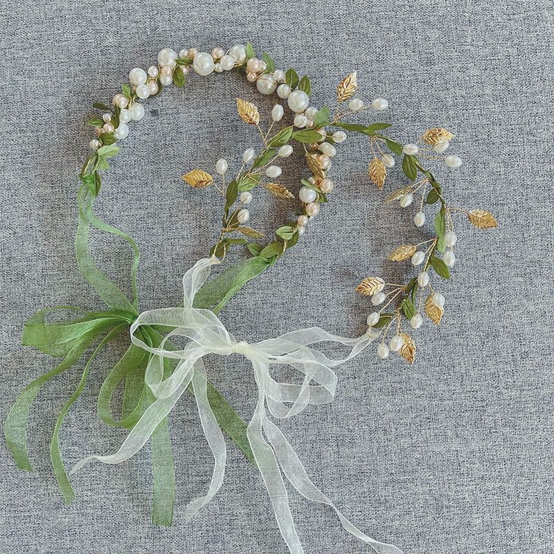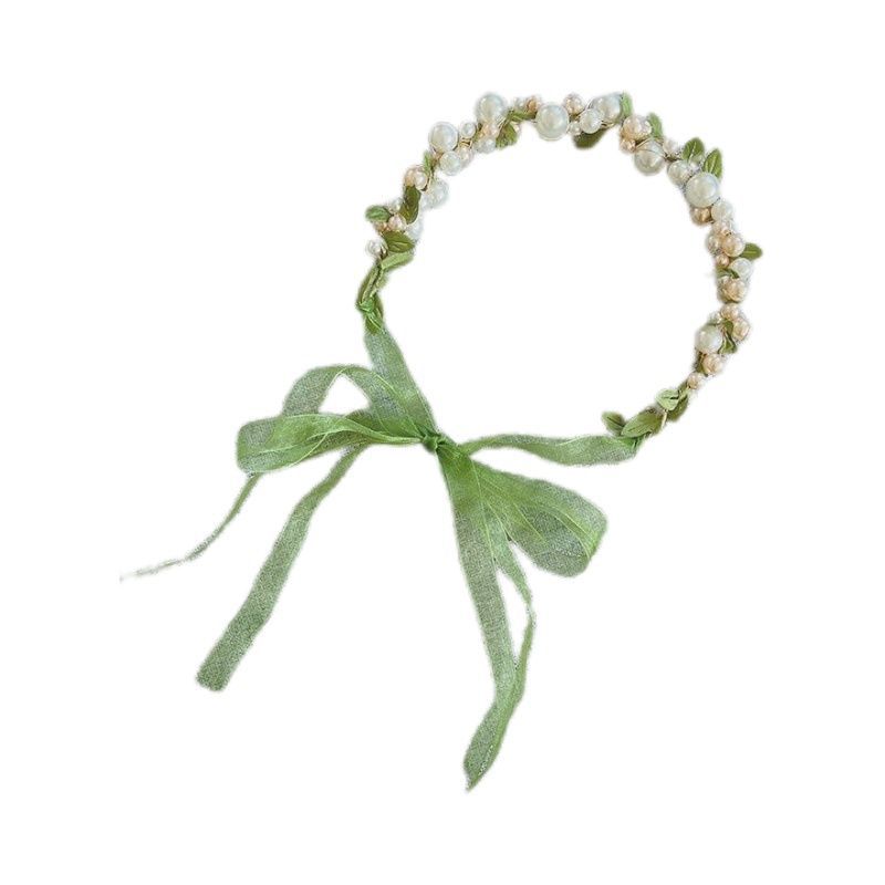 女童气质森系绿叶珍珠花环发带雪纱带编发发饰清新绿色系发箍头箍