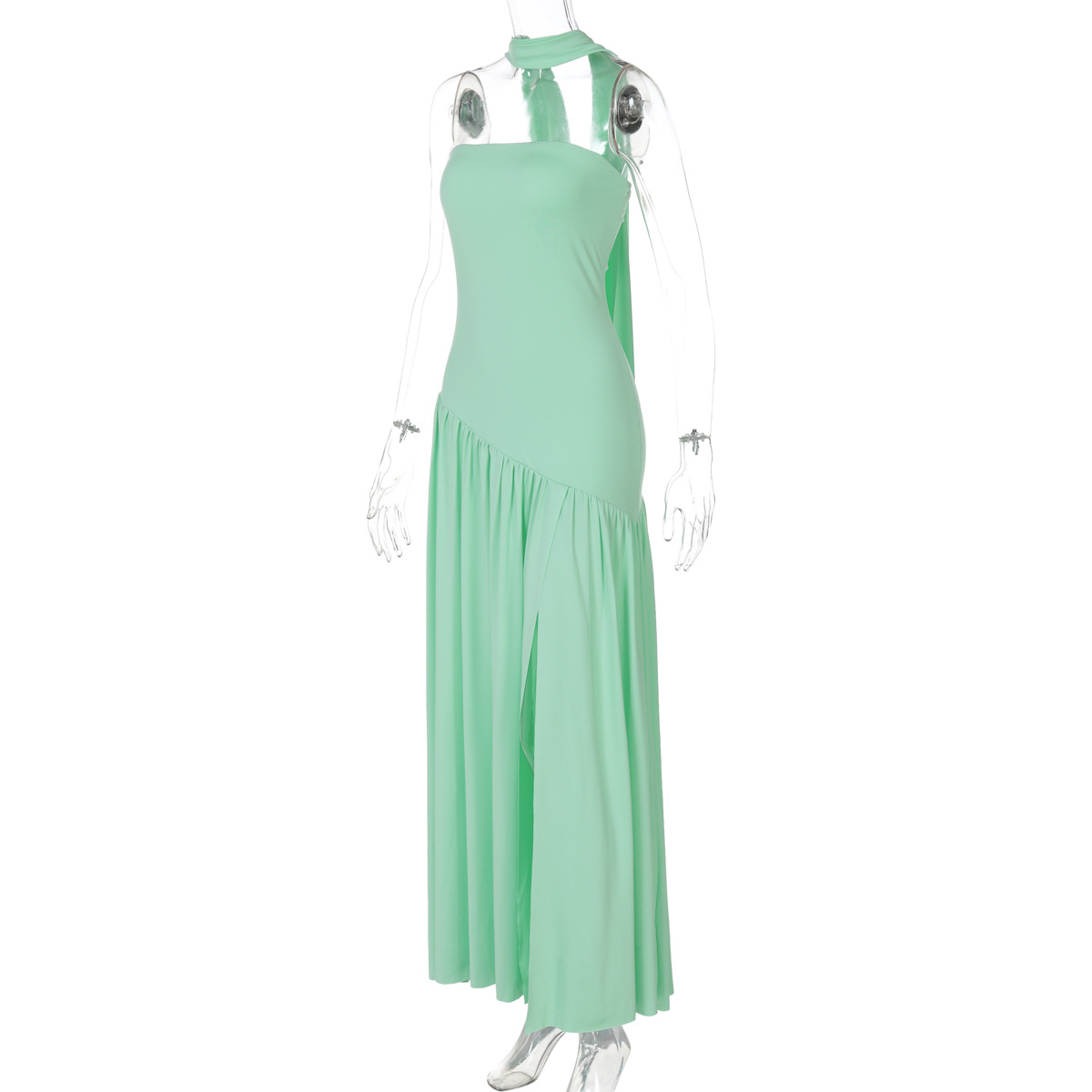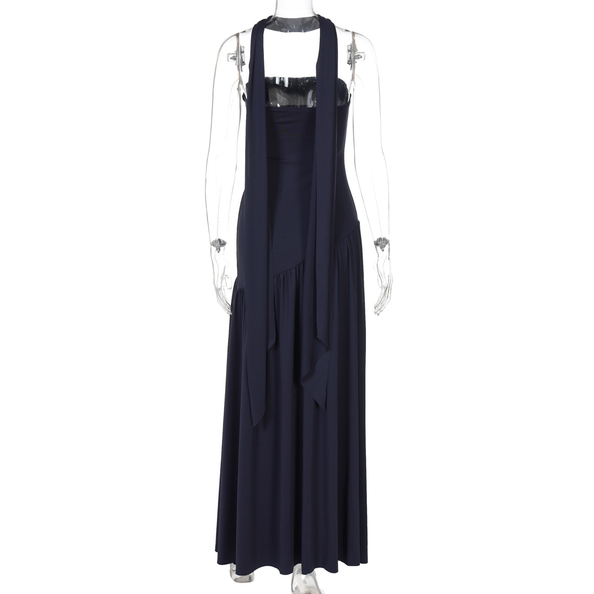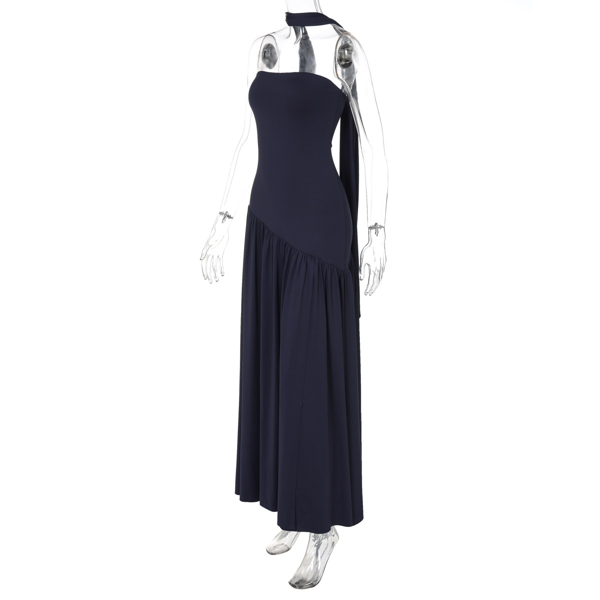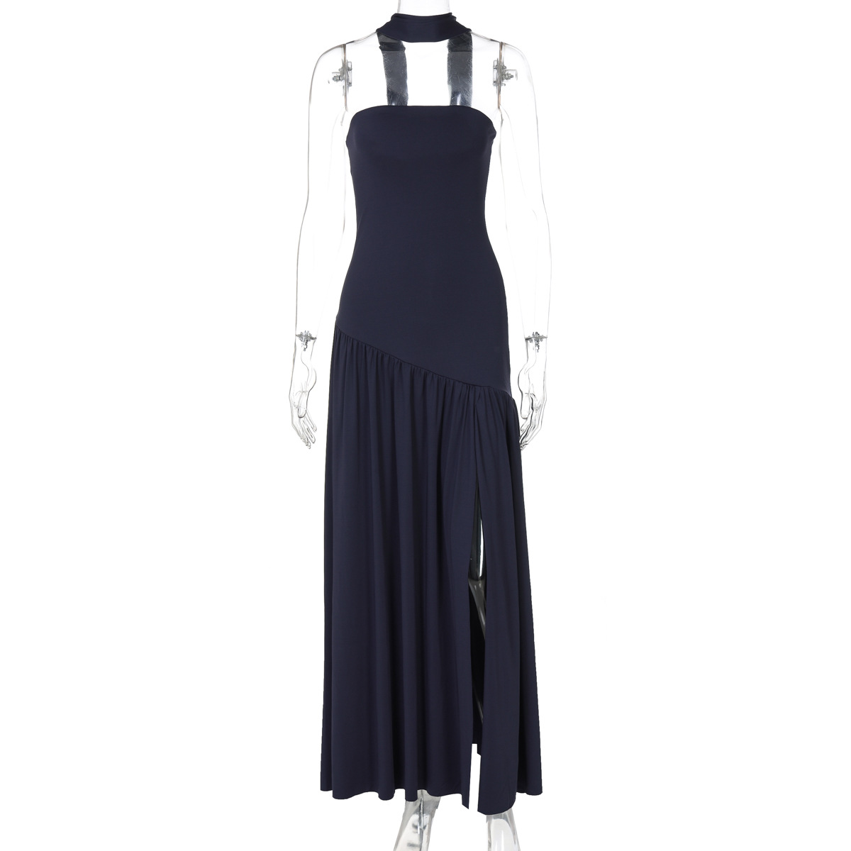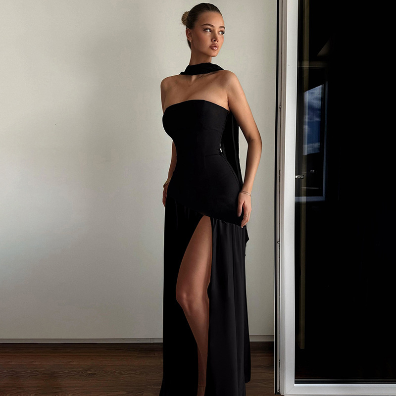 欧美跨境新款女装时尚气质抹胸修身纯色开叉露背优雅飘带连衣裙女