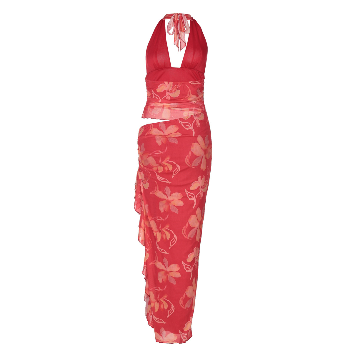 亚马逊跨境新款女装性感深V裹胸拼接露腰长款木耳边挂脖连衣裙女