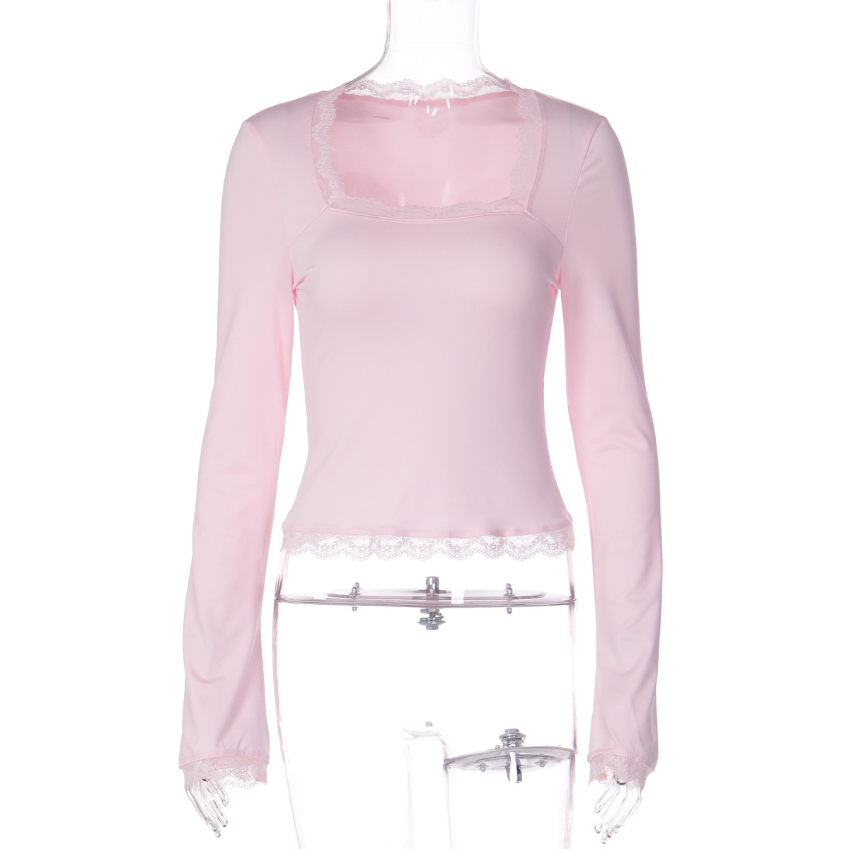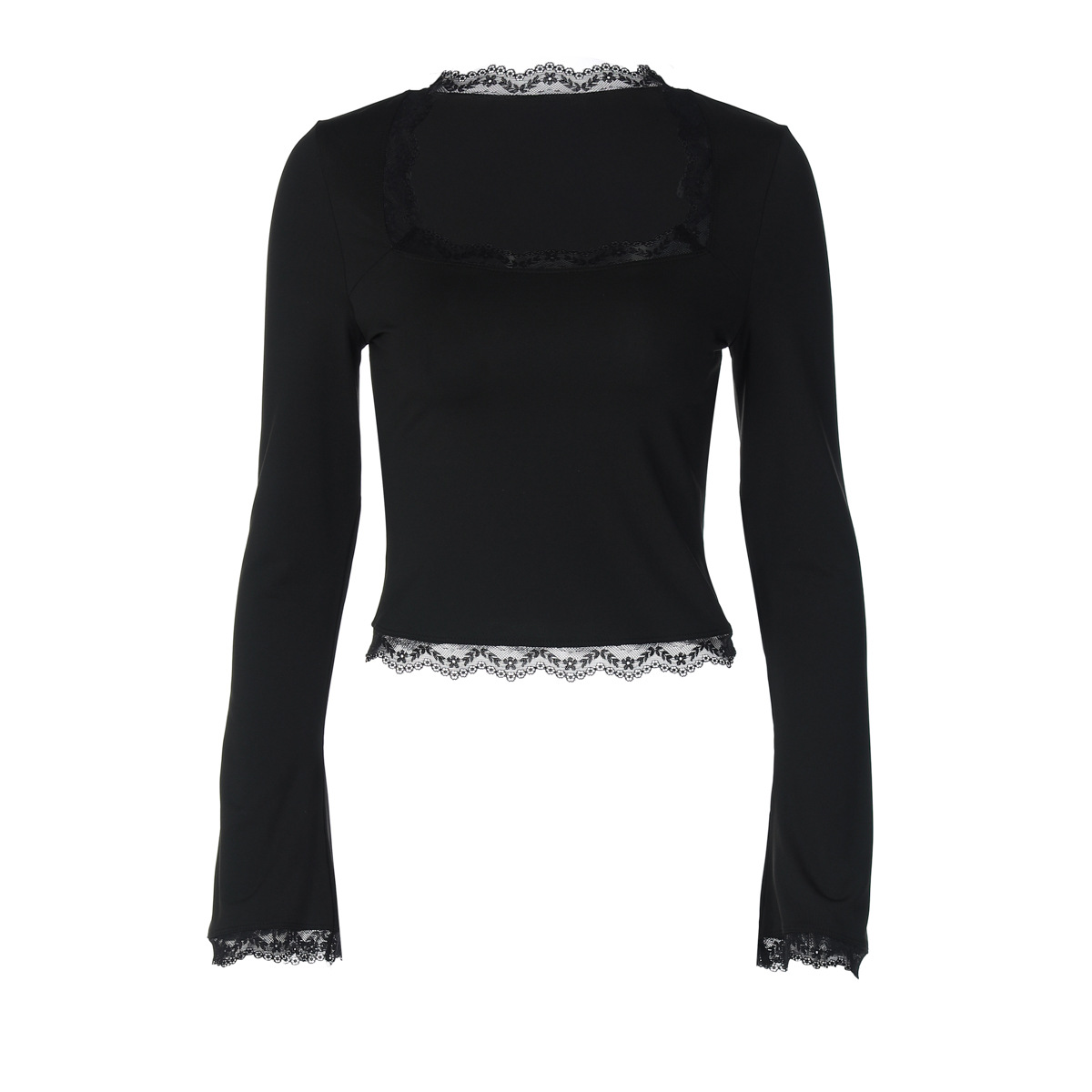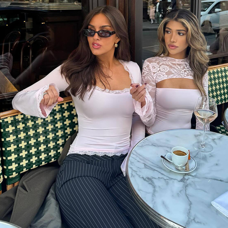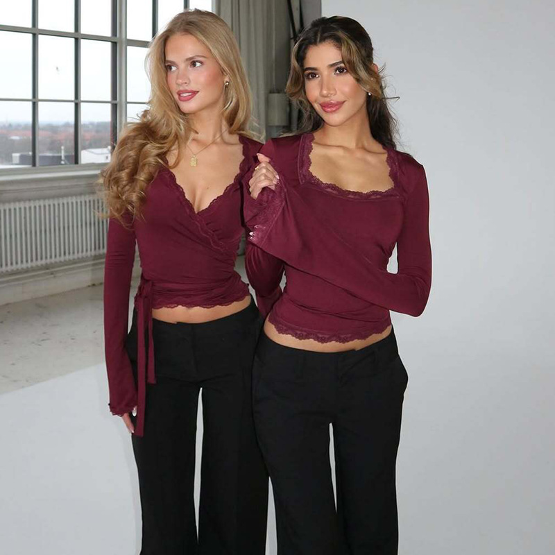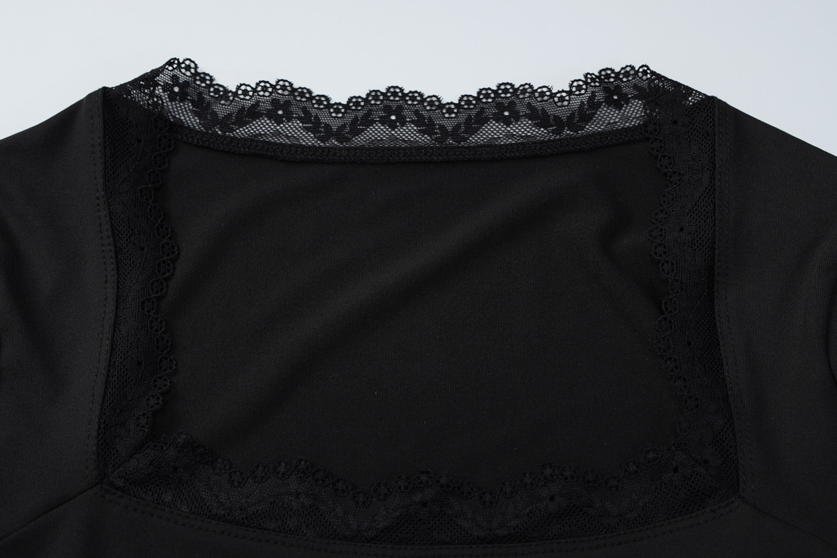 亚马逊跨境欧美新款时尚蕾丝边方领长袖修身百搭女装上衣外贸批发